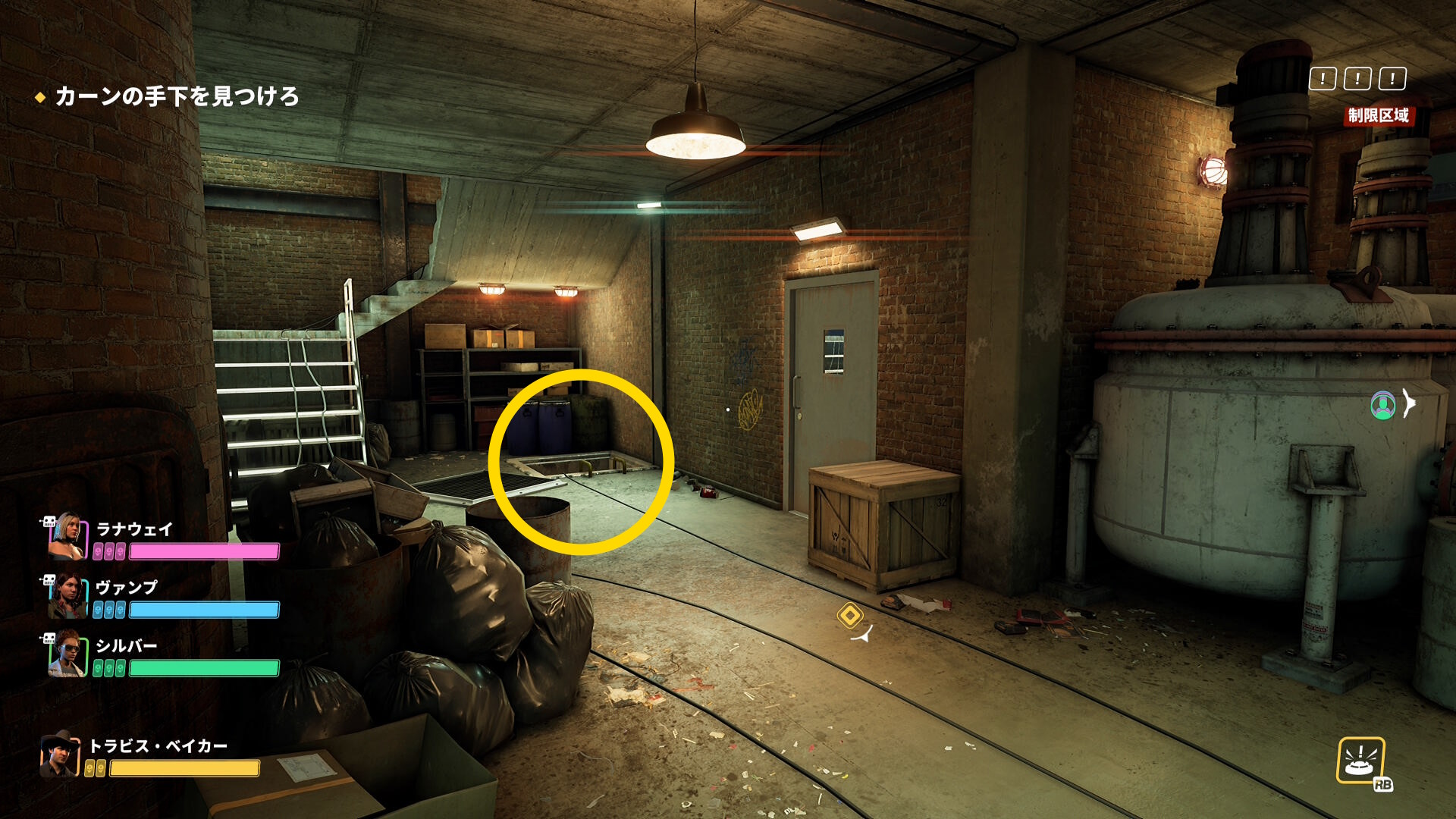 - カーンの手下を見張っている敵を撲殺し、X 長押しで手下を解放する