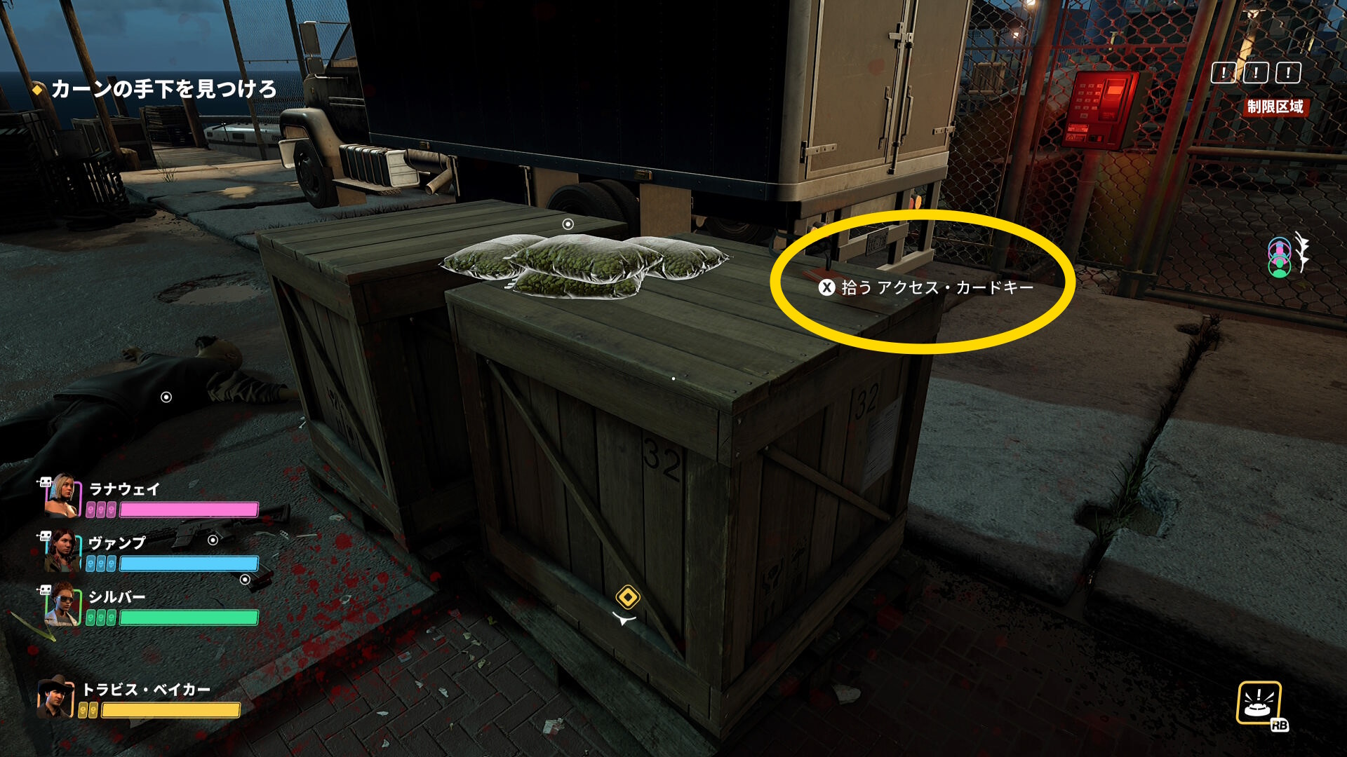 - いま撲殺した敵が寄りかかっていた木箱にアクセス・カードキーがあるので回収