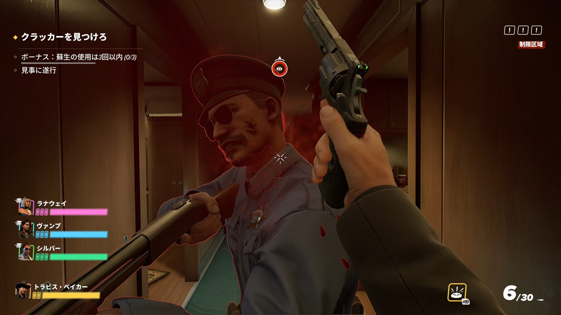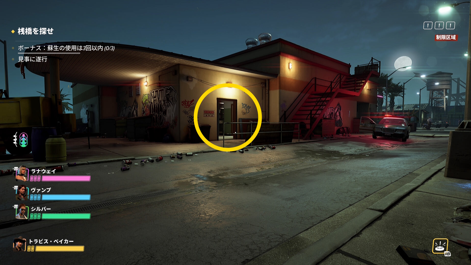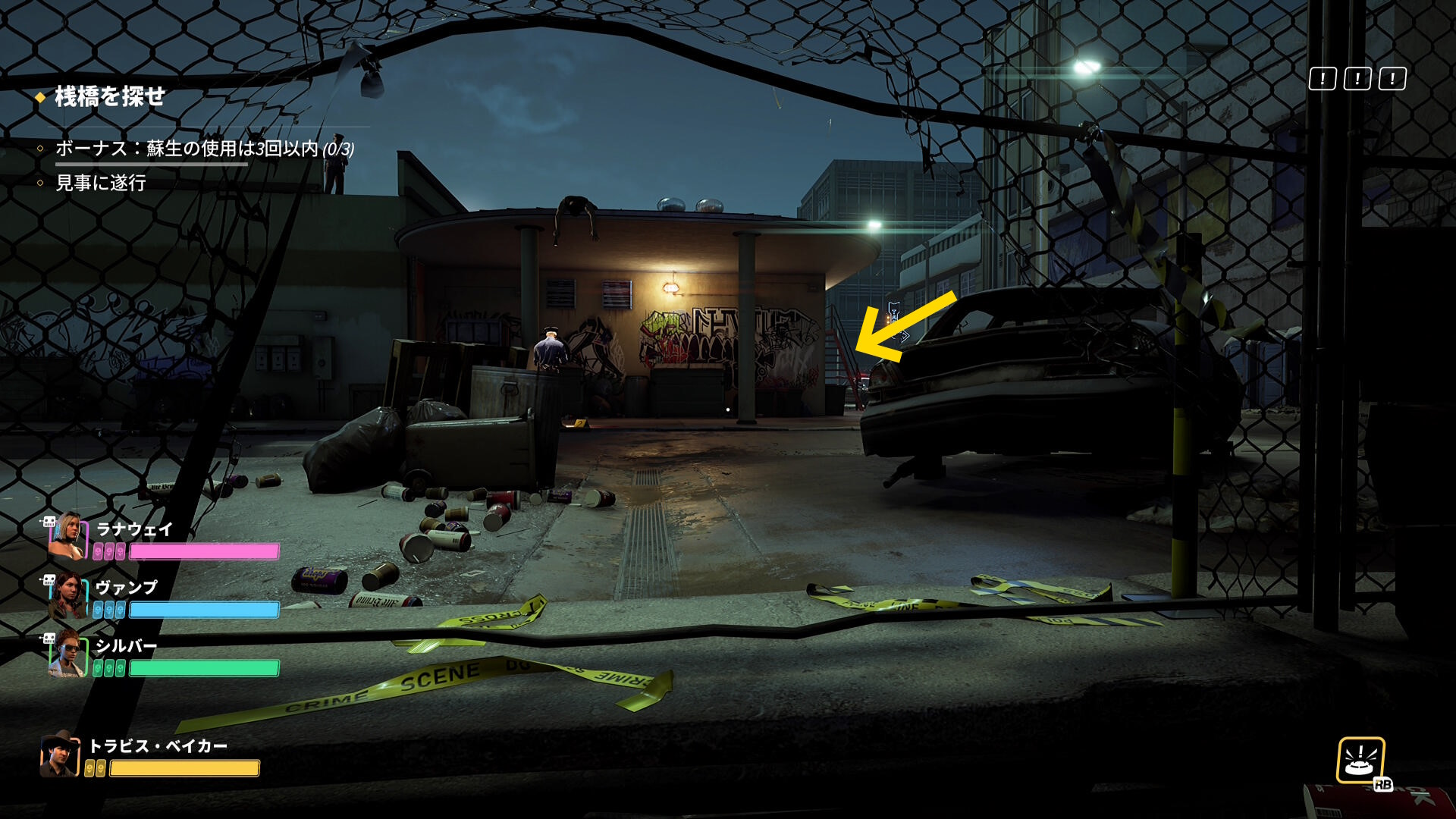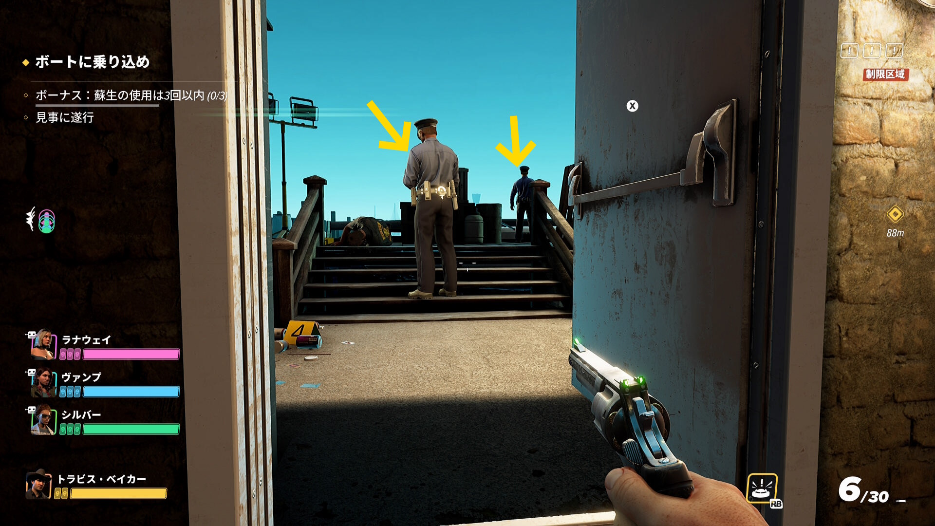 - もし、画面右上の「!」マークが1個も点灯していない場合、拘束した警察官を1人撲殺してから脱出すること