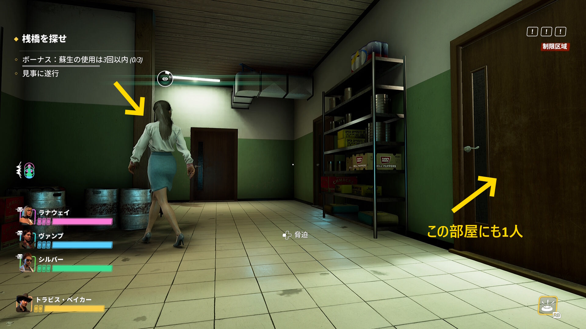 - 1人しかない場合もあり、そのときは右のドアを開けて待っているとこっちに戻って来るので拘束する