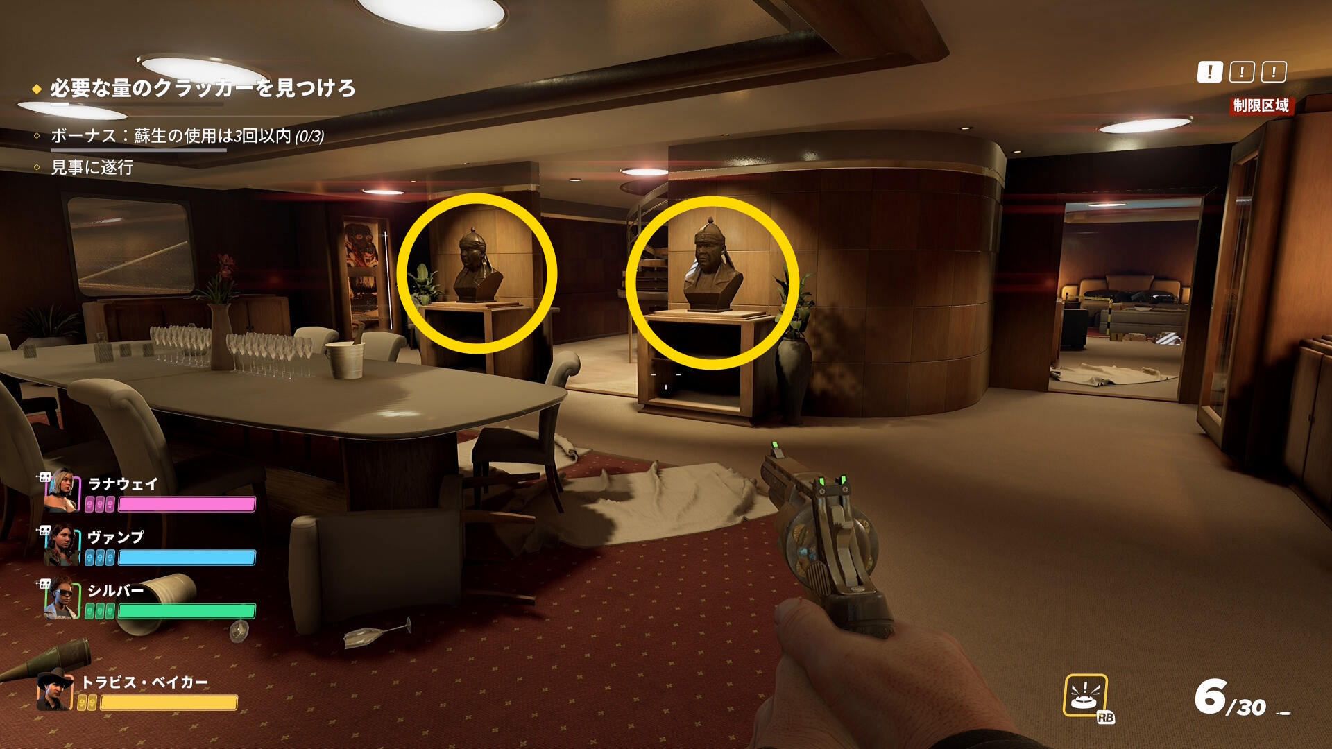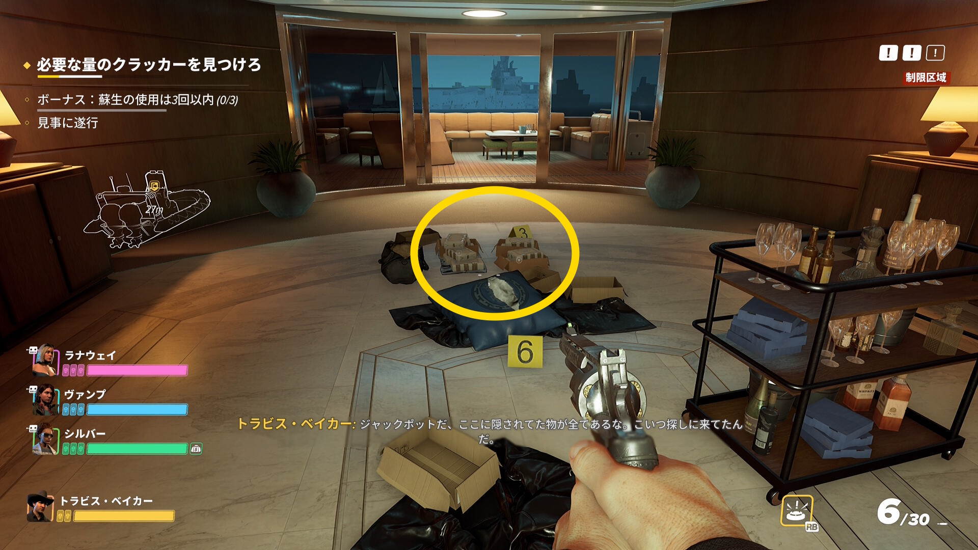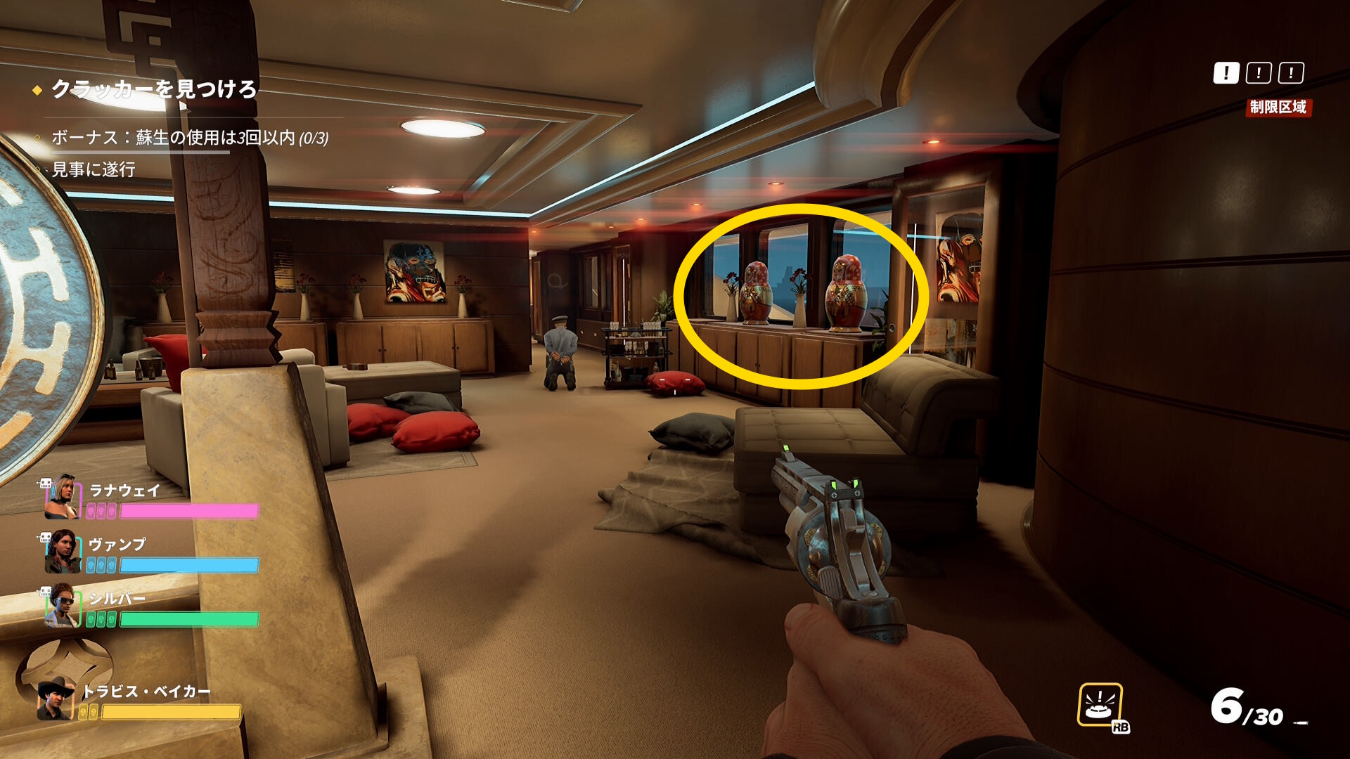 - ただし、1階を探索する際は先に警察官を拘束することが重要(クラッカーが必要量あつまると仲間は小型ボートに走っていくことが多い。また小型ボート近くにも警察官がいることが多く、仲間が見つかって騒ぎになるため)