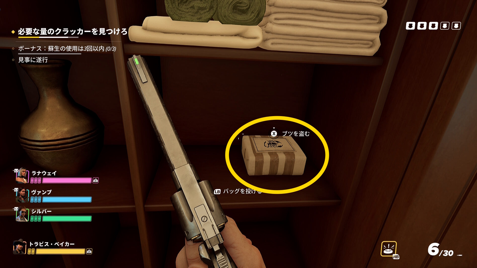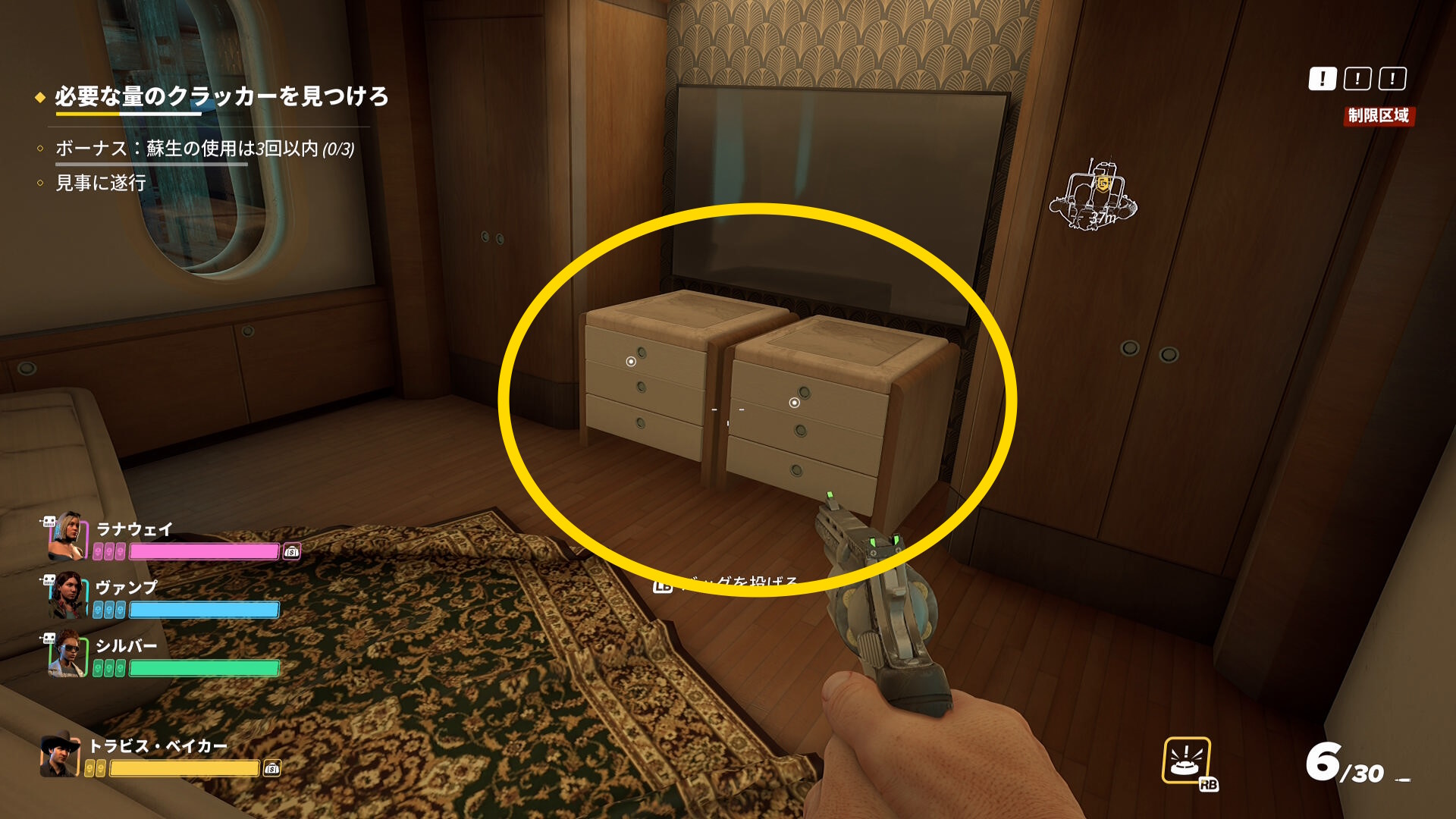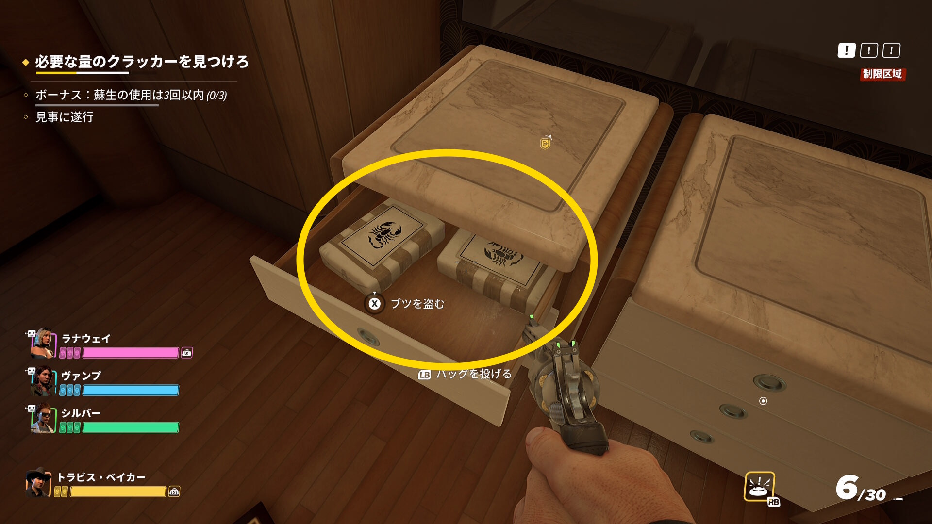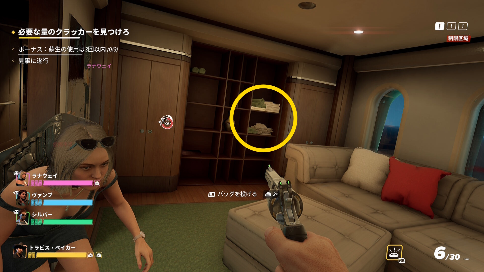 - ただし、1階を探索する際は先に警察官を拘束することが重要(クラッカーが必要量あつまると仲間は小型ボートに走っていくことが多い。また小型ボート近くにも警察官がいることが多く、仲間が見つかって騒ぎになるため)