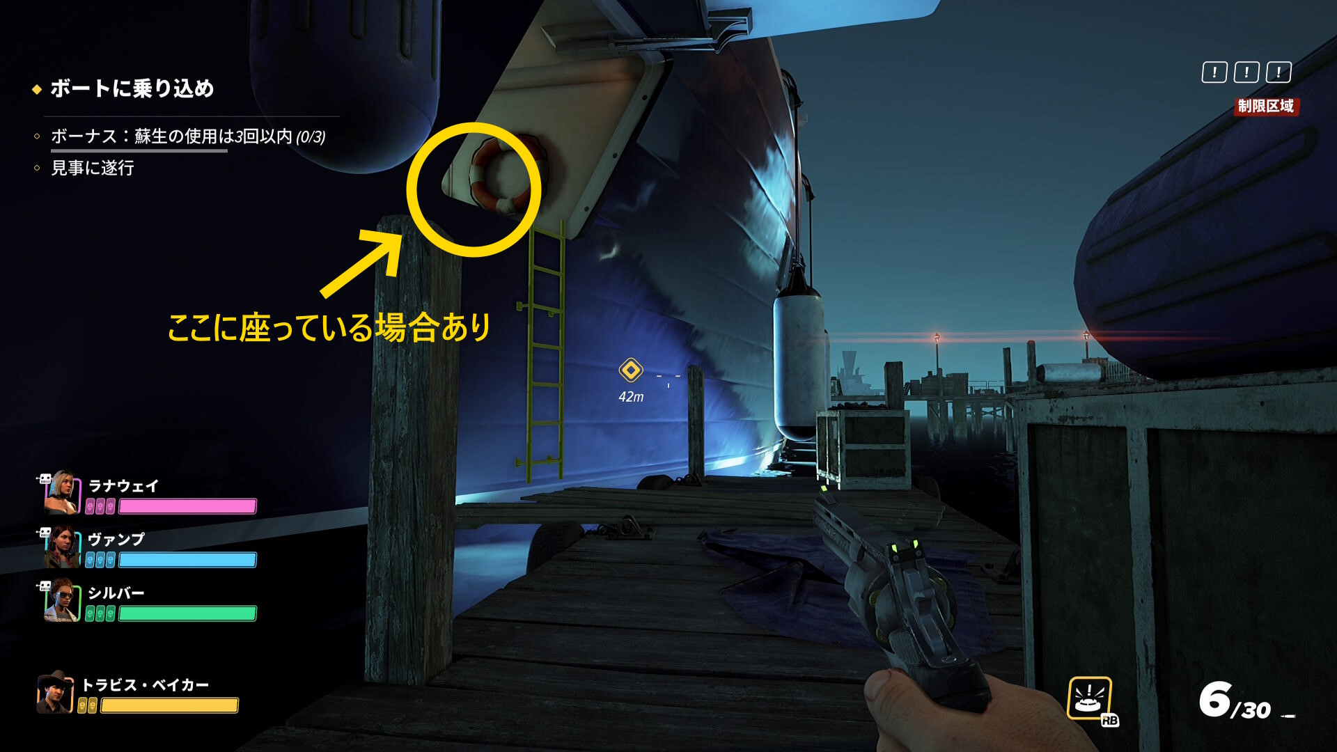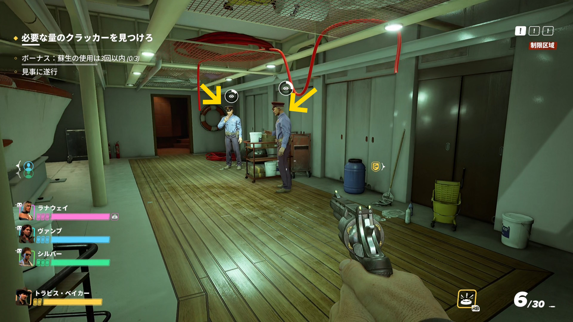 - ステルスで脱出するには1階の船首(もしくは船尾)に横付けされる小型ボート(ゾディアック)のところに行く必要があるため、3階 ⇒ 2階 ⇒ 1階 と探索するといいかもしれない(これは任意)