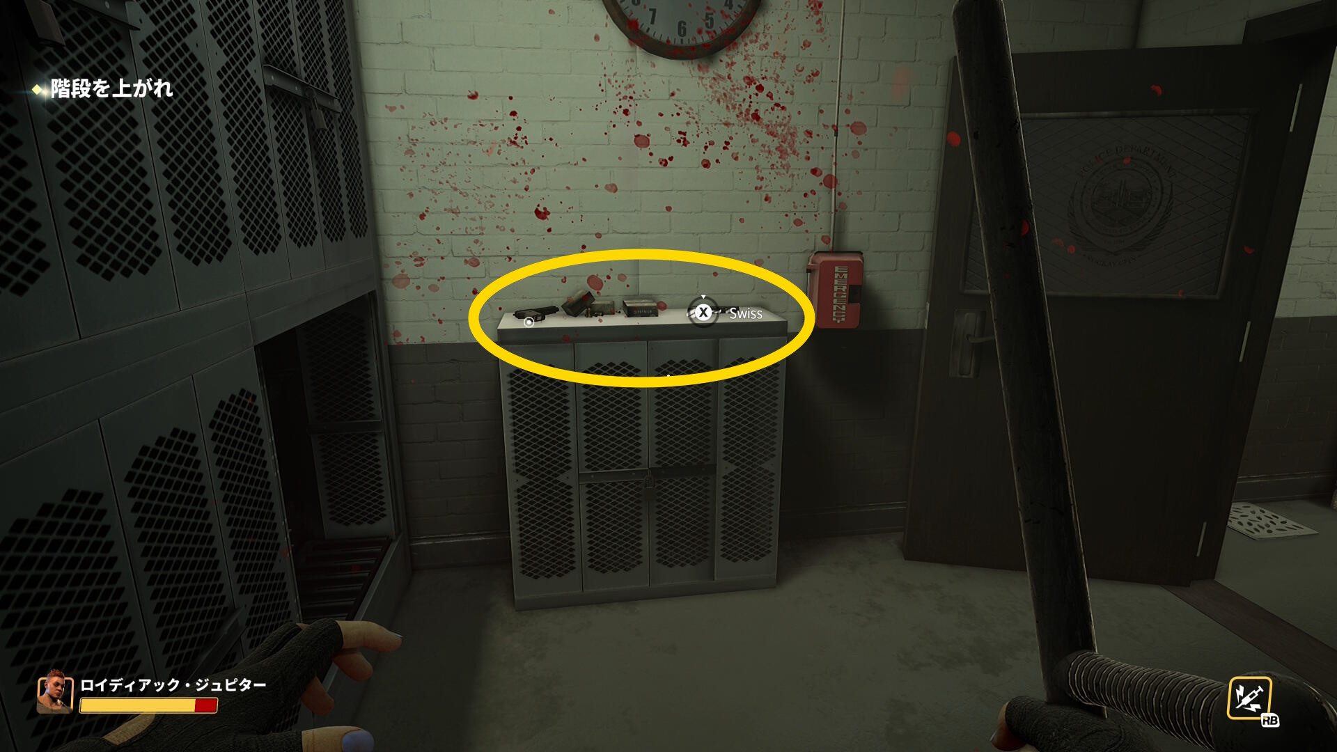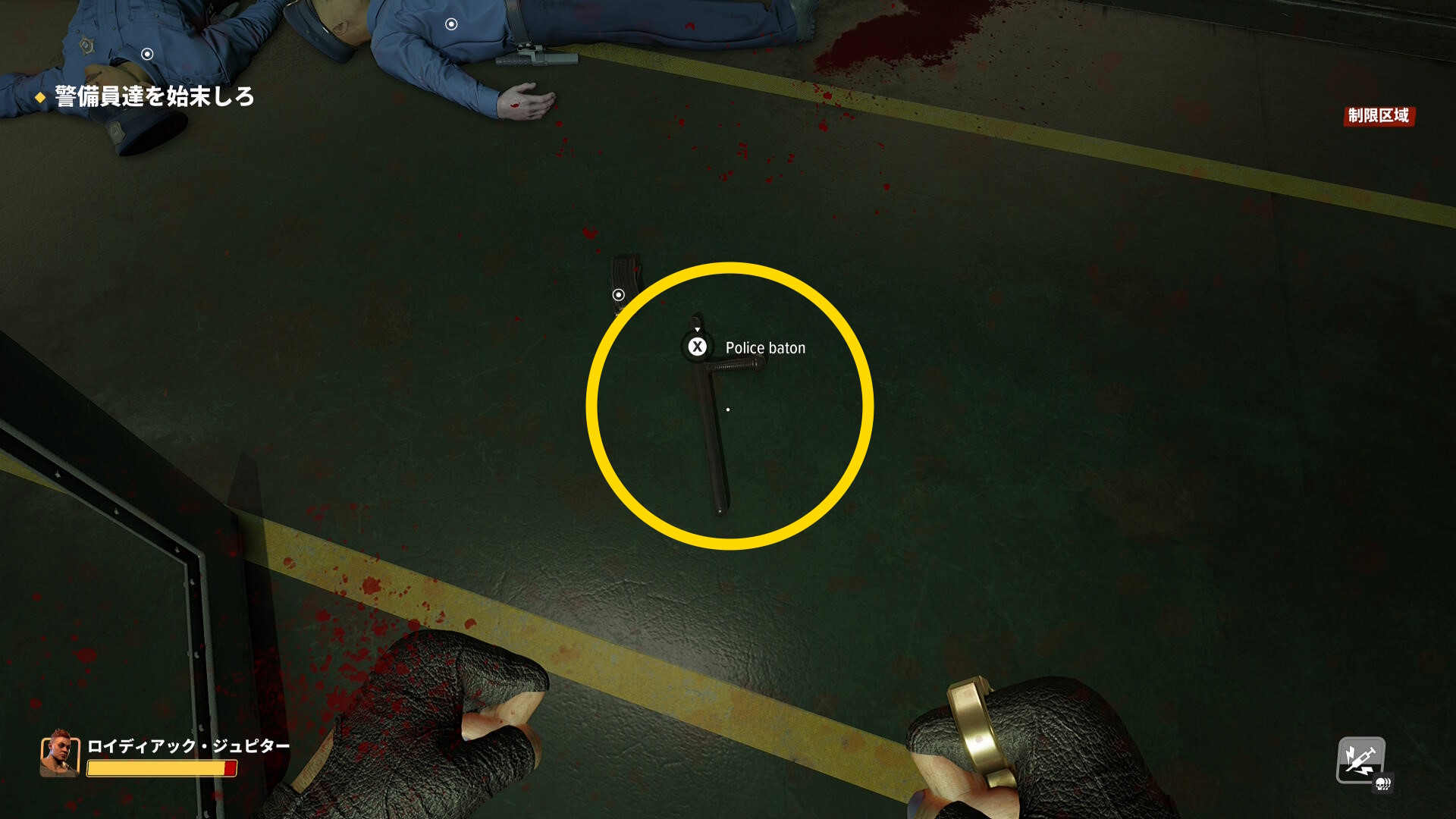 - 目の前の警察官を倒し、すぐもう1人来るので倒して警棒( Police Baton )を回収