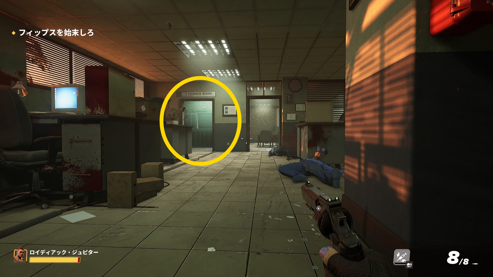 - 左奥の開口部から部屋に入るとフィップスがいる(2,3人の警察官もいる)
