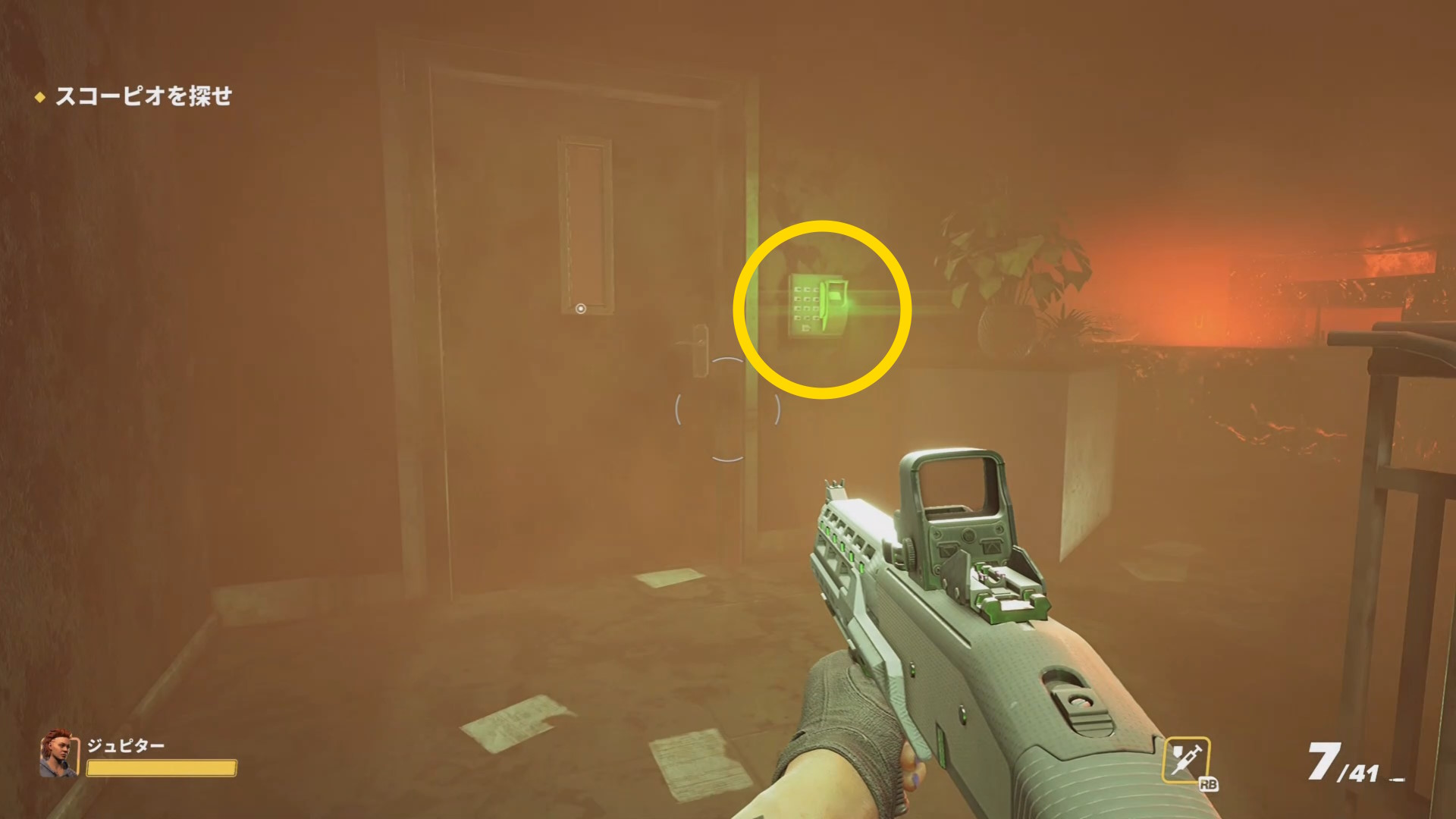 - 煙っているため視認性が低いが、ドア脇の緑色に灯る端末を目印に各部屋を探索していく(下画像)