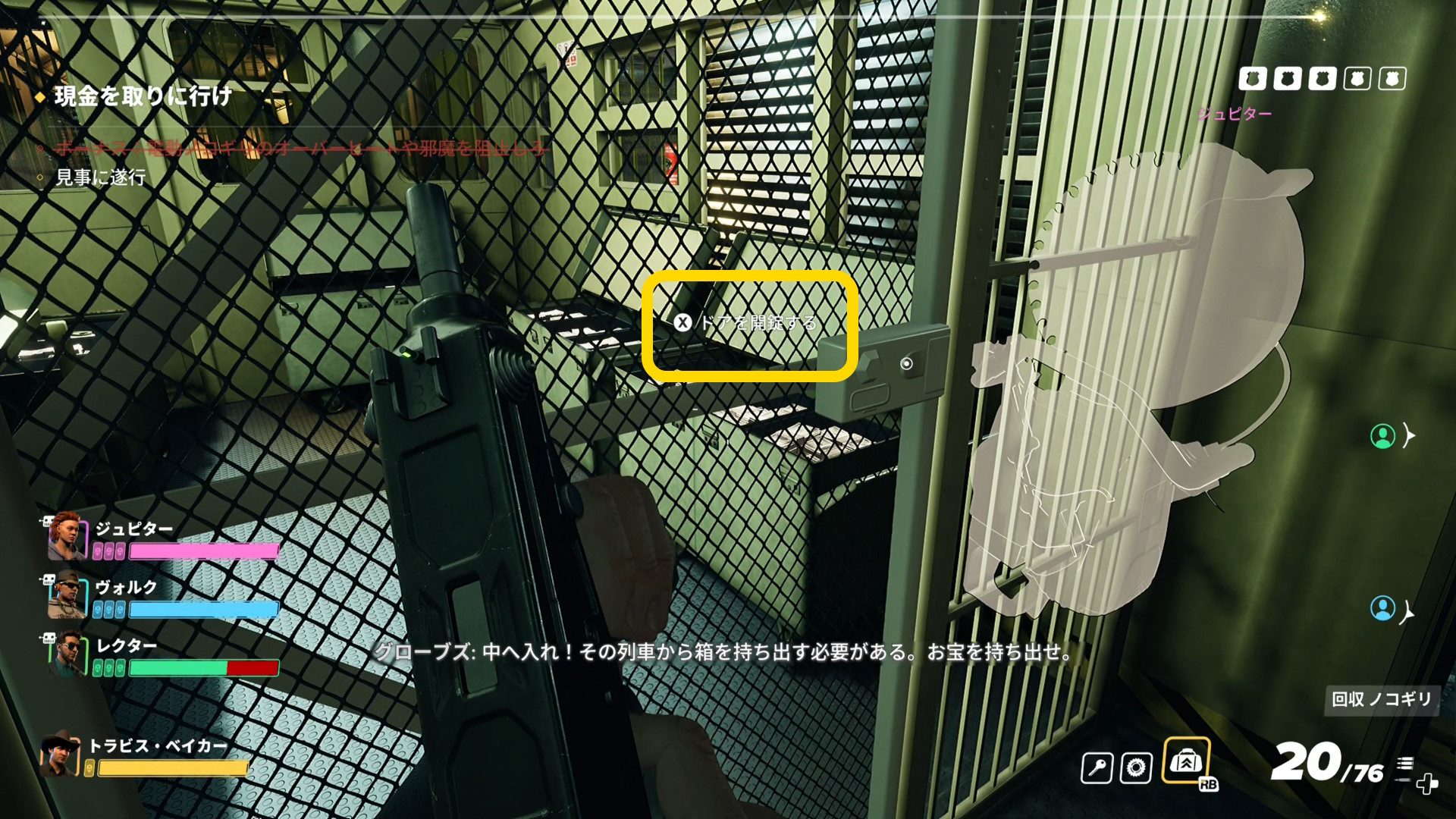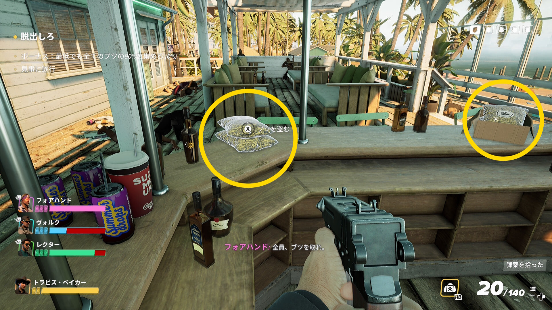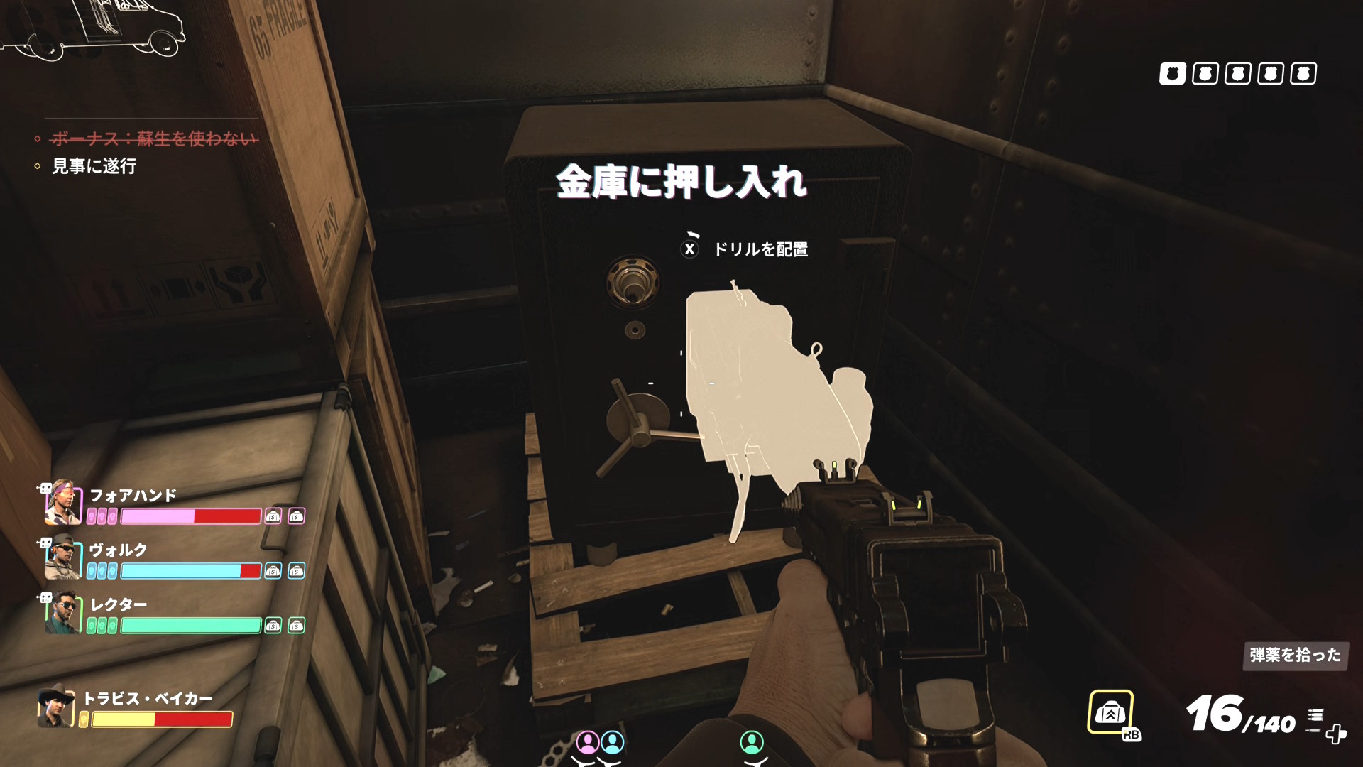 - 倉庫内に残ったバッグをバンに運んだり、チコスや警察官をキルしている間に金庫が解錠される