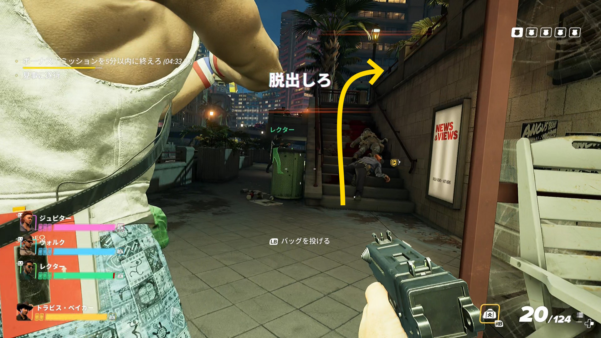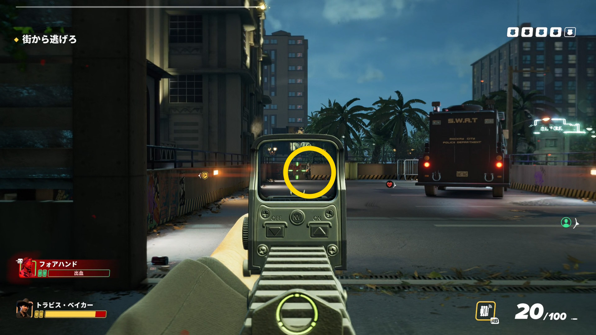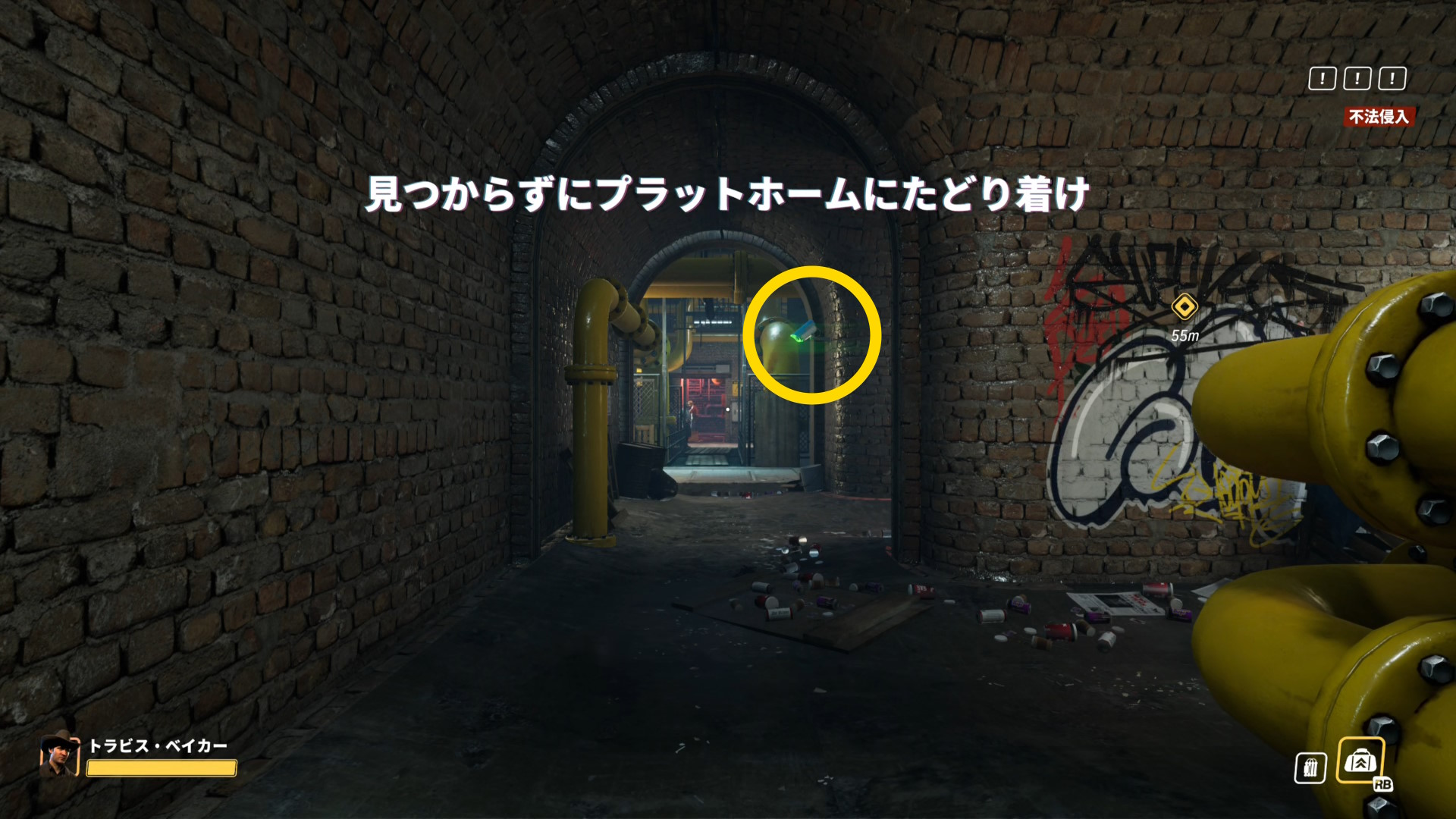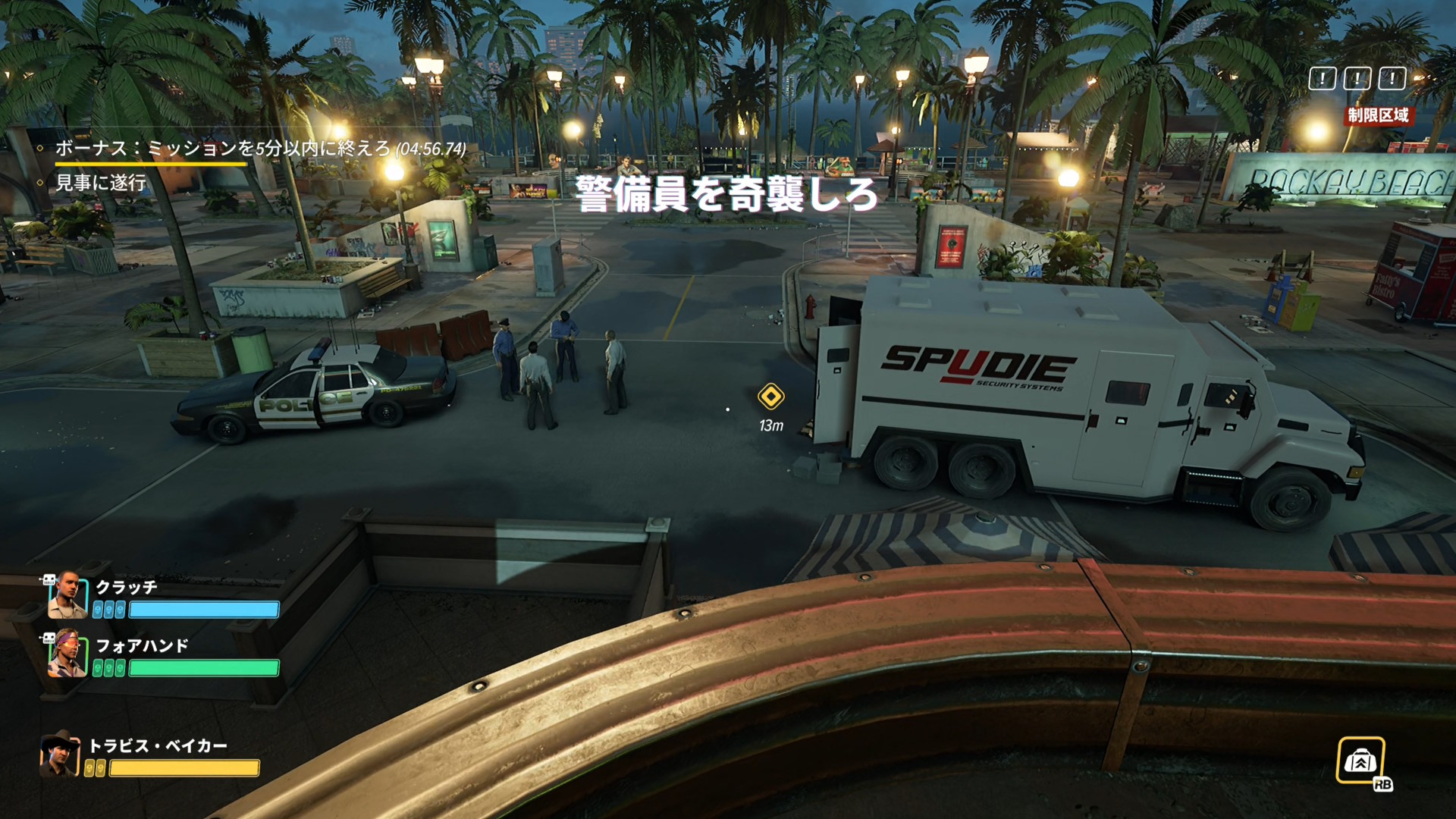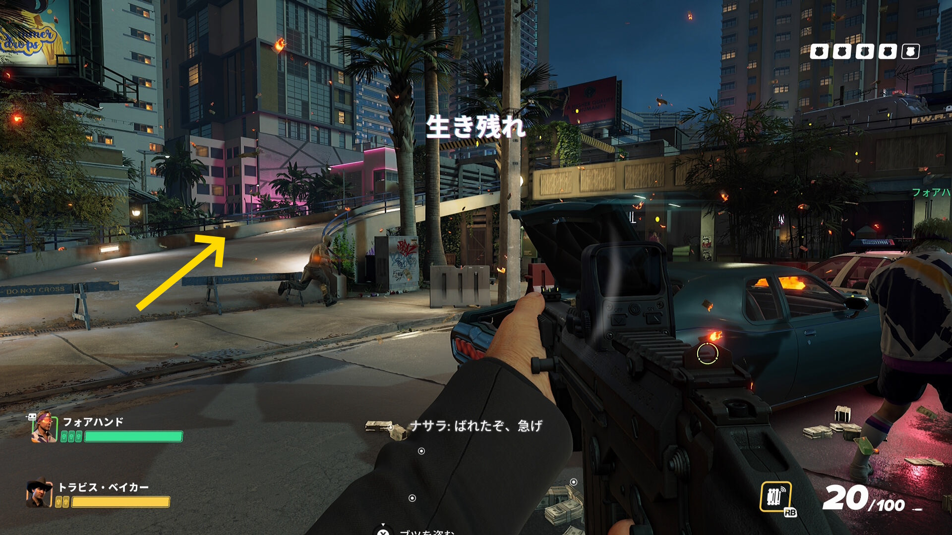 - 画面上部のバーが消え、スロープを登ってくる警察官などがいなくなったら、脱出地点への移動を開始する
