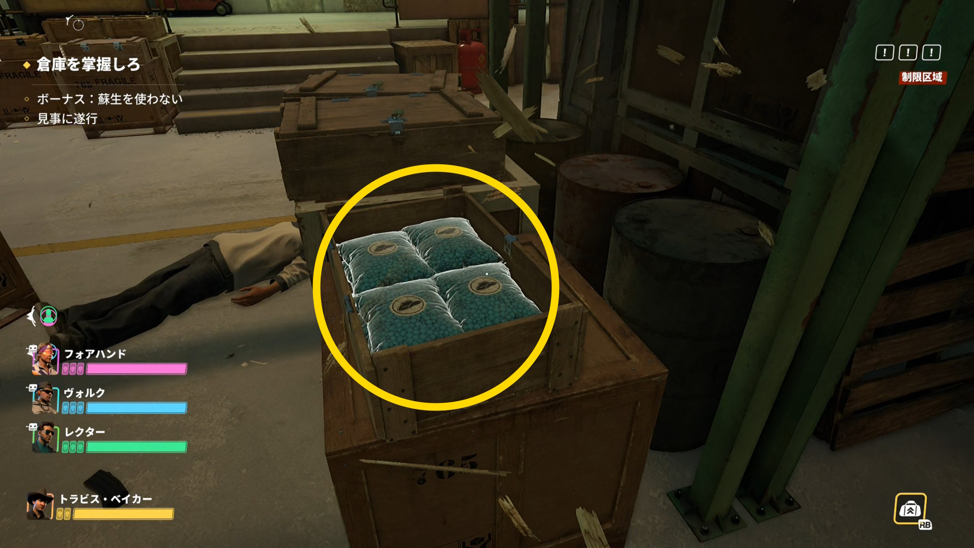 - 倉庫内のチコスを殲滅すれば、増援が襲来することはない(倉庫外にチコスがいる場合を除く)