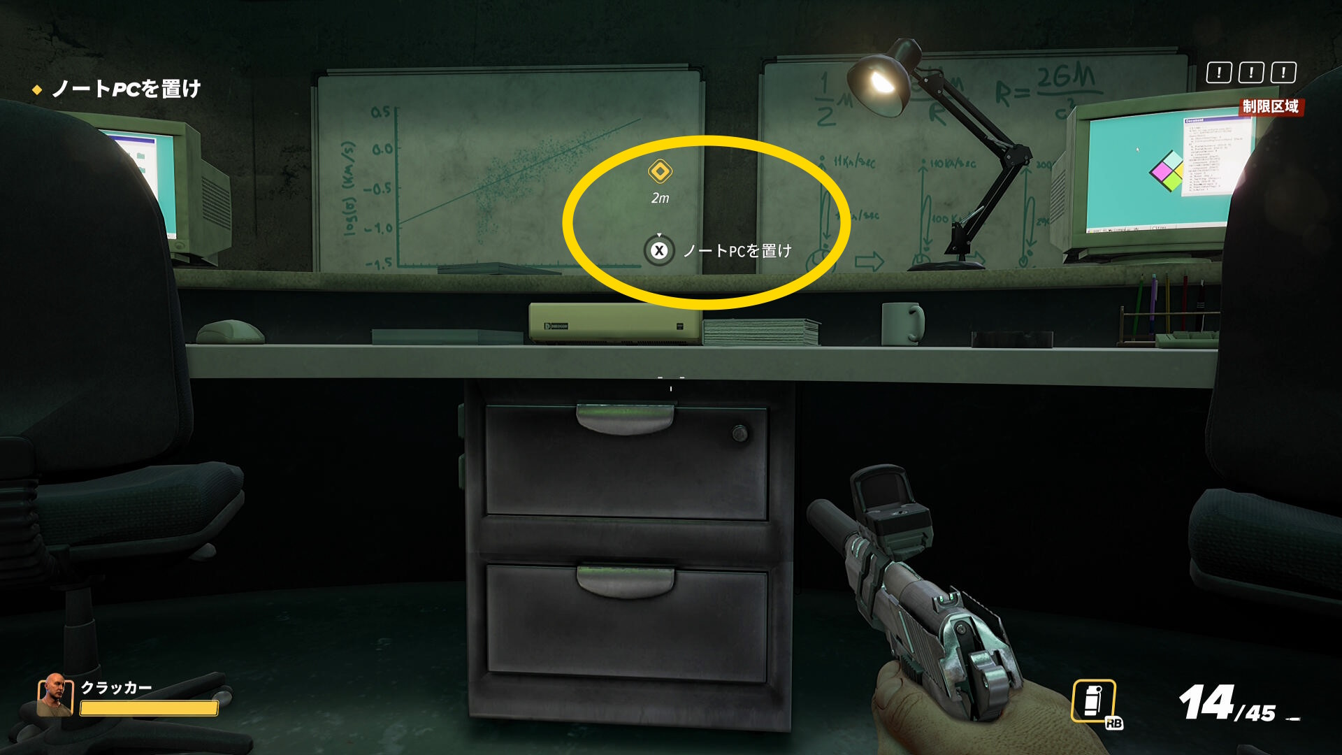 - 突き当りに金庫があるので、ドリルを設置して解錠する