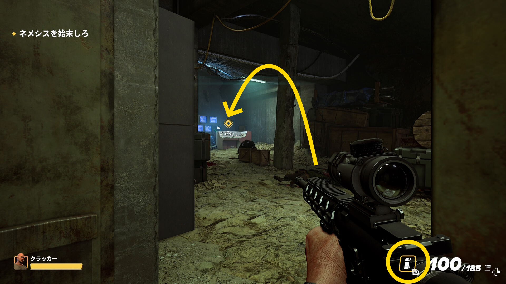 - 手下をキル後、ネメシスは左奥のコンソールの裏にいるので、閃光手榴弾を投げ込んでからダッシュで近づく