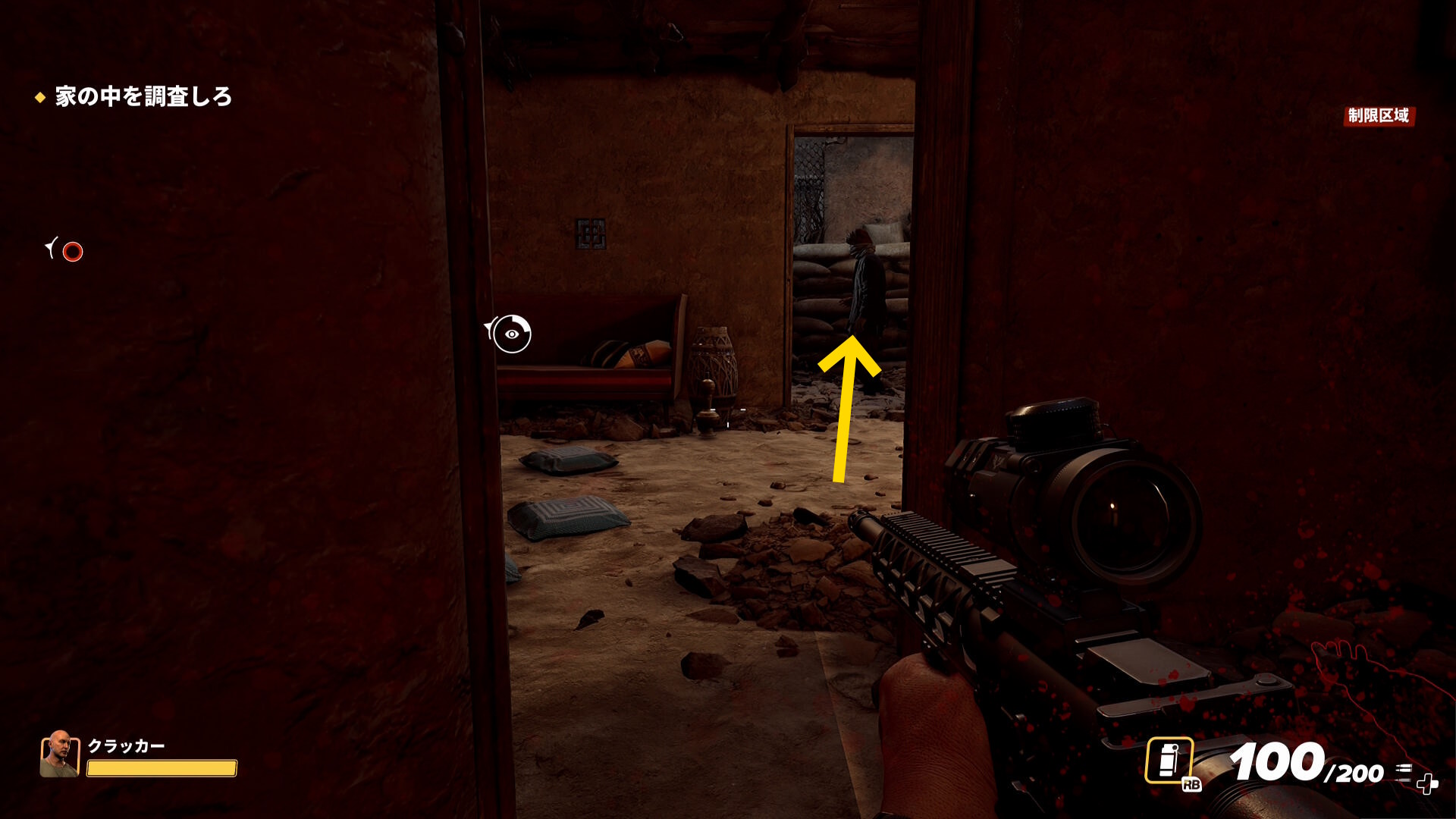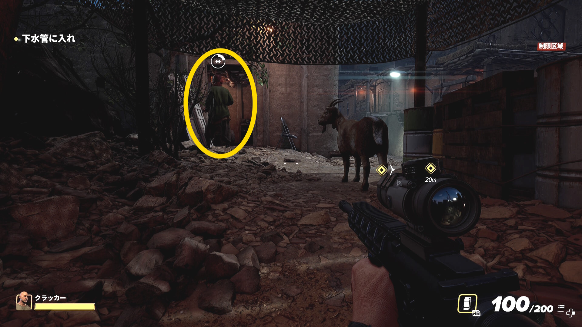 - さっき見た敵がヤギの前を通過し、少し立ち止まったあとで奥の家に入っていく
