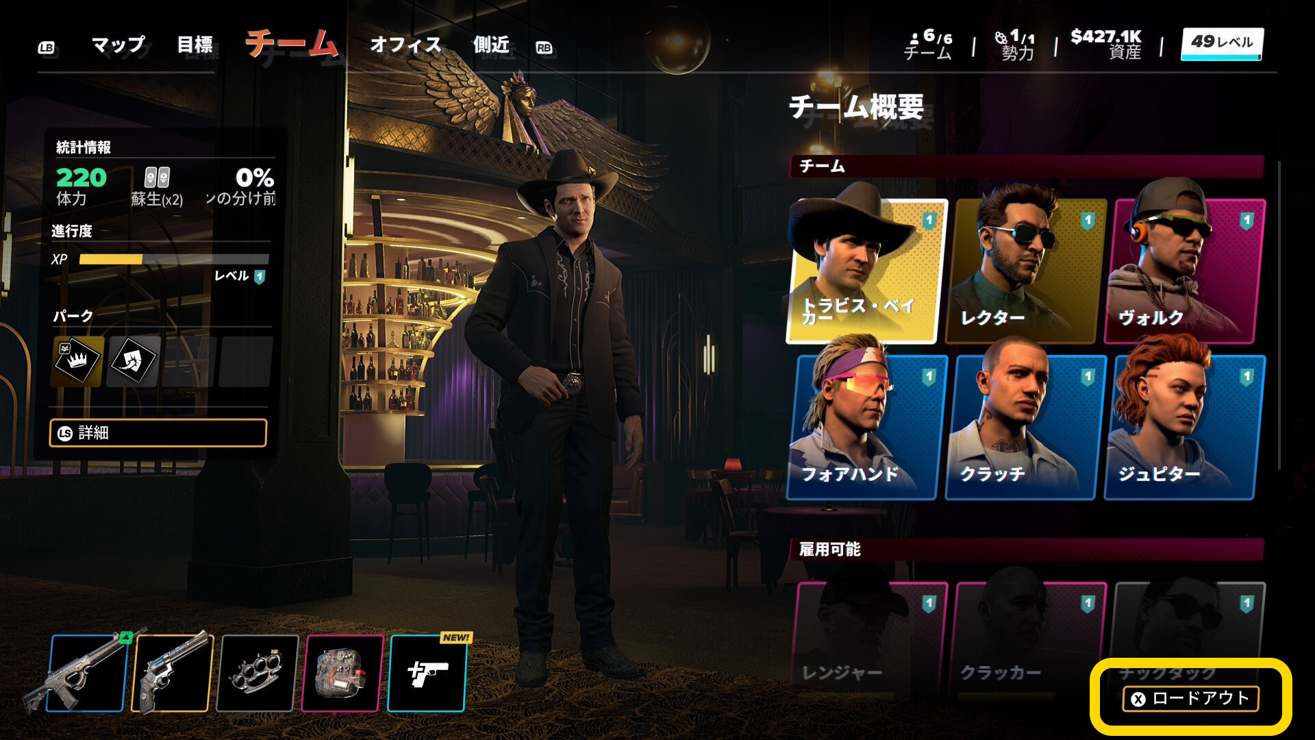 - 「チーム」タブに移動し、右下の ”ロードアウト” を選ぶと武器の購入と交換ができるようになる(下画像1枚目)