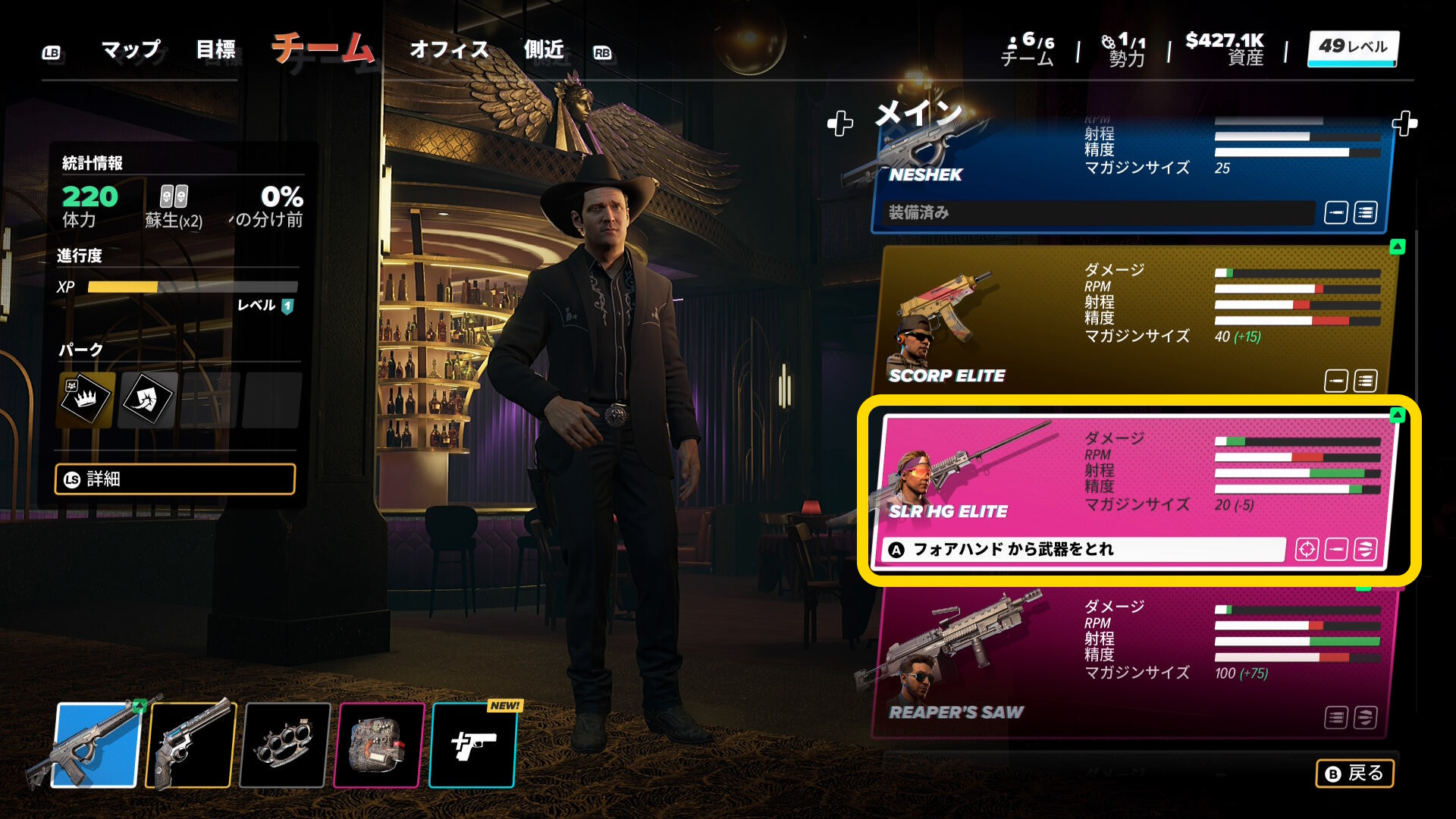 - 当サイトでは SLR を推奨するが(下画像2枚目)、交換した SLR HR ELITE が連射できない仕様のため少し苦戦した(攻撃力と射程は満足)