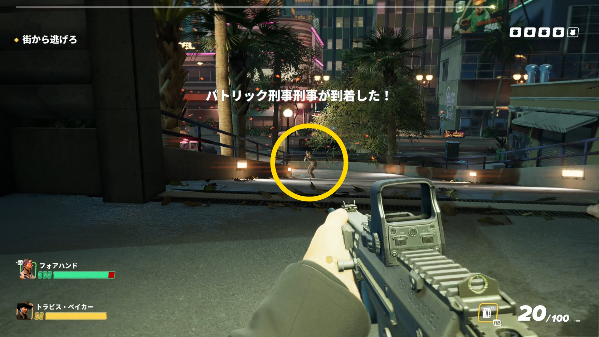 - 徐々に向かってくる数が増え、刑事も3人来るので確実にキルしよう(刑事は赤い HP ゲージになってダウンするが、放置すると回復するため)