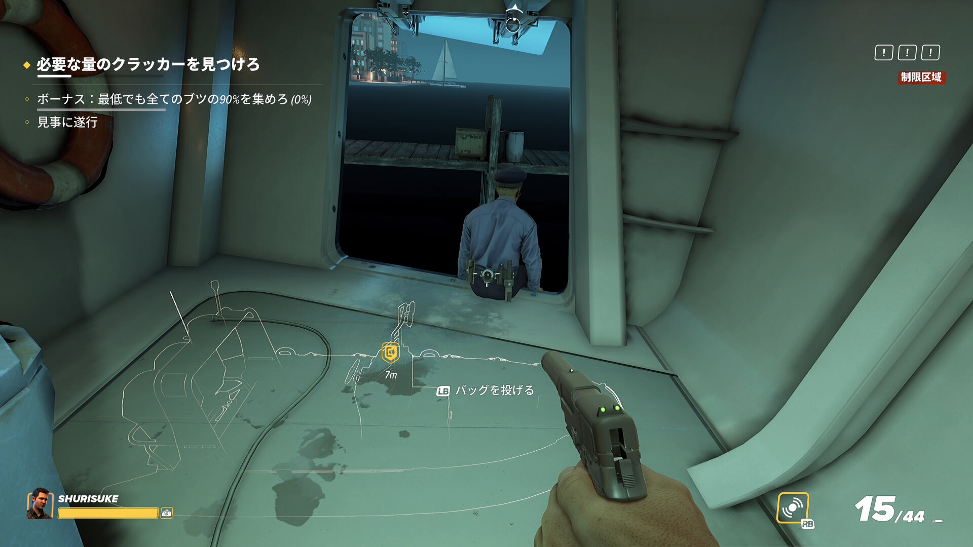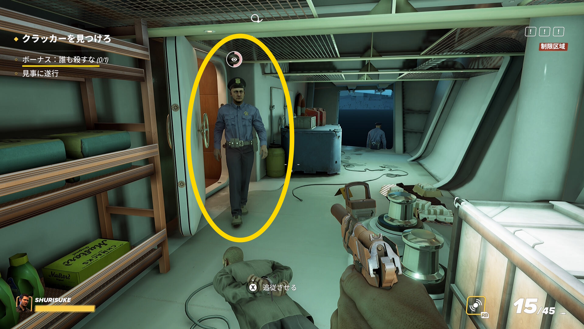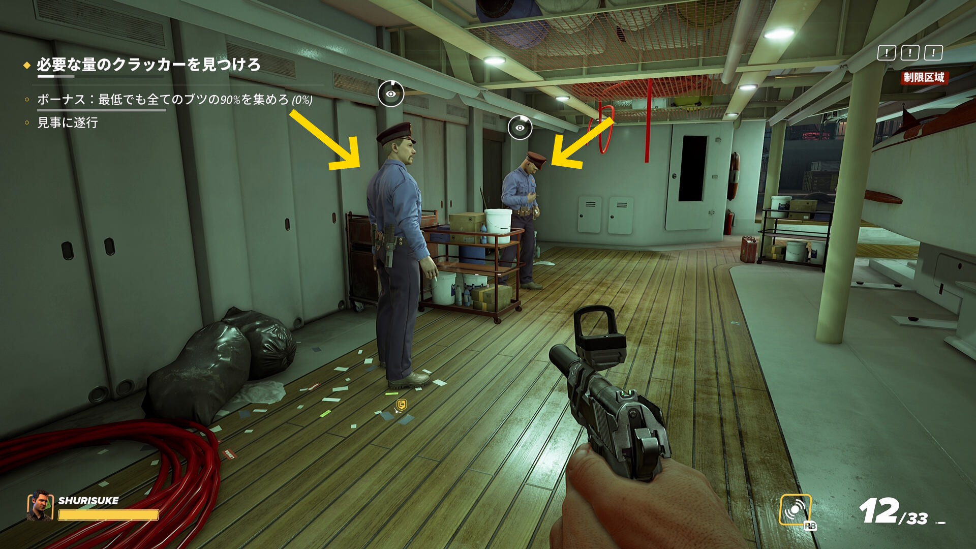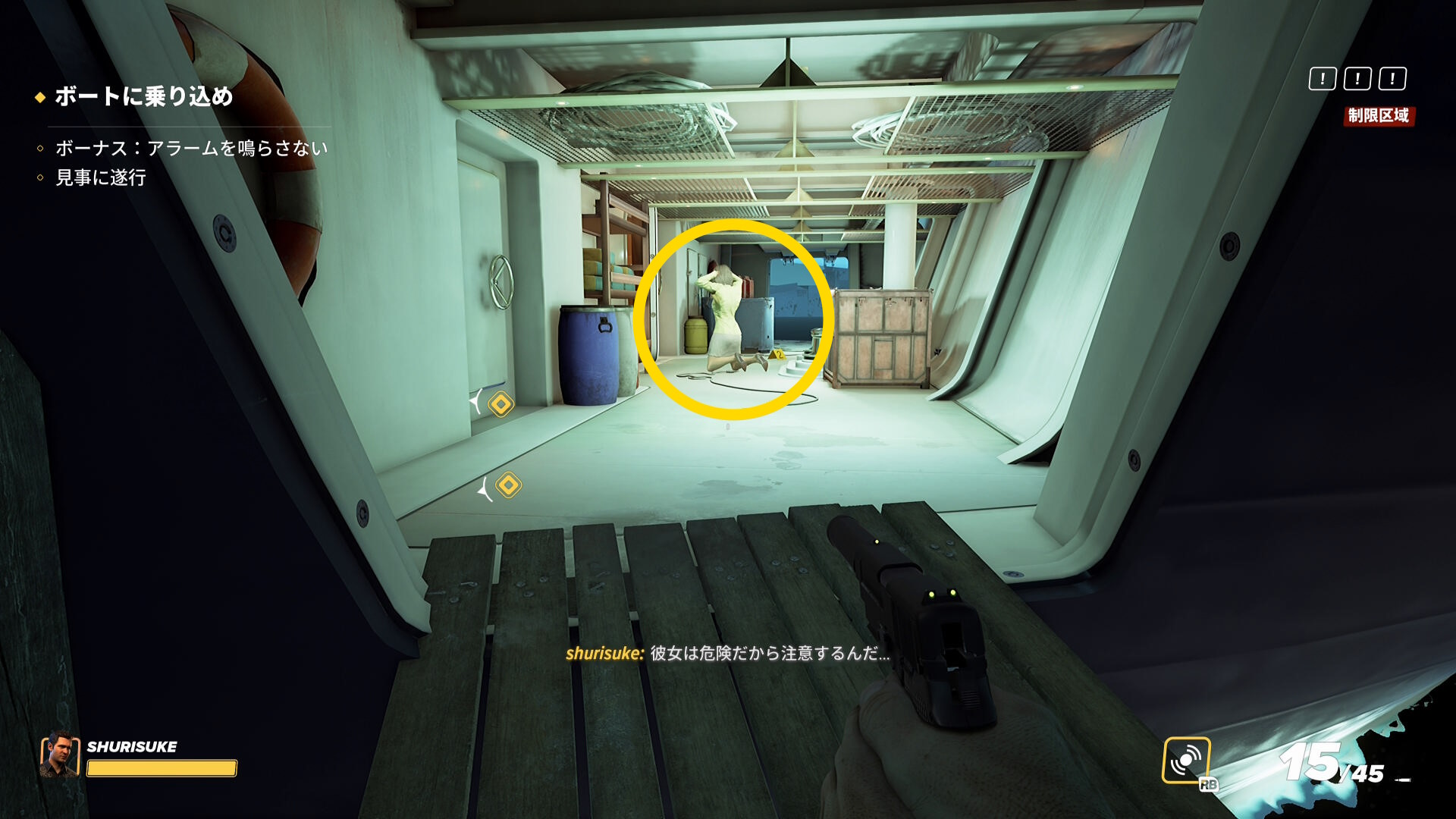 - なお、2階の船首(バックヤード)部分から乗船した際、一般人がいることがあるので拘束しておこう(下画像)