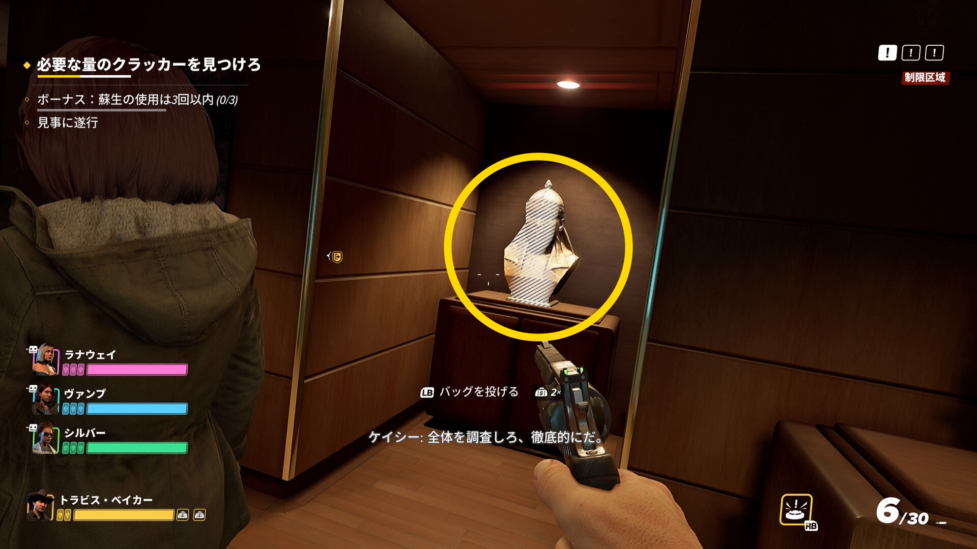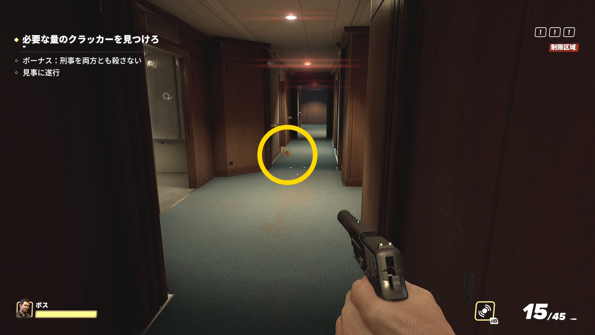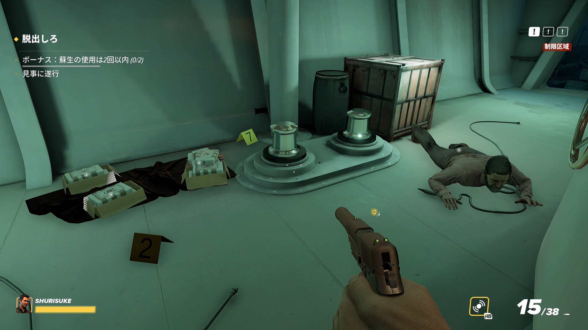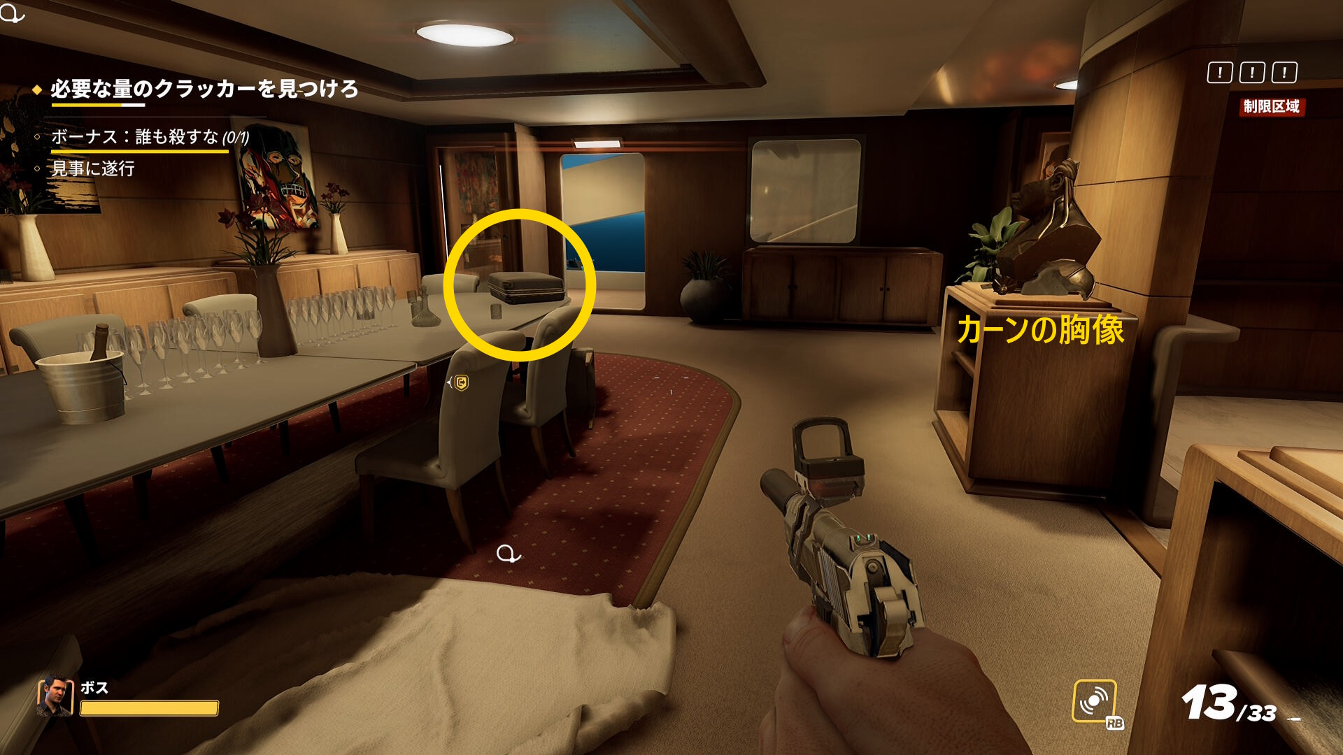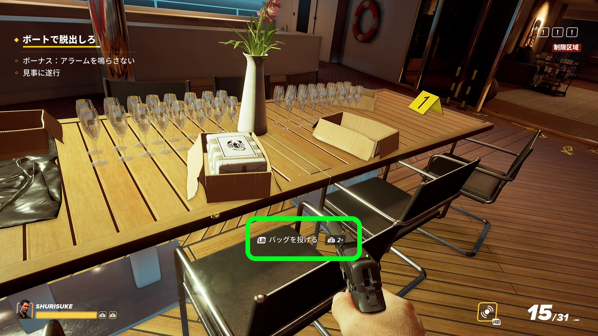 - なお、2階の船首(バックヤード)部分から乗船した際、一般人がいることがあるので拘束しておこう(下画像)