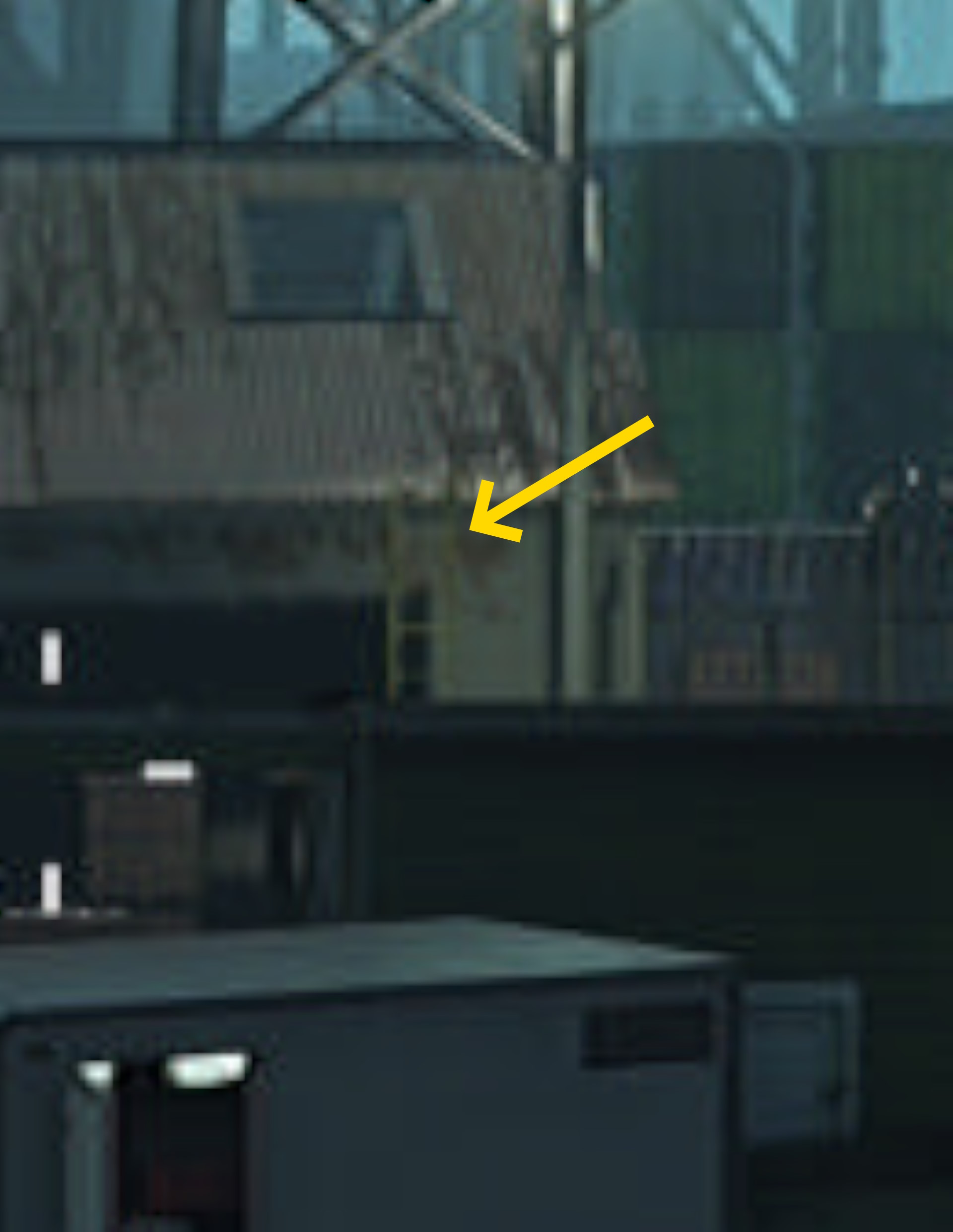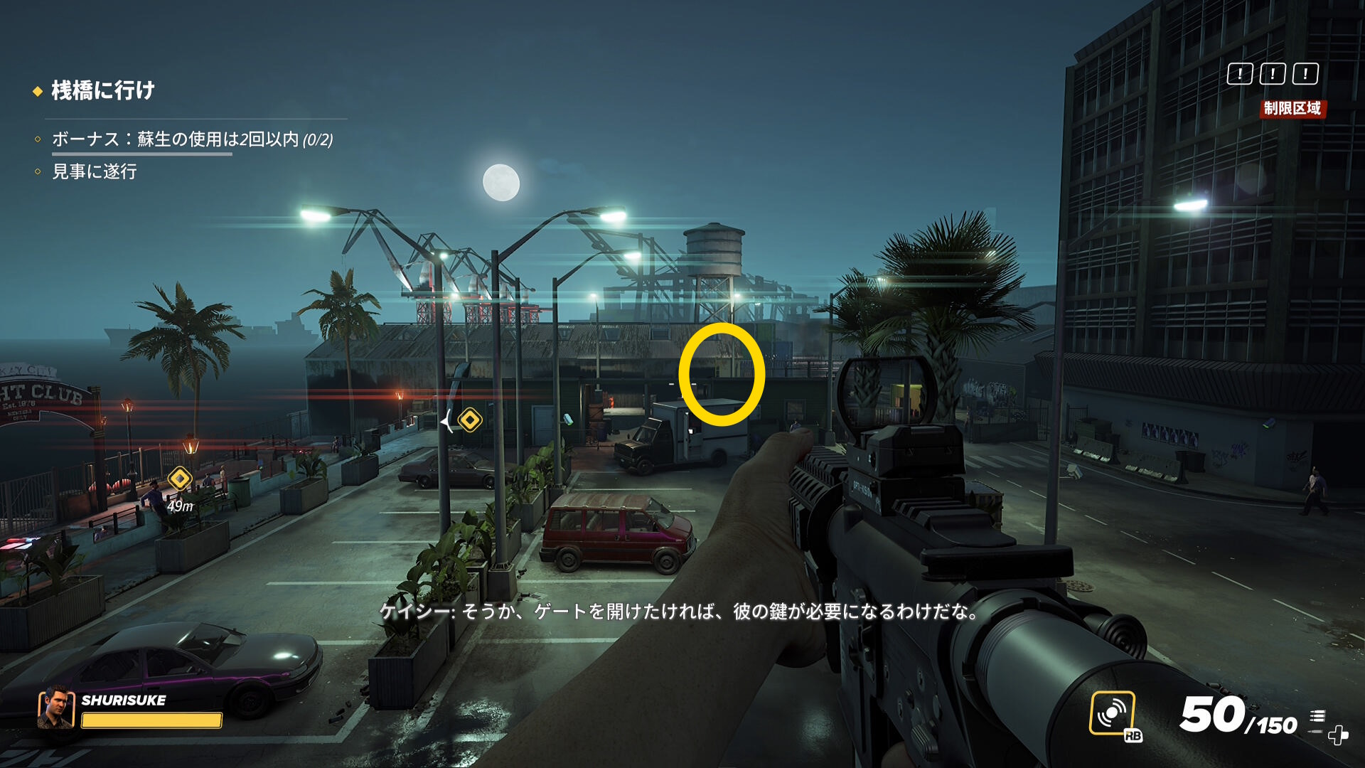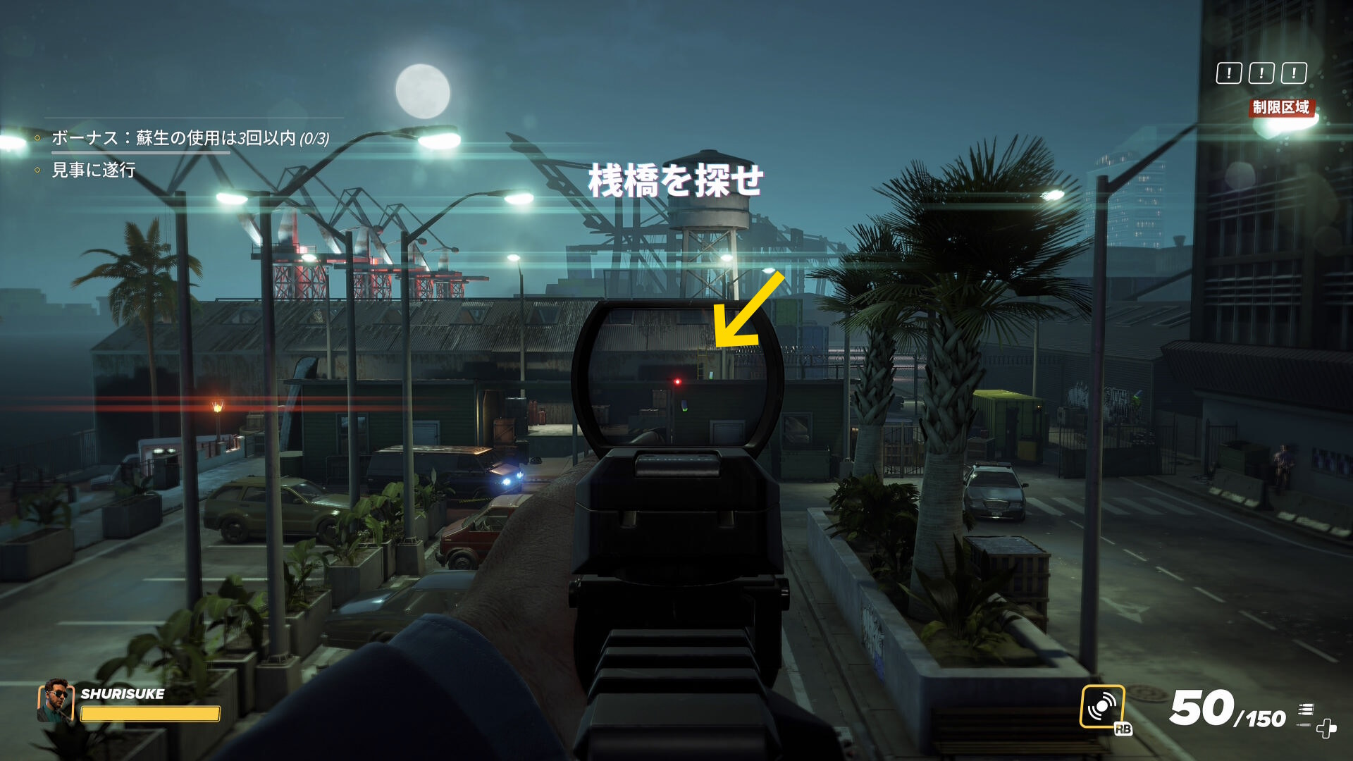 - 屋上の奥まで進み、スコープ付きの銃で正面奥の倉庫を確認