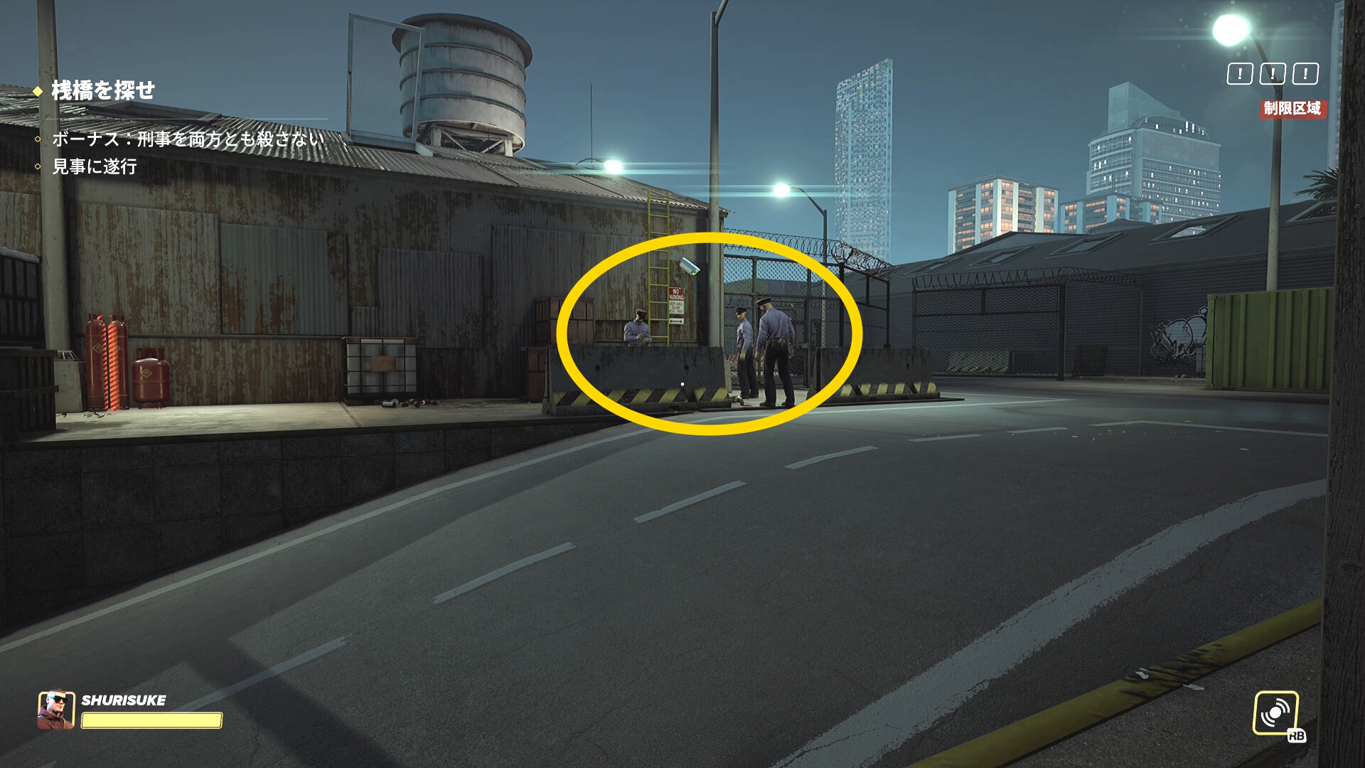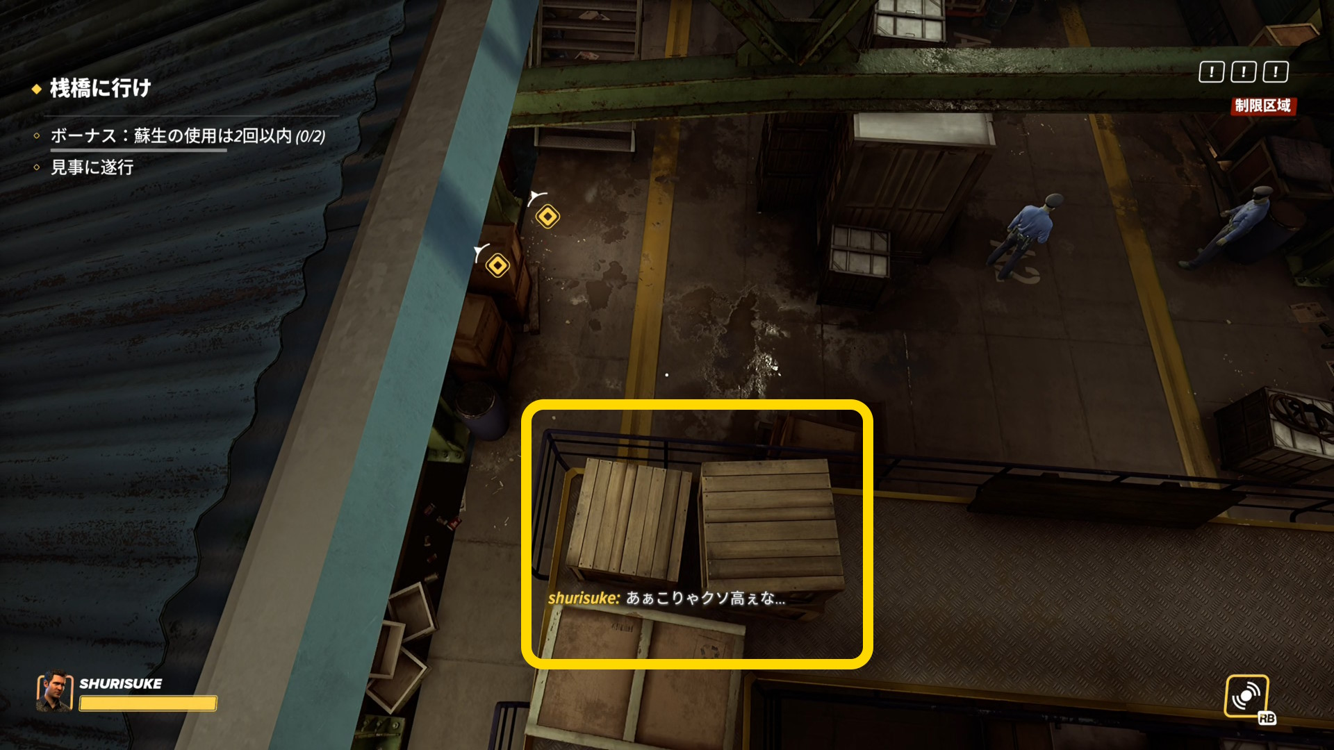 - 脱出する際も2階の手すりからジャンプで乗り越えると桟橋を巡回している警察官に見つからない