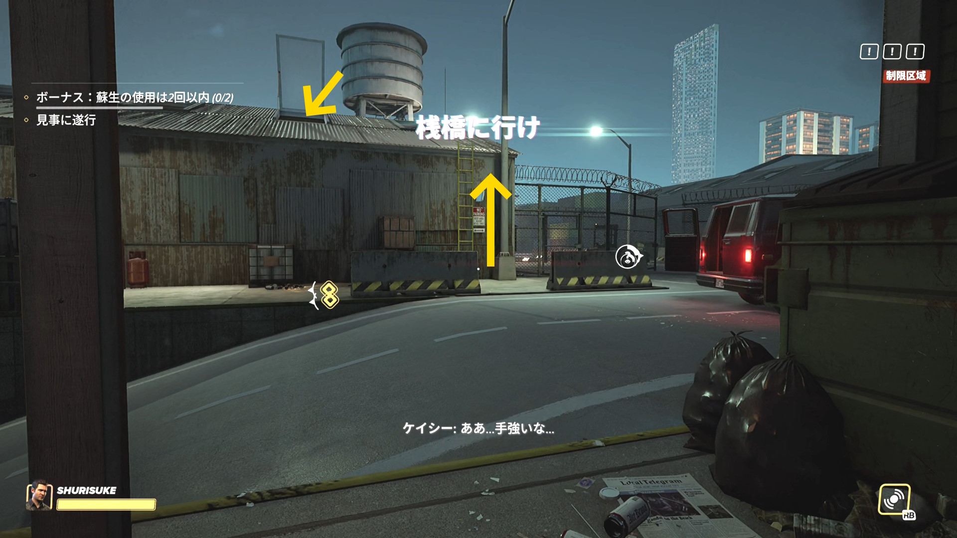 - ダイナーの屋上からハシゴが確認できたら、そのまま下に飛び降りて倉庫に向かう