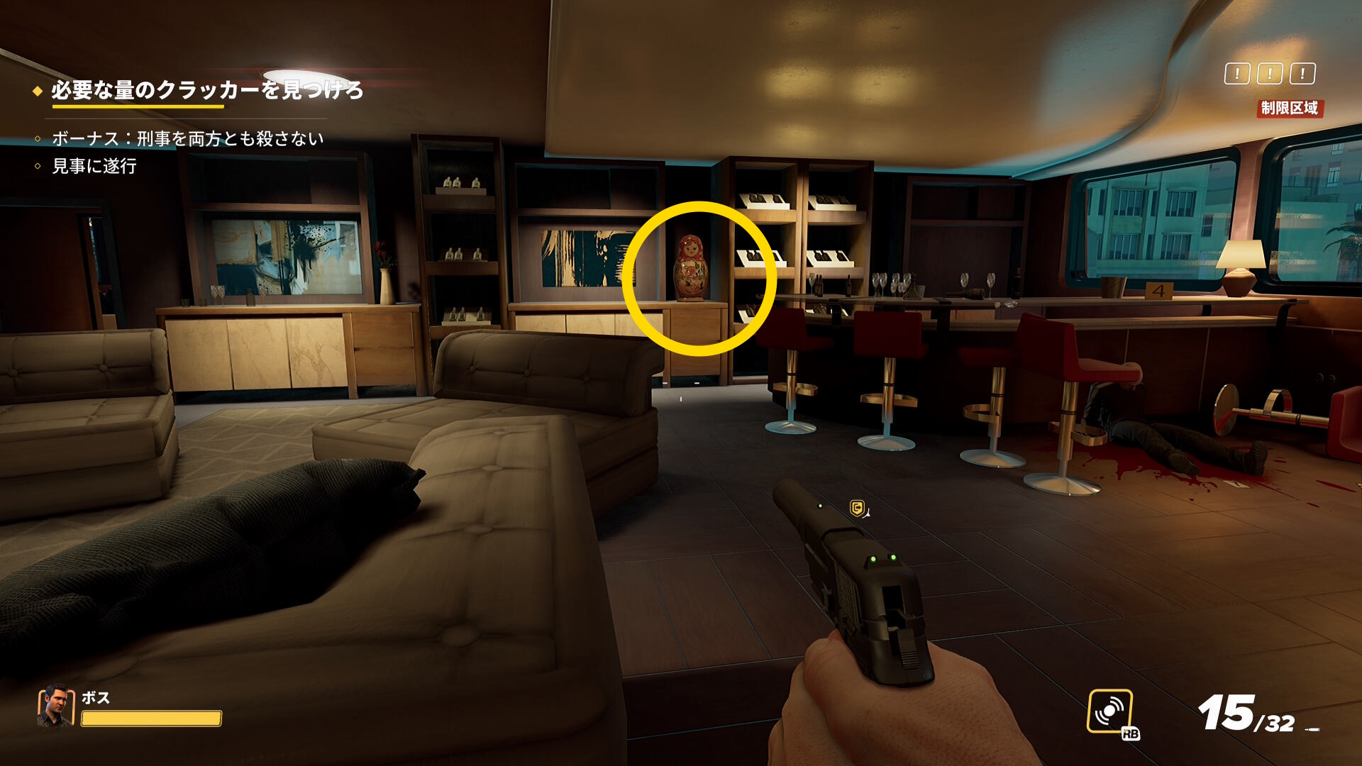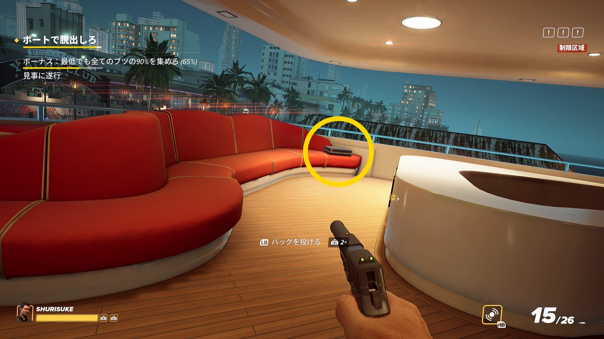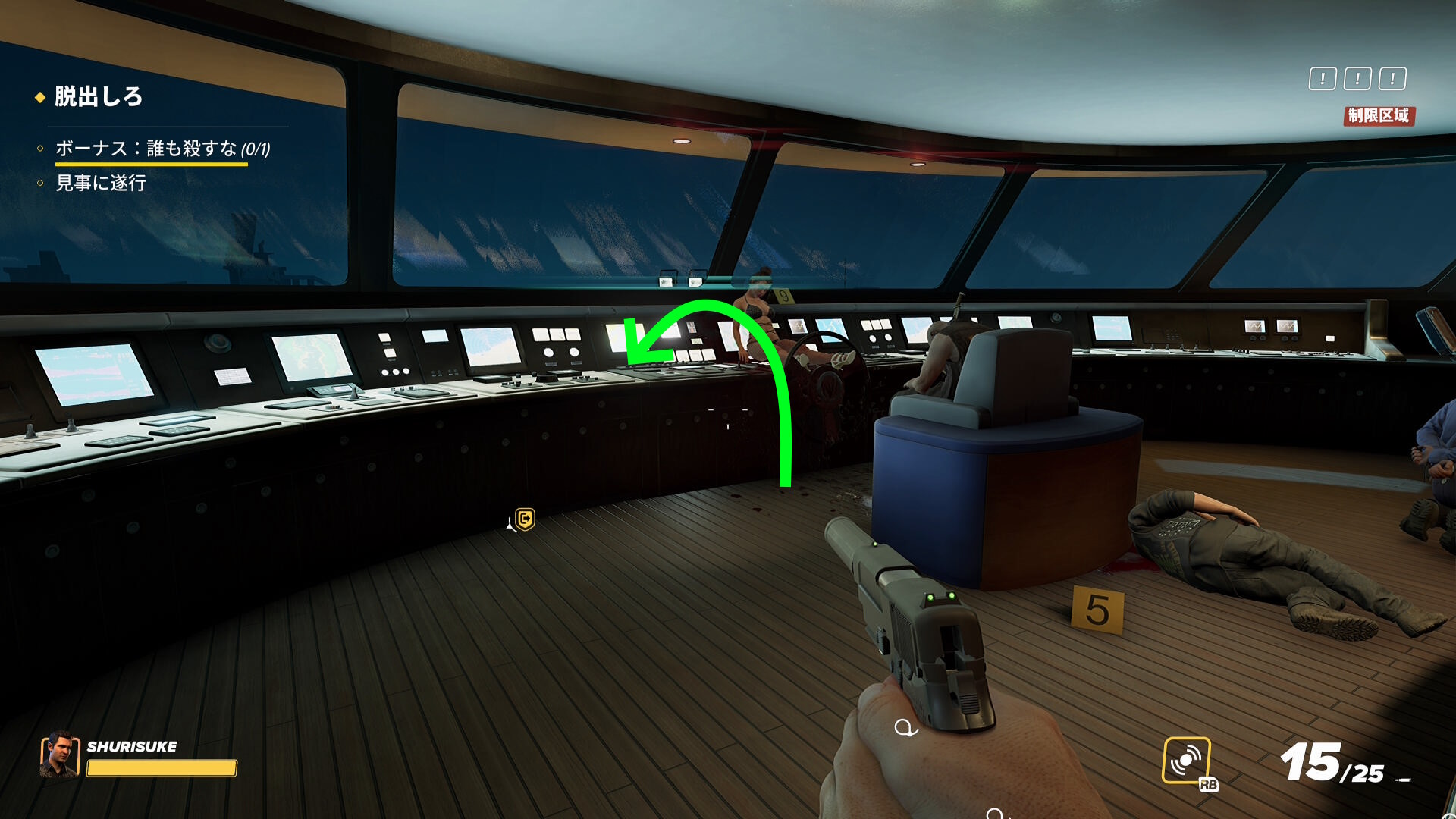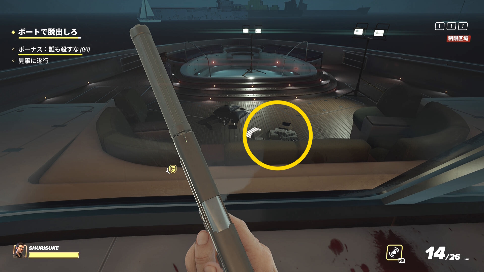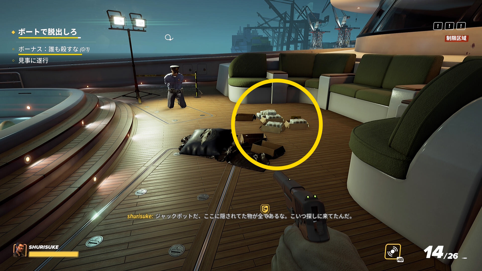 - なお、2階の船首(バックヤード)部分から乗船した際、一般人がいることがあるので拘束しておこう(下画像)
