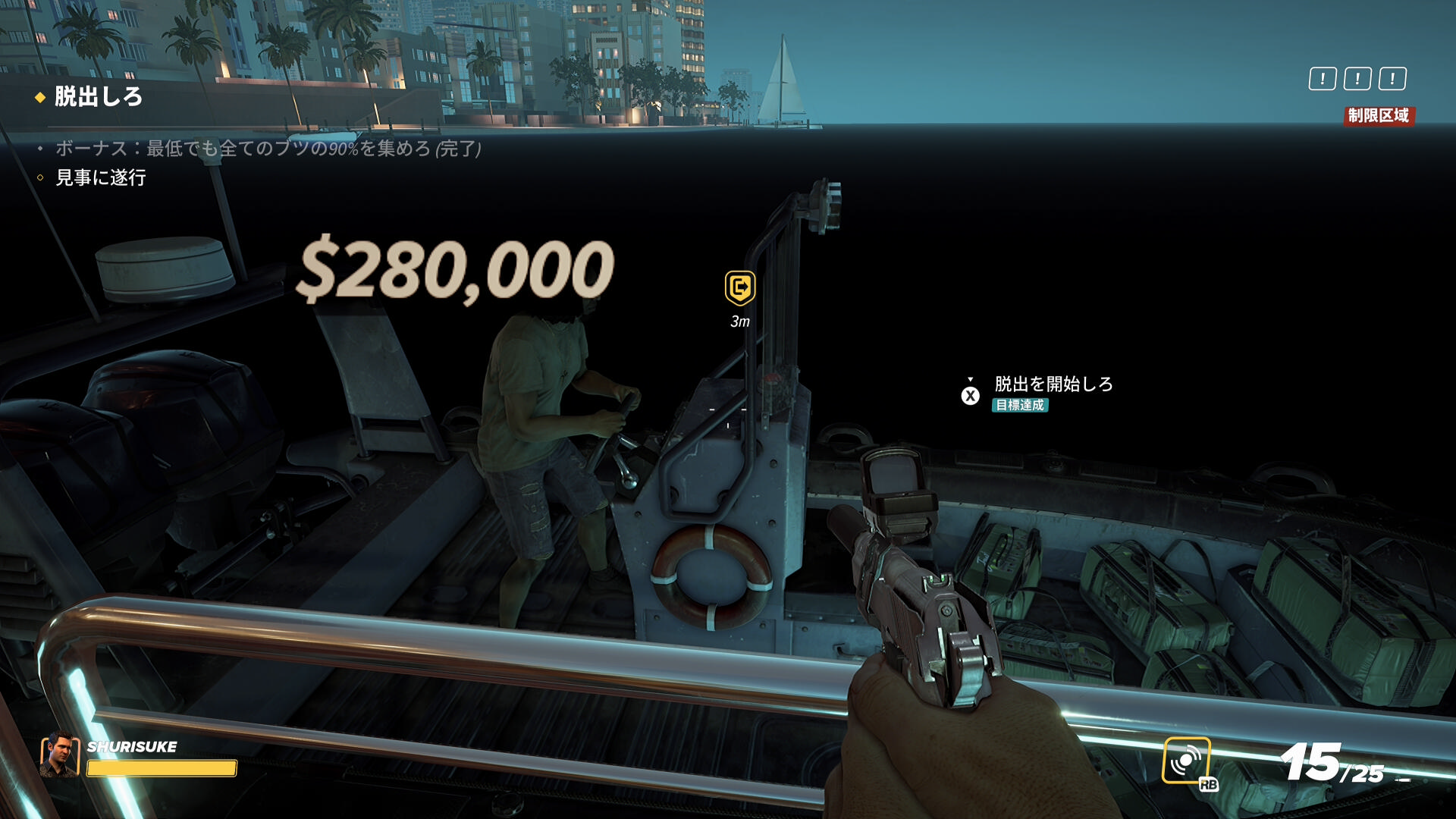- 脱出する際も2階の手すりからジャンプで乗り越えると桟橋を巡回している警察官に見つからない