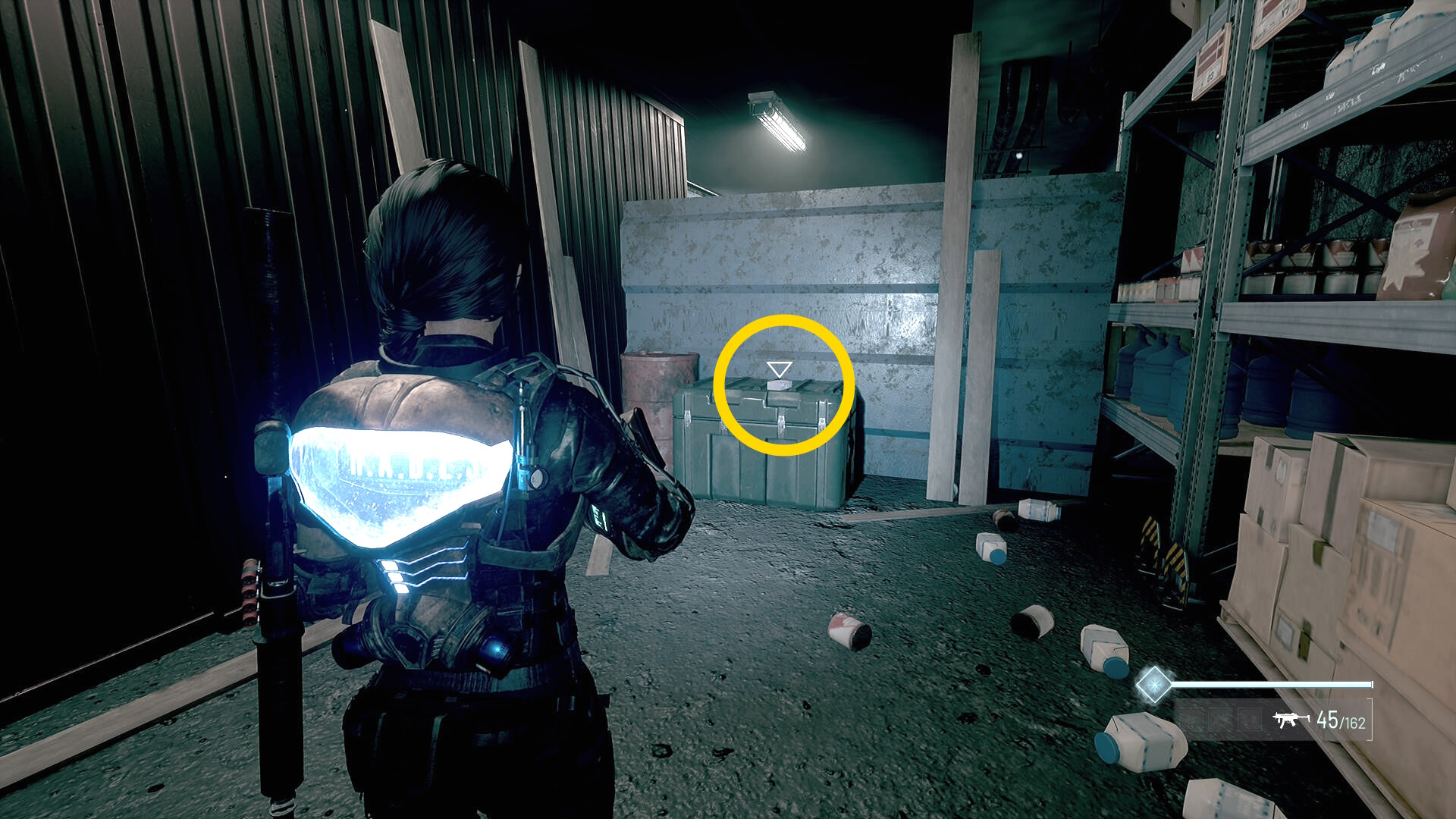 - 階段を下りたら右後ろに進み、木製の作業台に マシンガンの弾