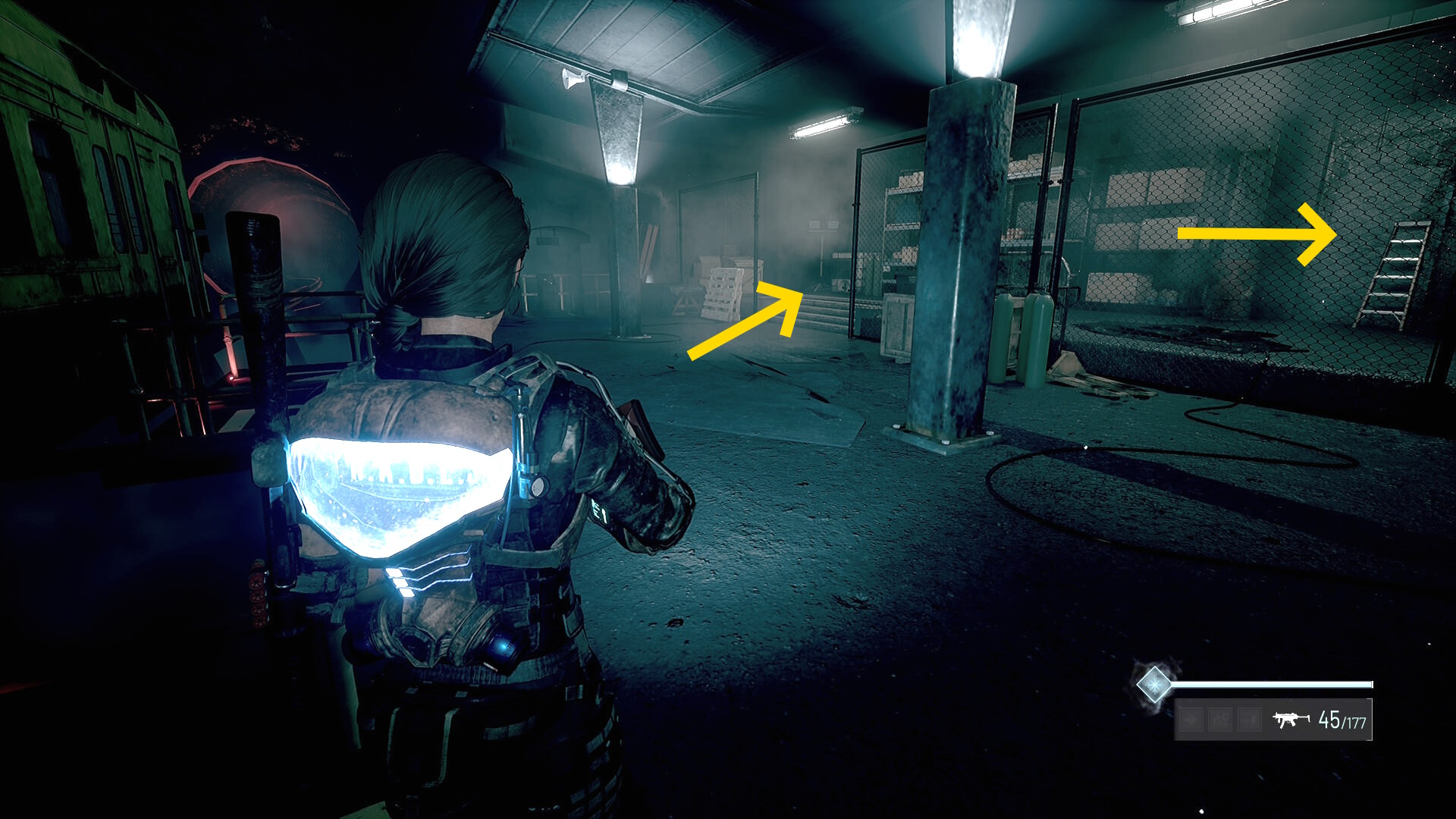 - 倉庫を出て、階段を下りる