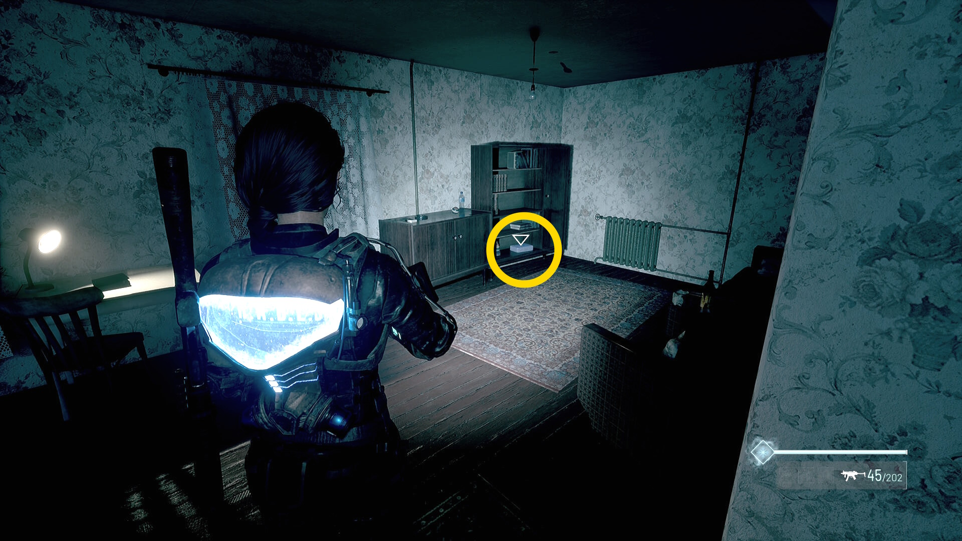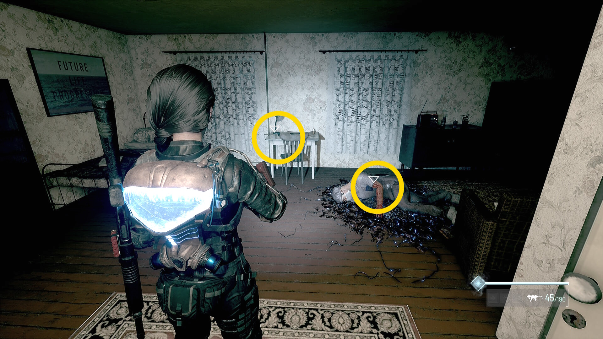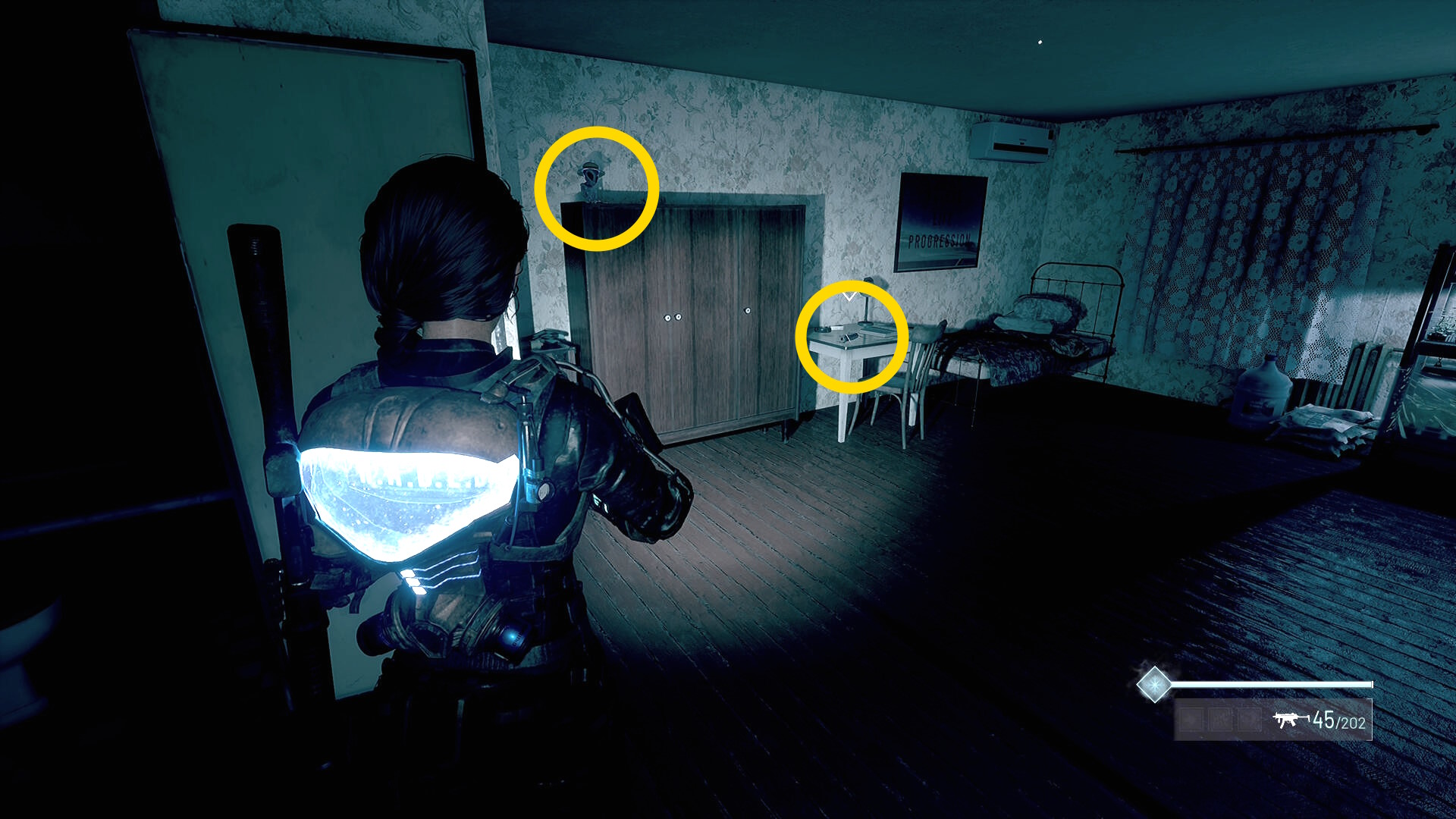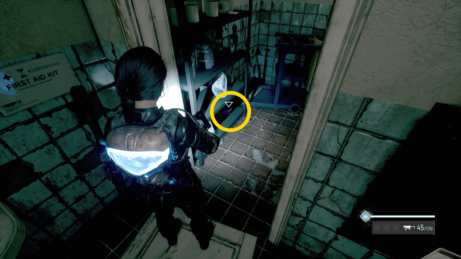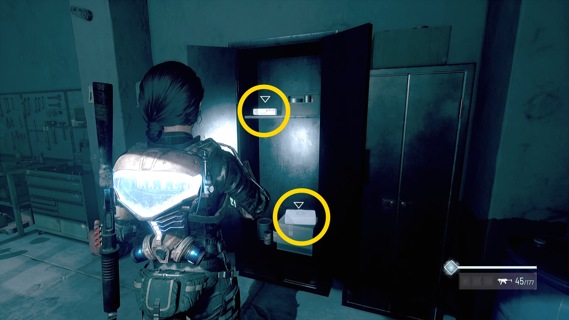 - 左の クローゼットの上に ラー(エイリアンの収集物:14/20)、その右の白い机上に 改良型ポンプ機構(武器アタッチメント:4/4)