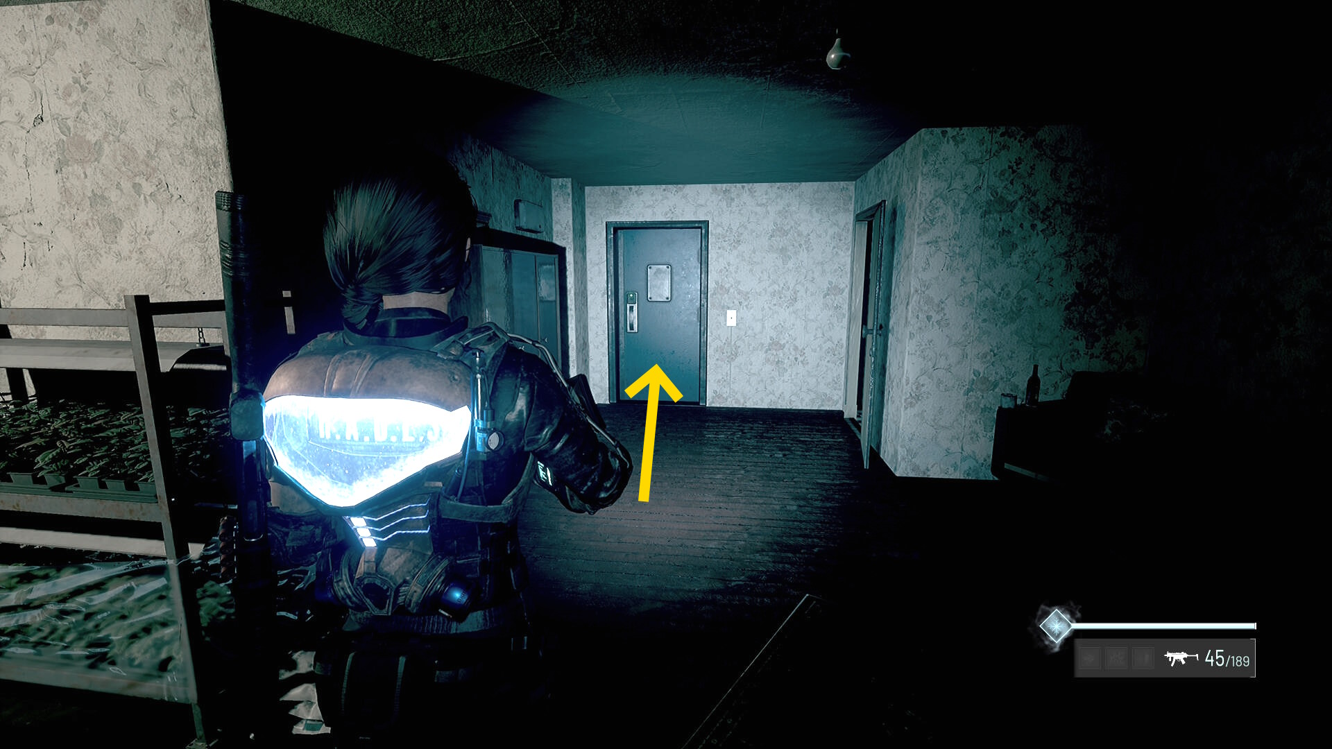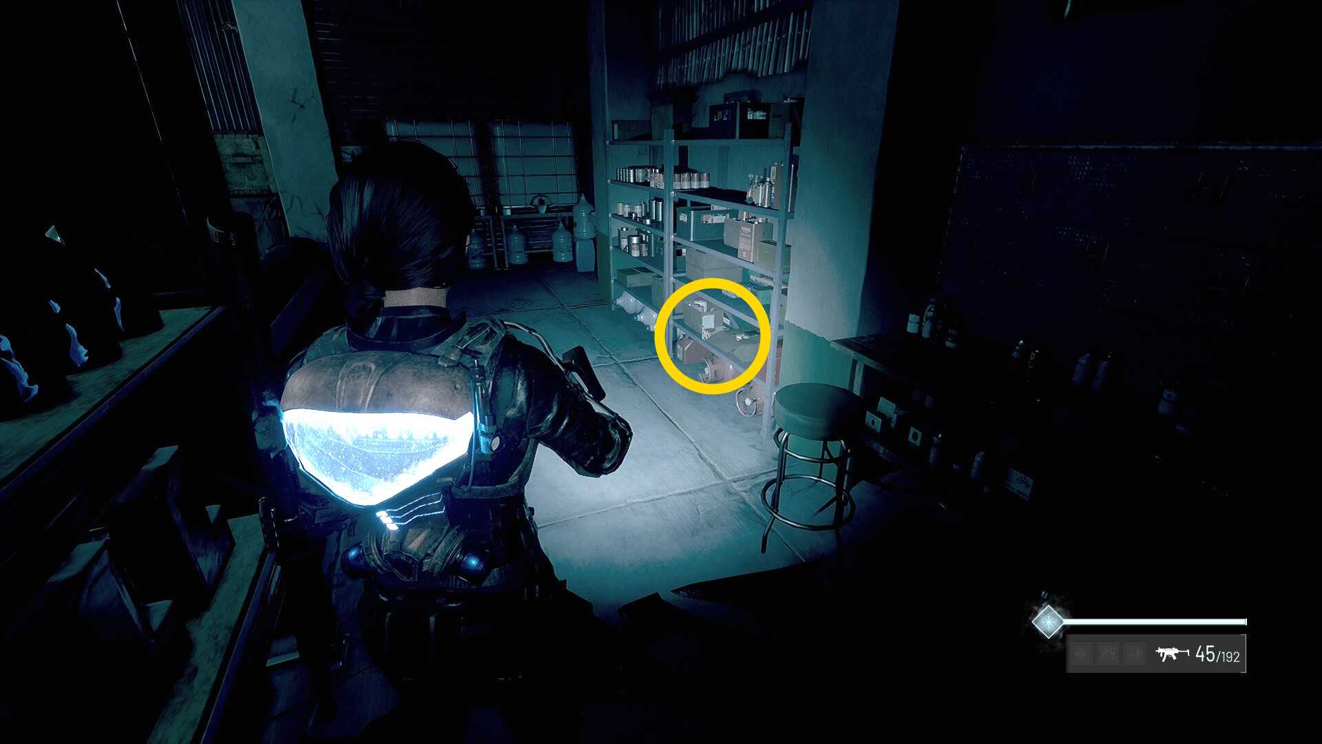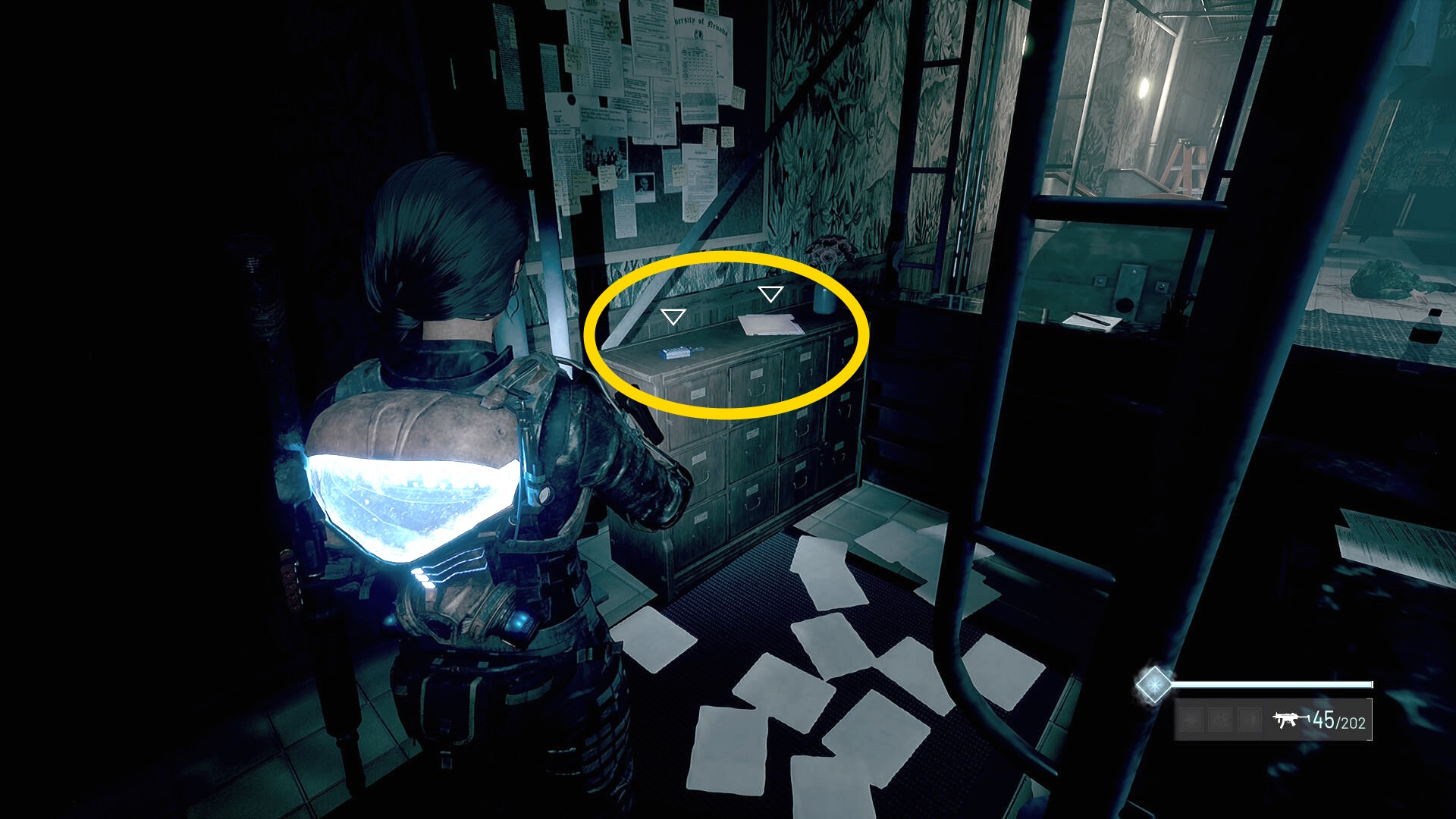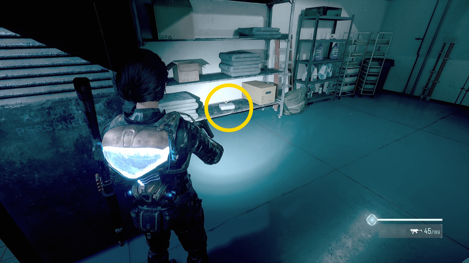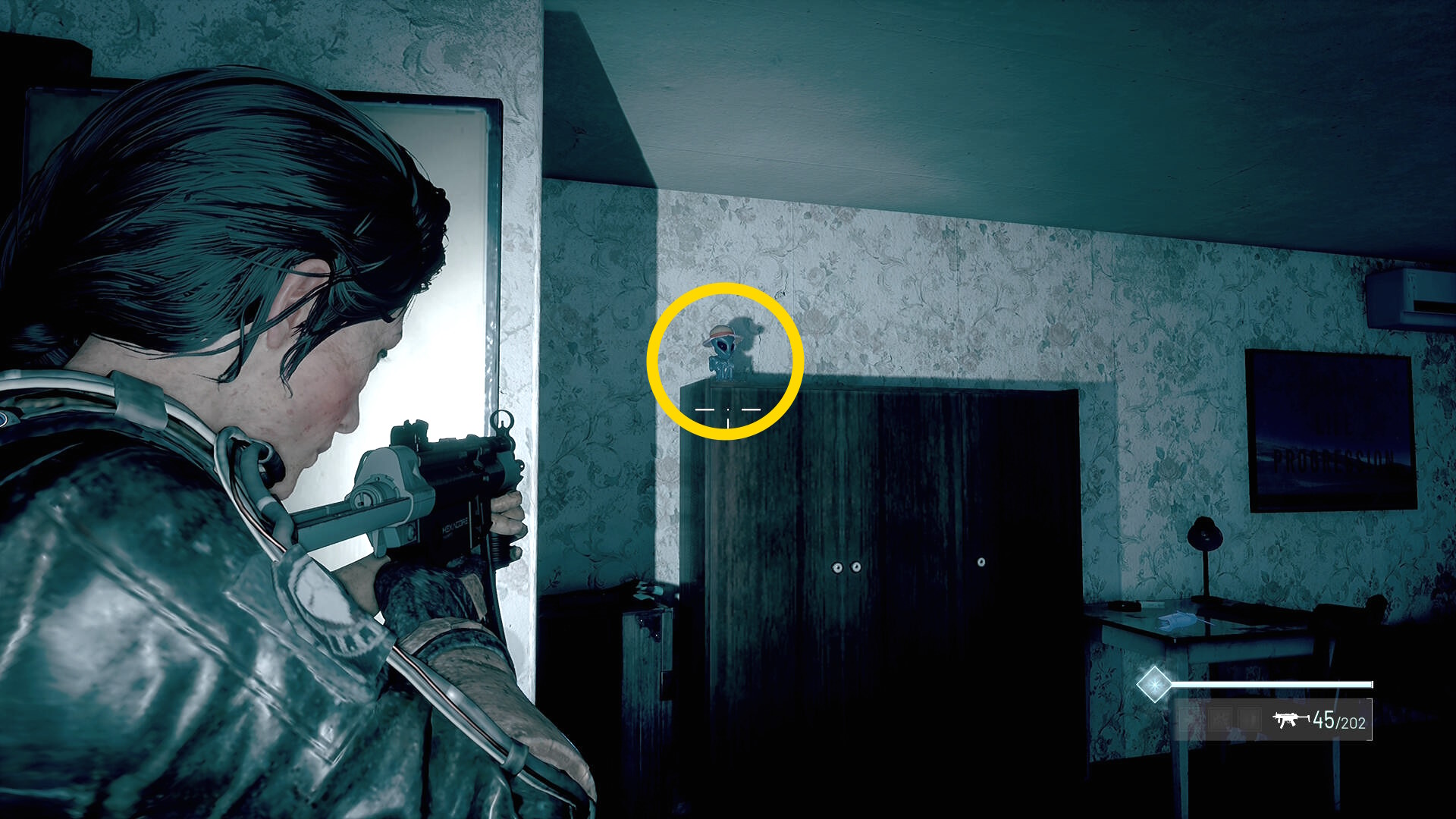 - 左の クローゼットの上に ラー(エイリアンの収集物:14/20)、その右の白い机上に 改良型ポンプ機構(武器アタッチメント:4/4)