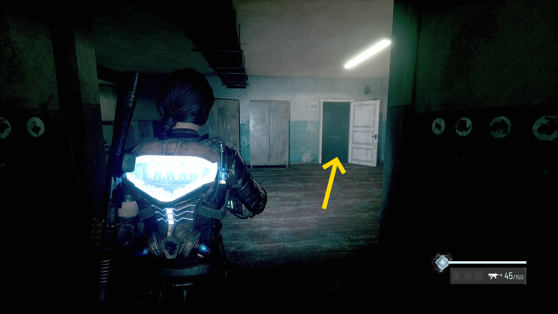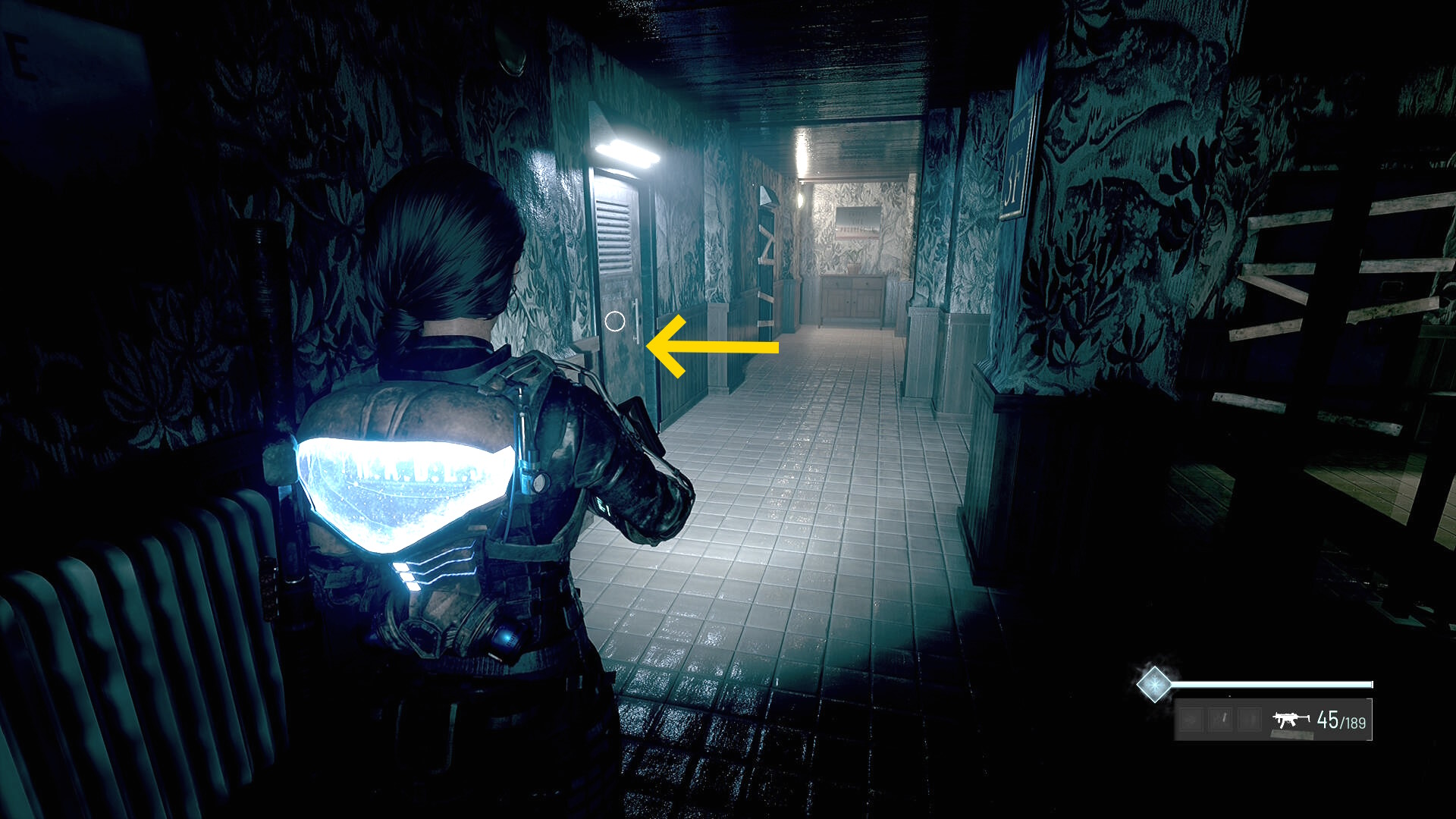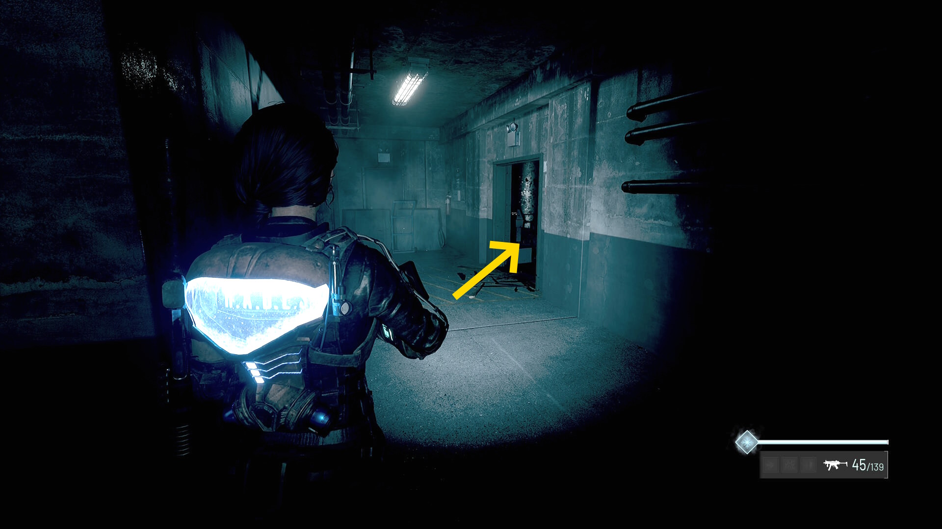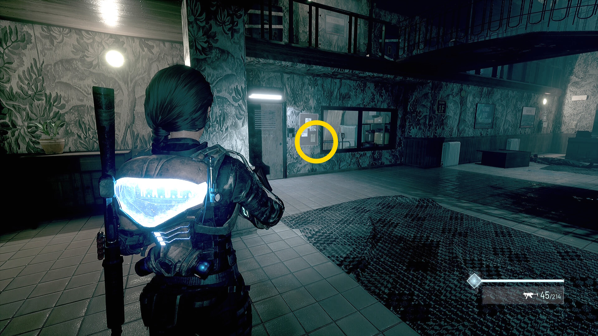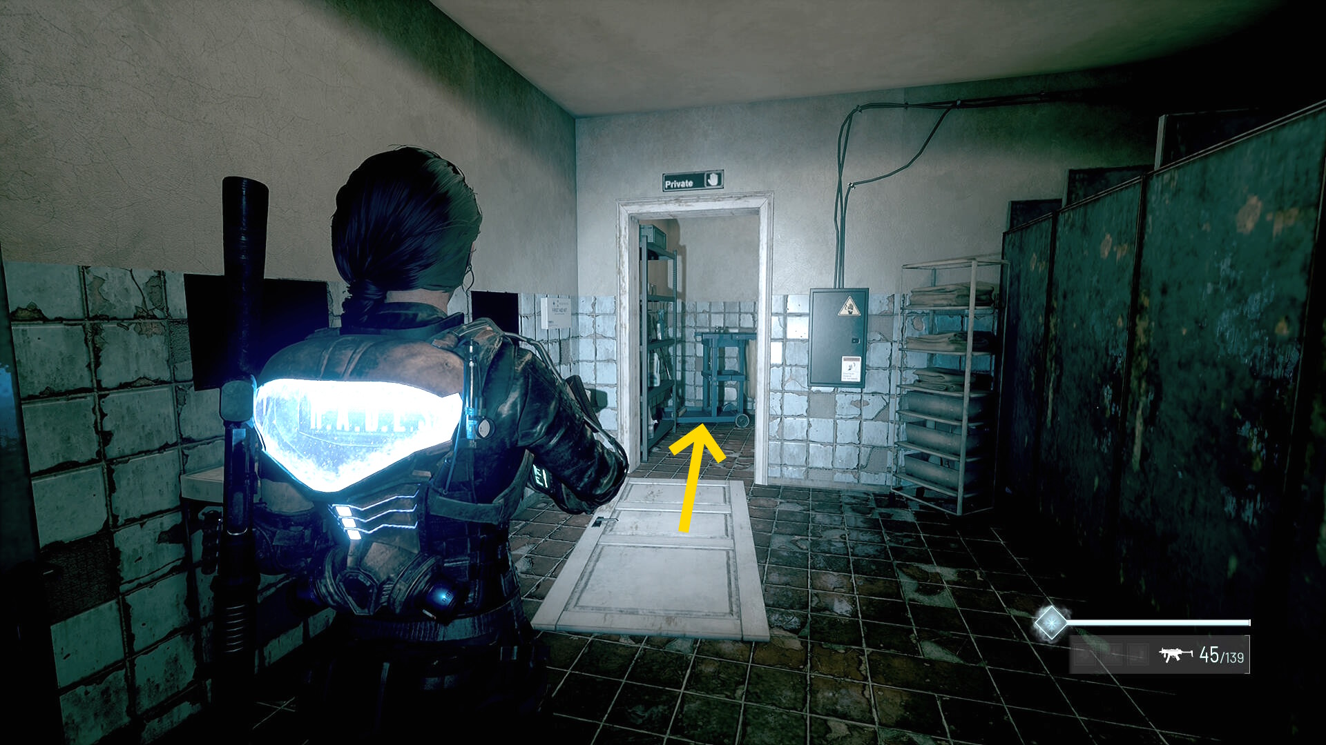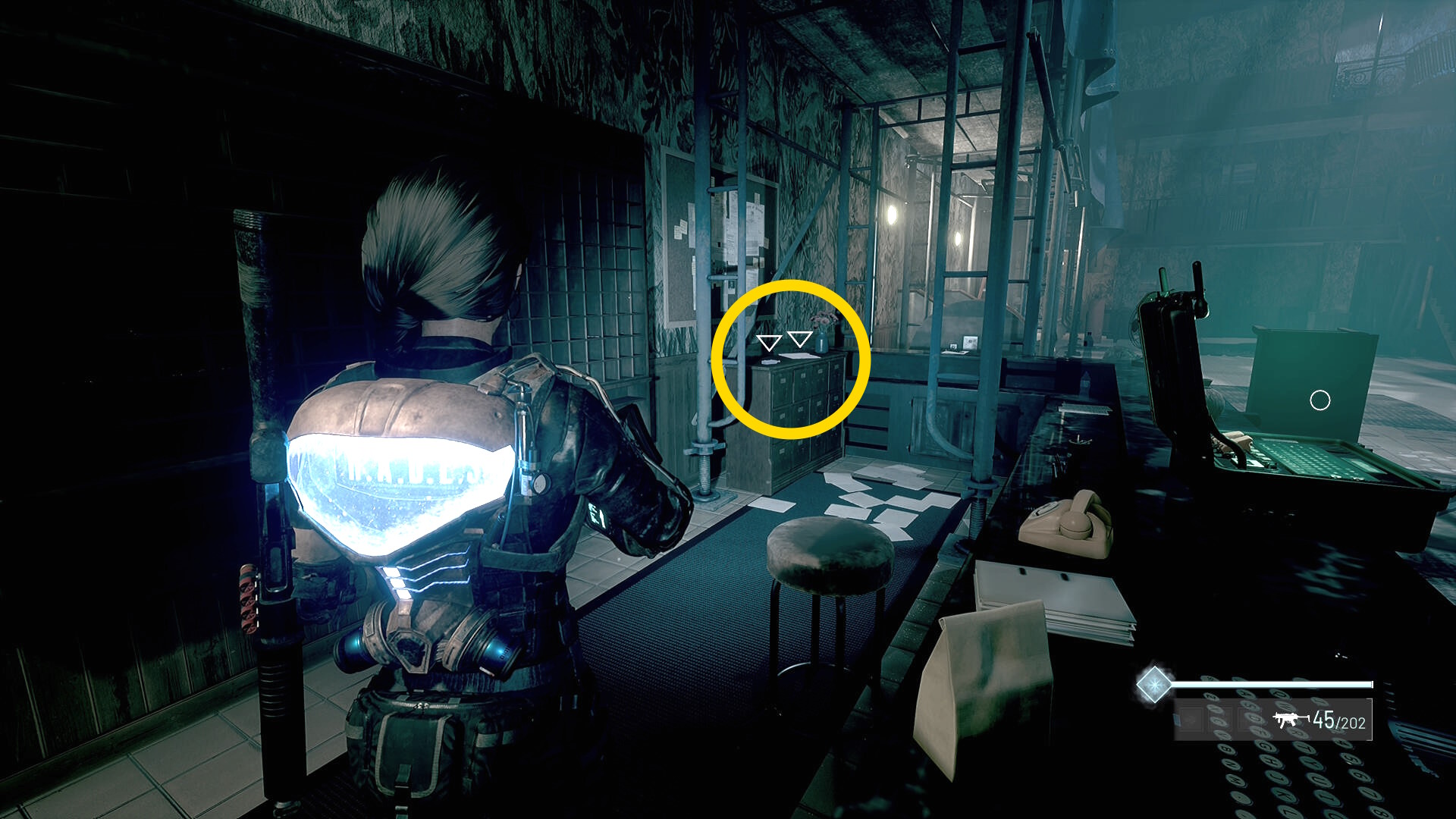 - 左の クローゼットの上に ラー(エイリアンの収集物:14/20)、その右の白い机上に 改良型ポンプ機構(武器アタッチメント:4/4)