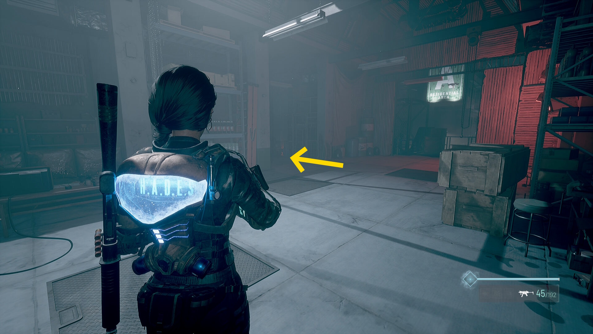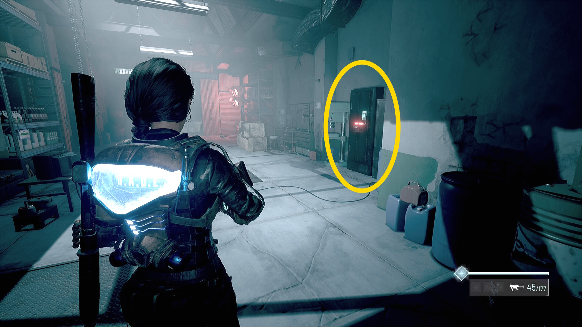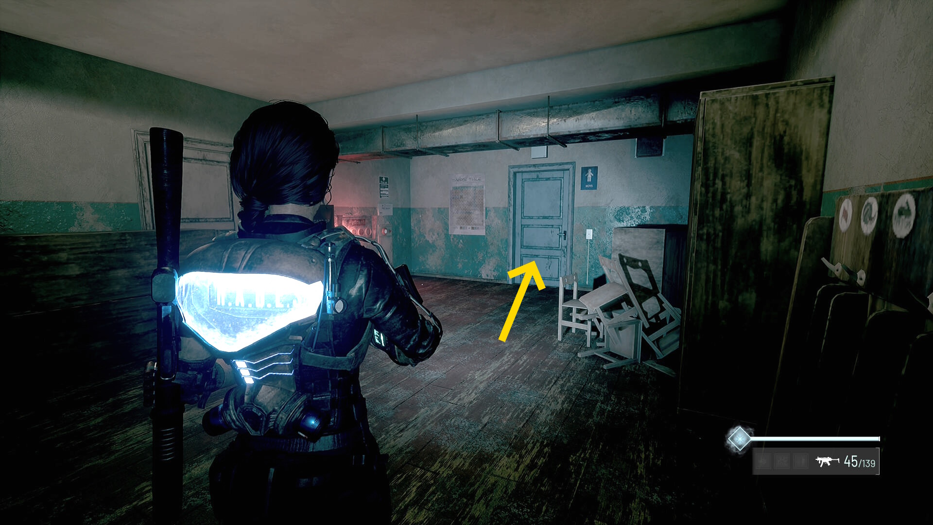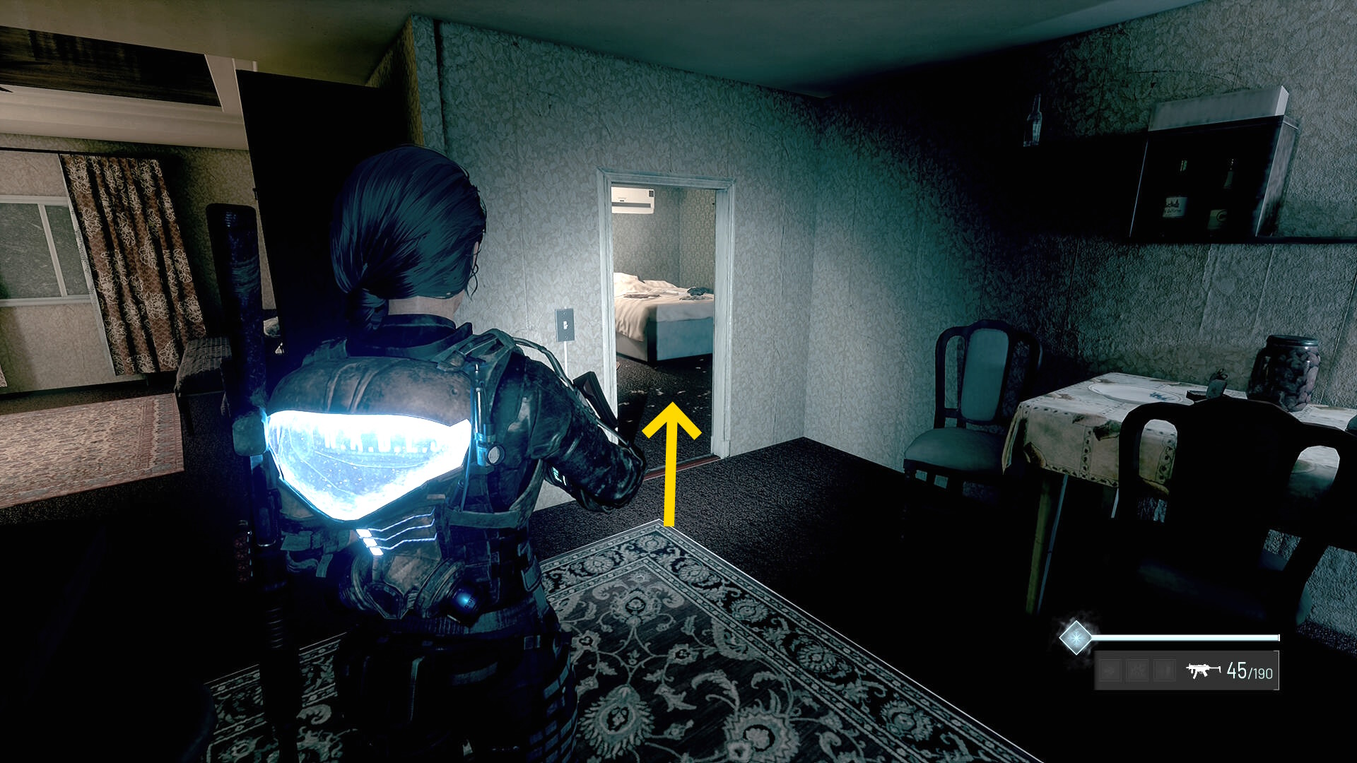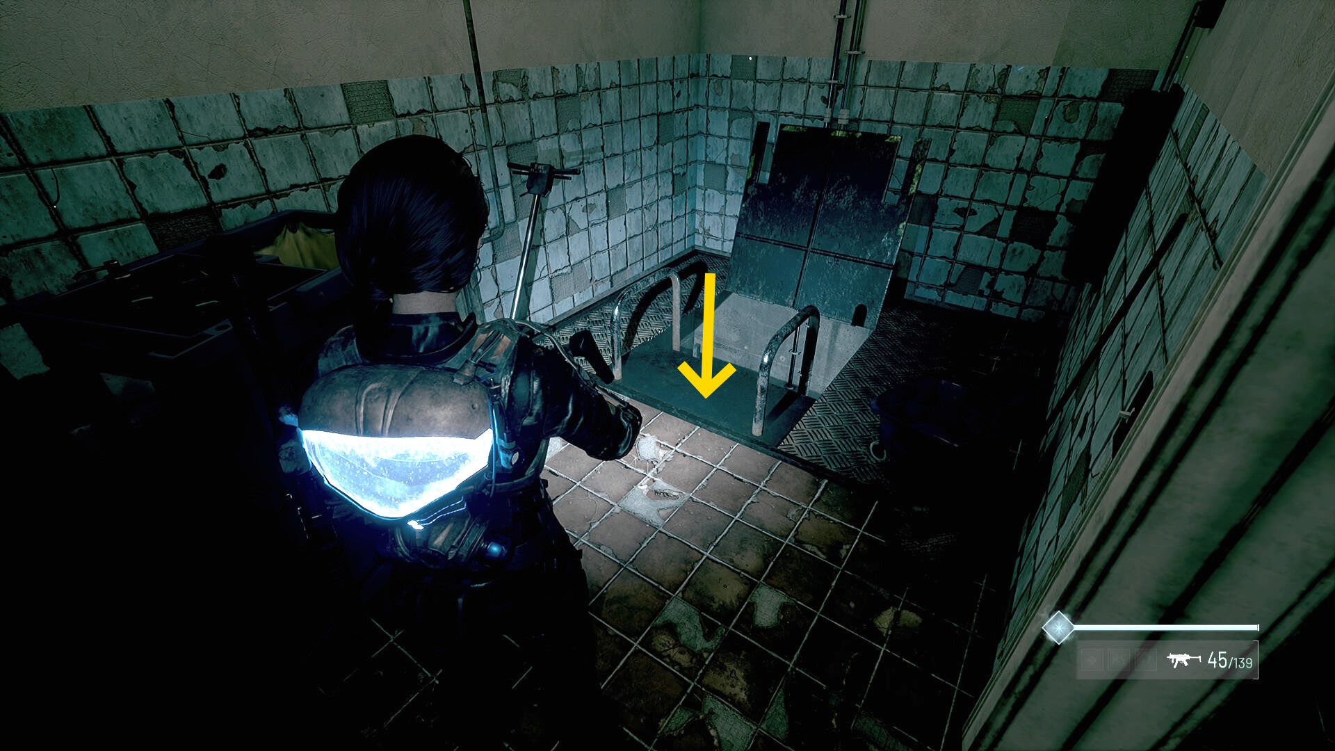 - 左の クローゼットの上に ラー(エイリアンの収集物:14/20)、その右の白い机上に 改良型ポンプ機構(武器アタッチメント:4/4)