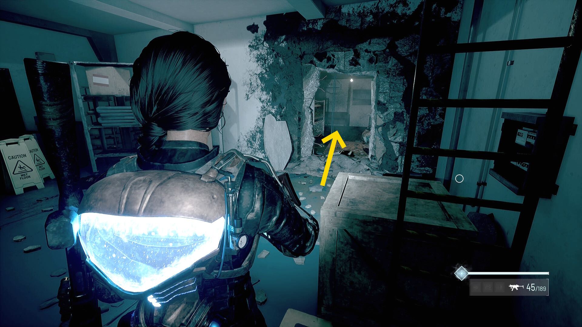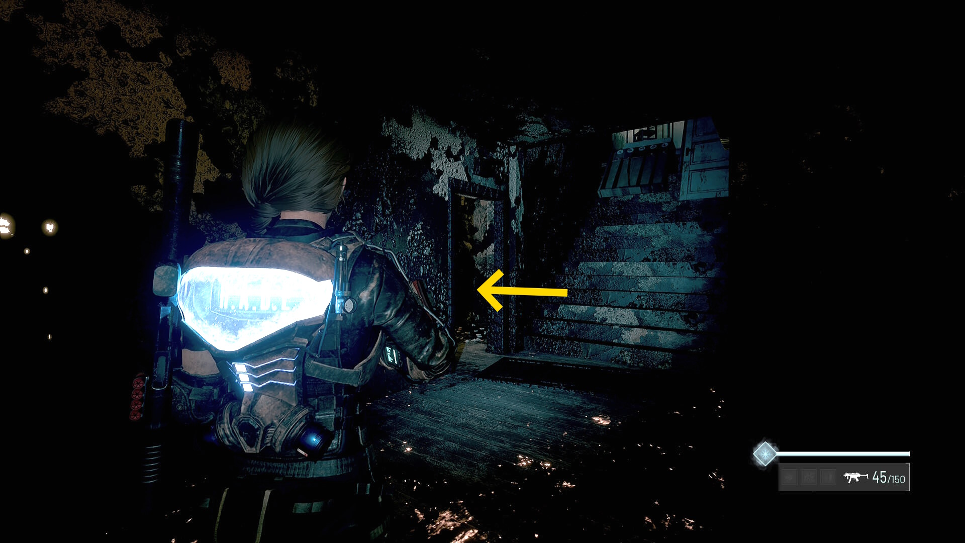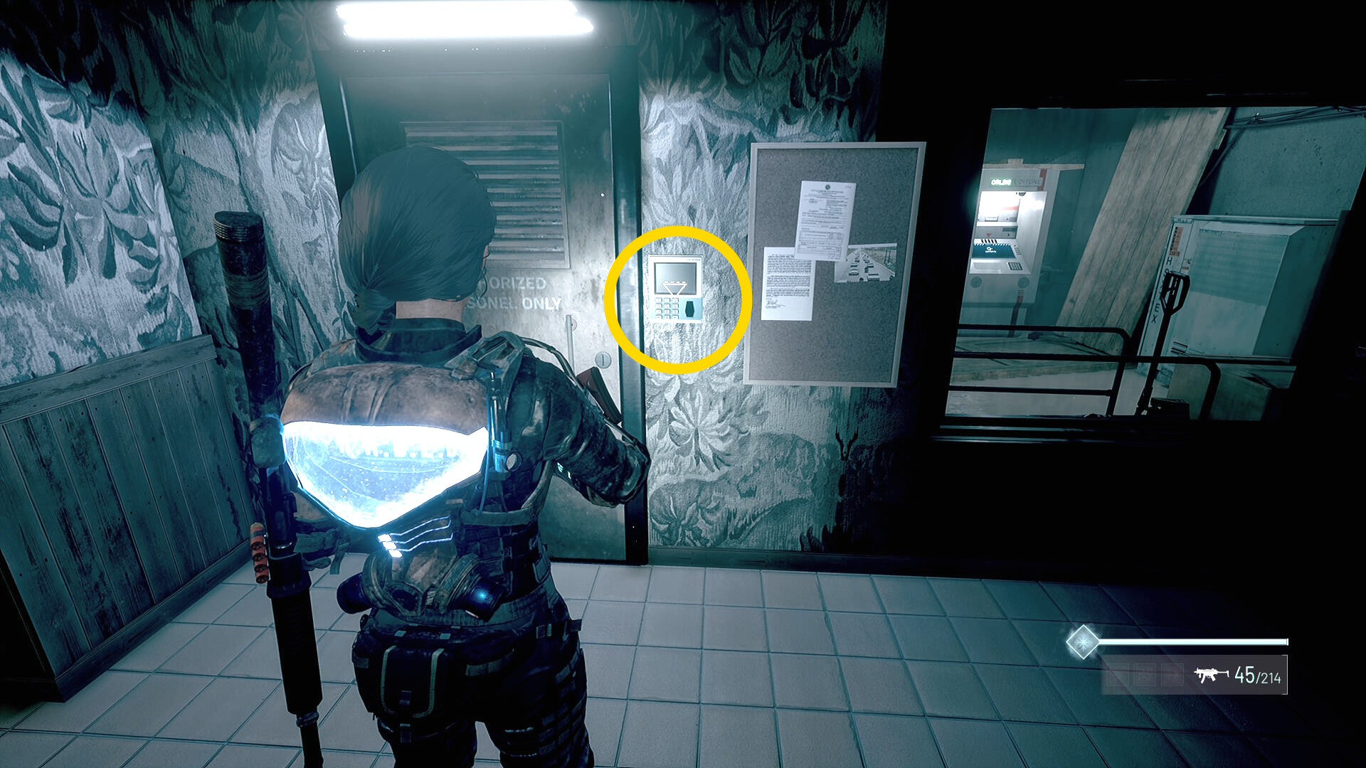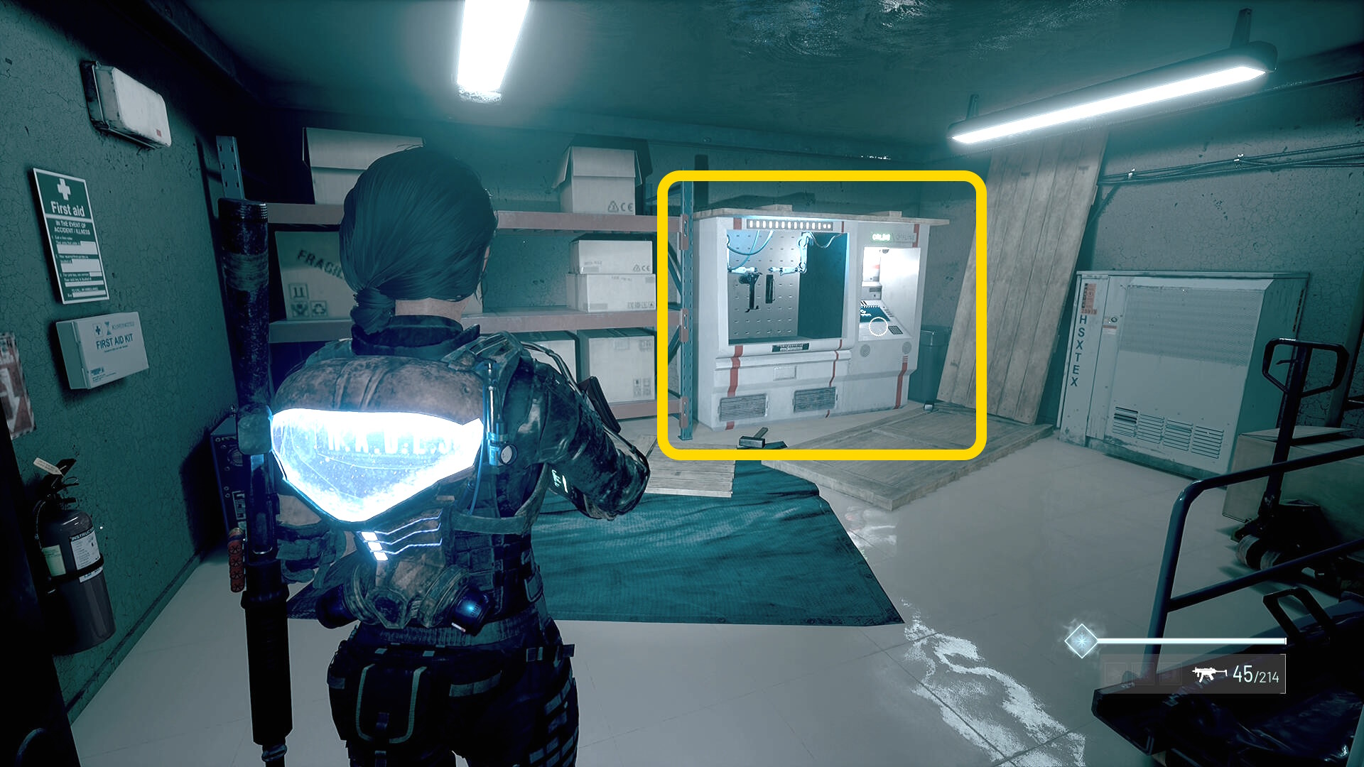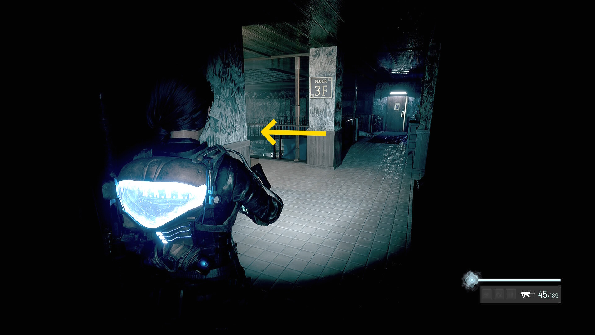 - 左の クローゼットの上に ラー(エイリアンの収集物:14/20)、その右の白い机上に 改良型ポンプ機構(武器アタッチメント:4/4)