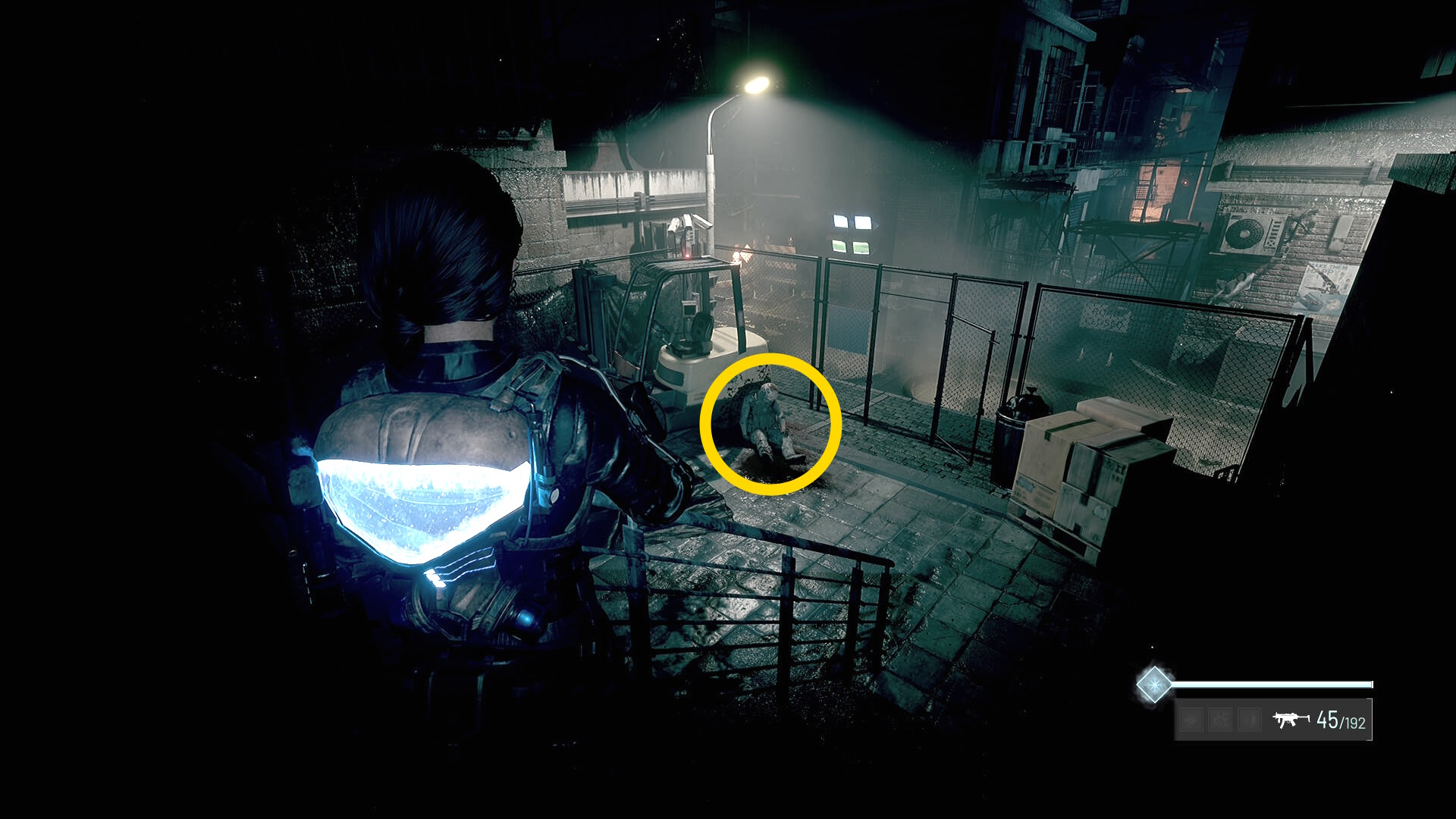 - フォークリフトに寄りかかる死体から マシンガンの弾 を回収