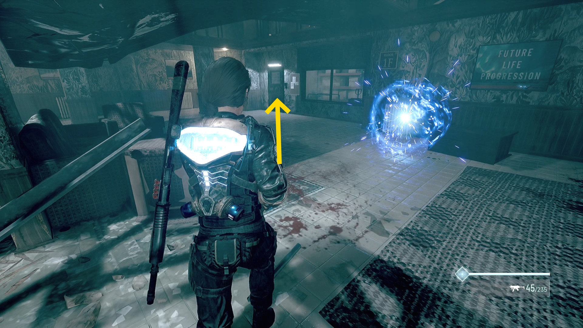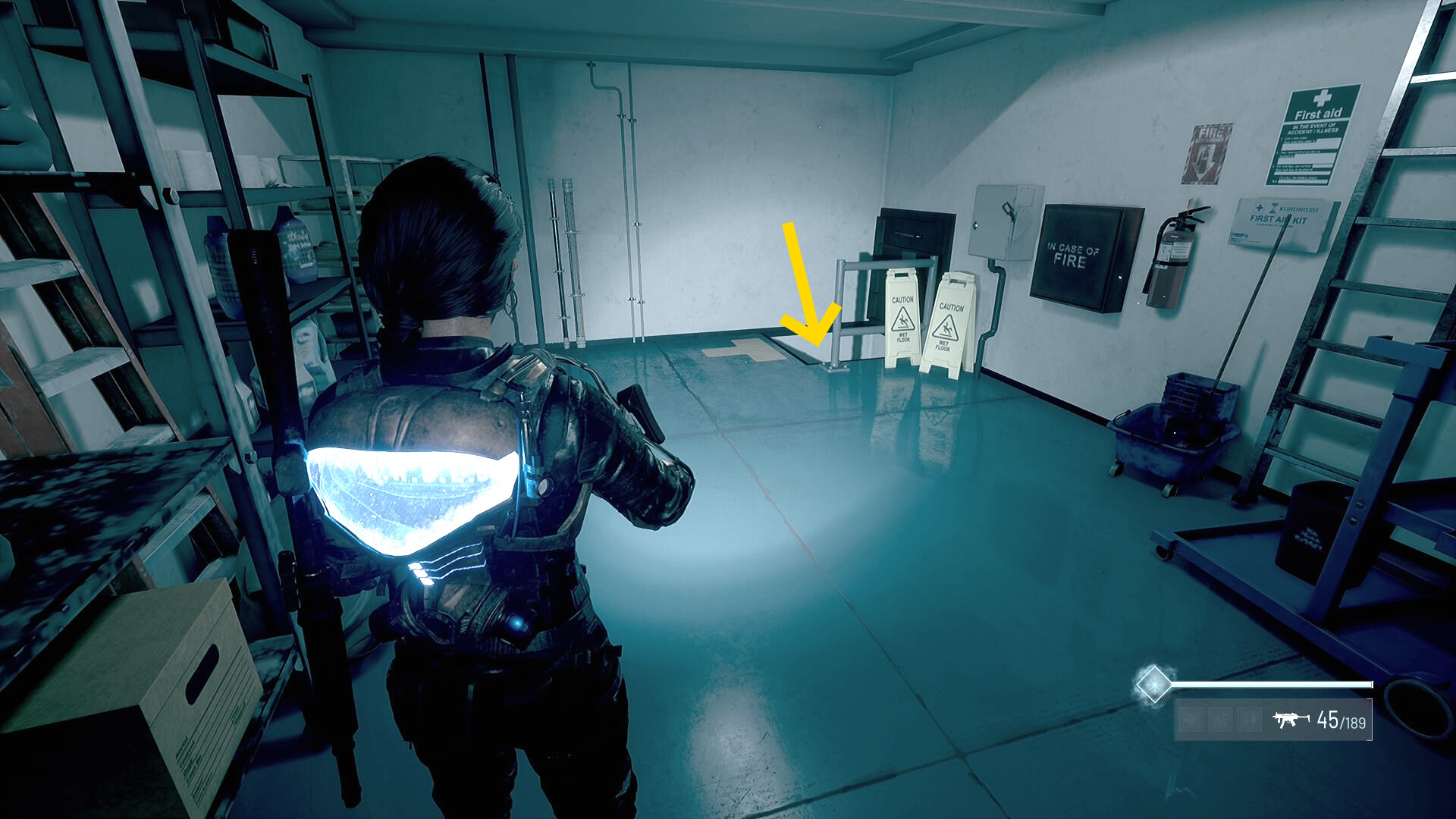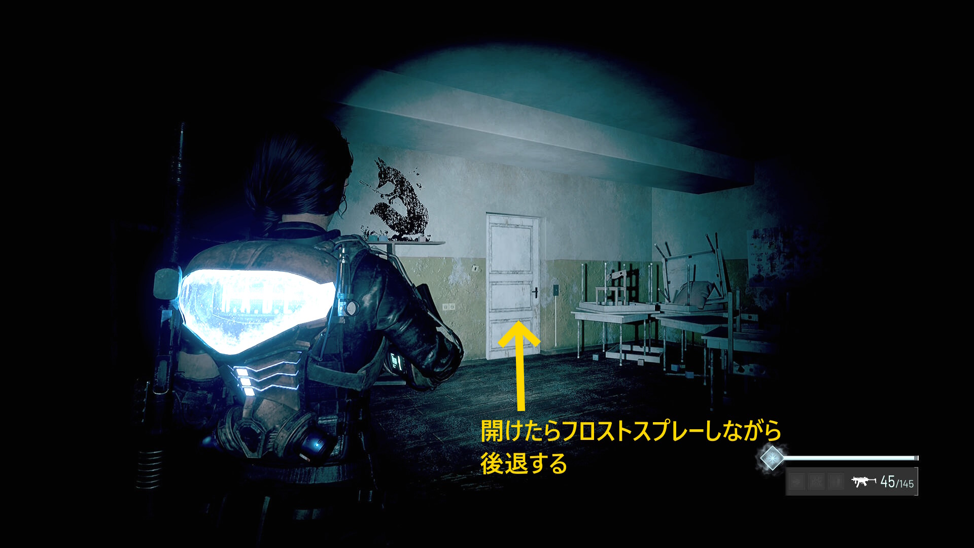 - キル後、左の白いドアを開けるが、すぐ青デコイが襲ってくるため、ドアを開けたらフロストスプレーを噴射しながら後退するとよい