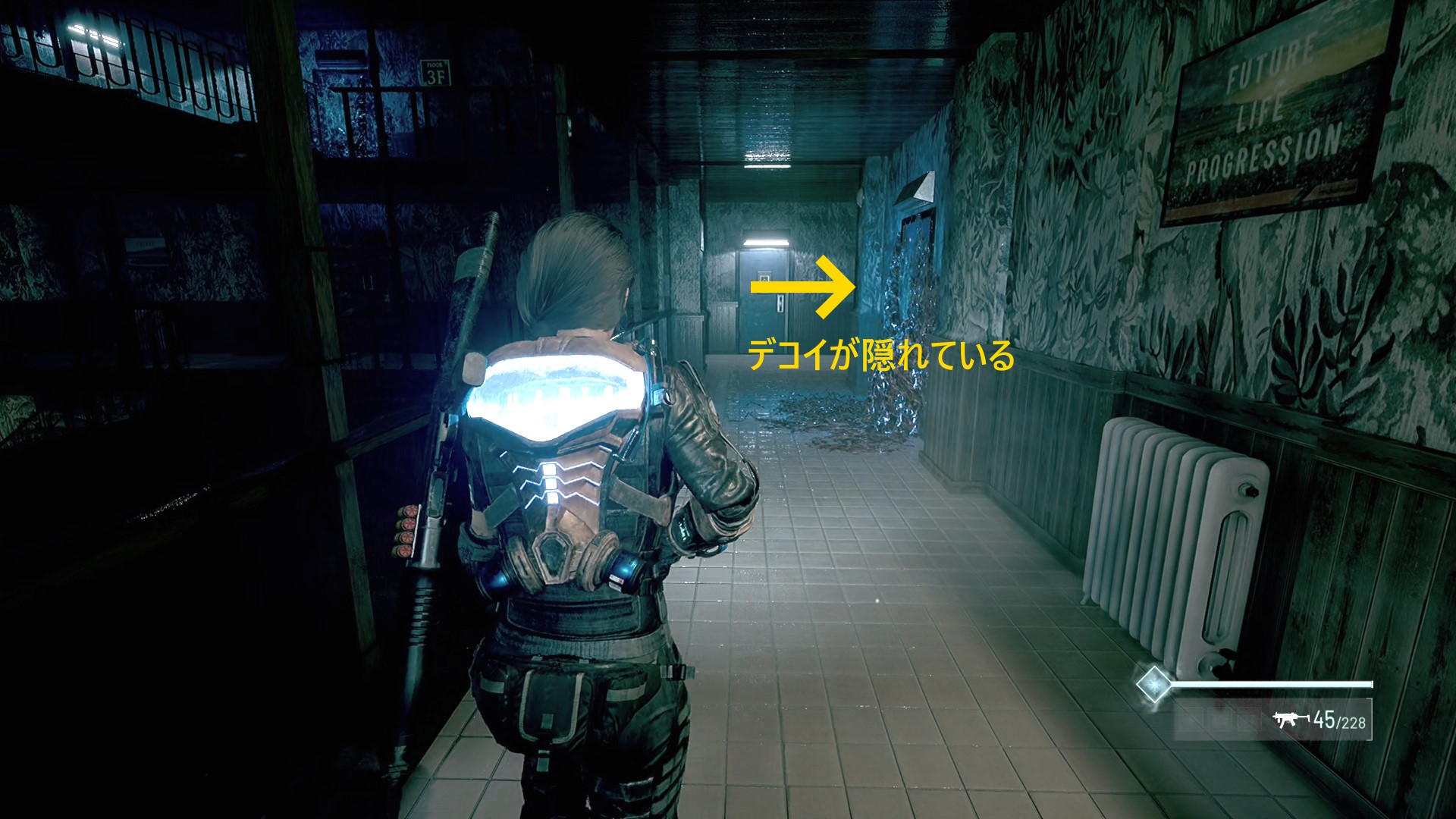 - 突き当りが丁字路になっており、右にデコイが1体隠れているので注意