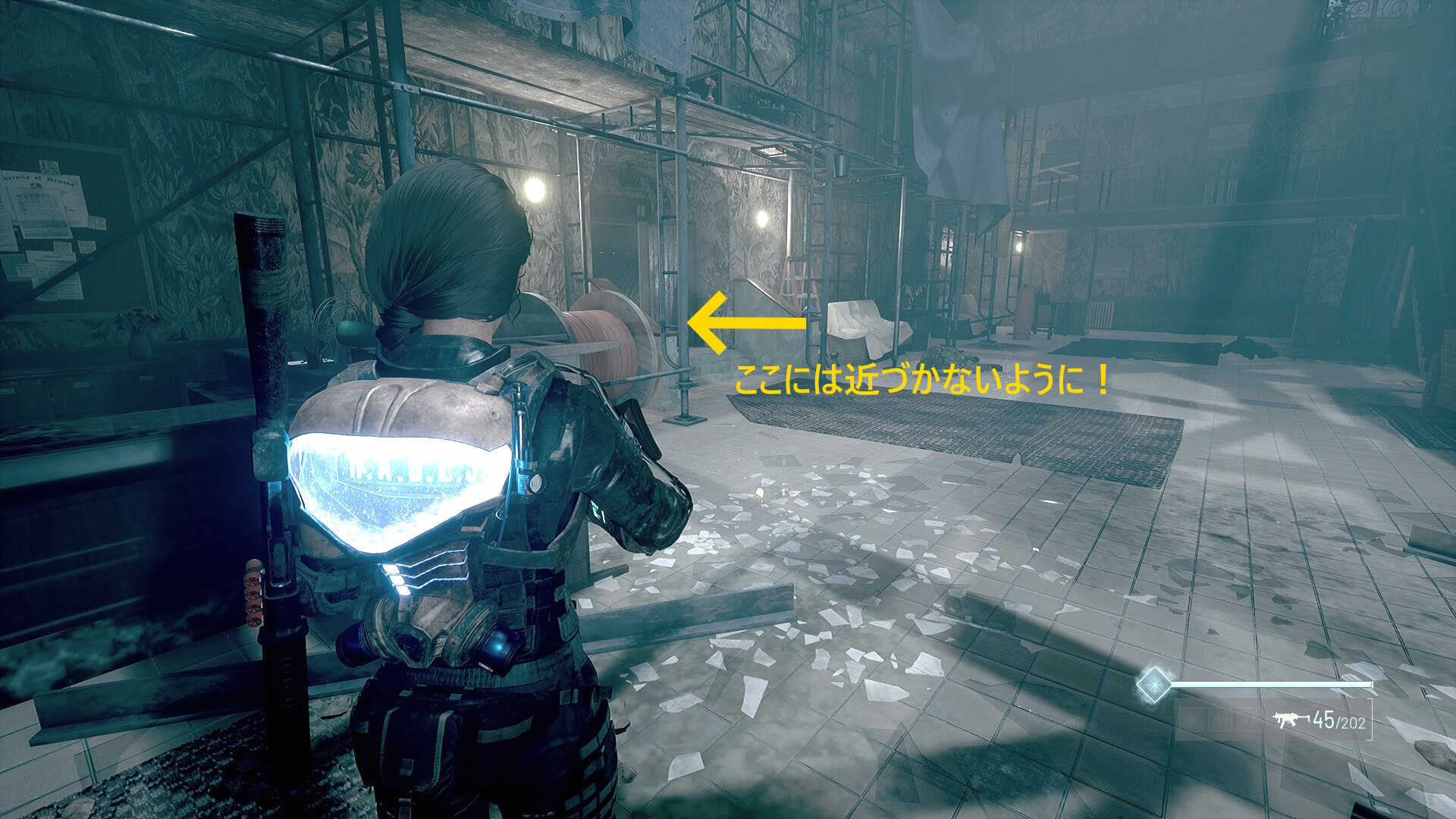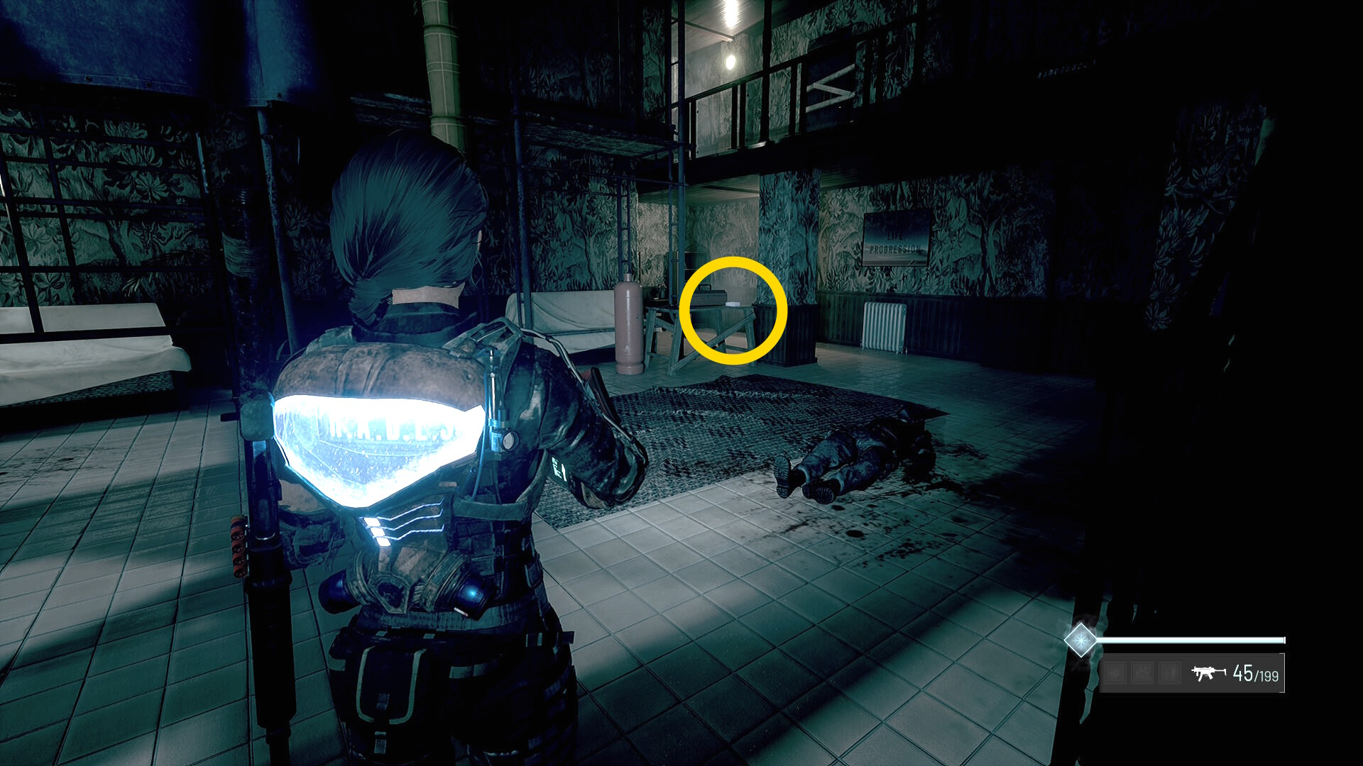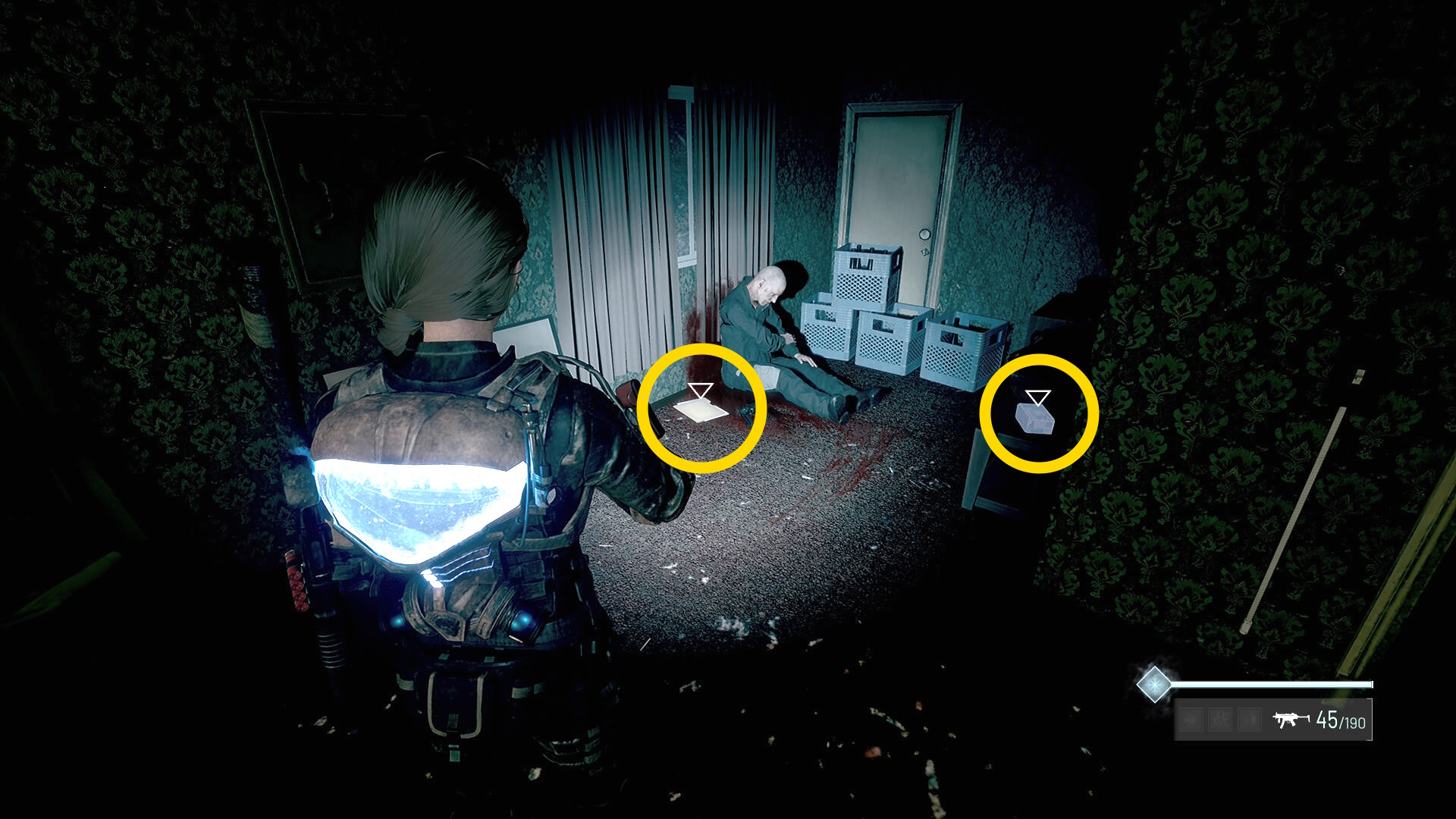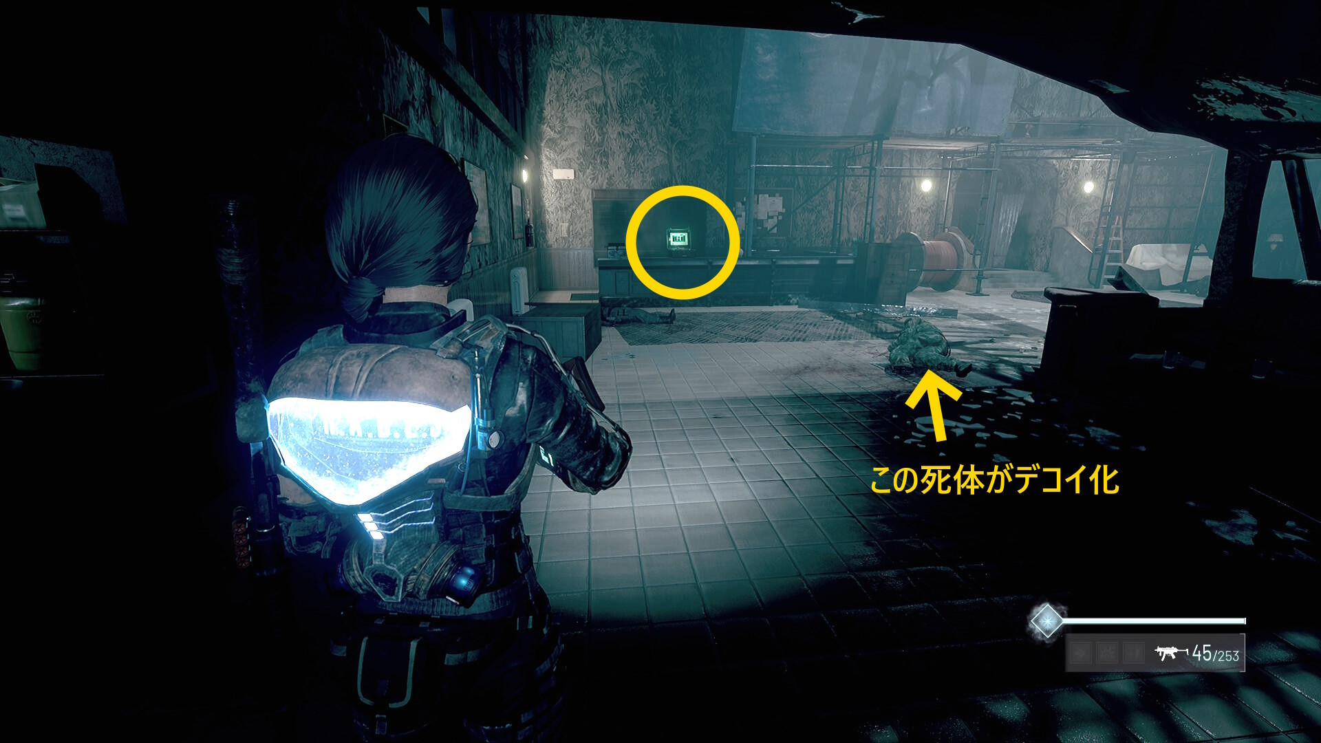 - この部屋を出て廊下を戻ると赤い玉が向かってきて、近くの死体が赤デコイ化するのでキル