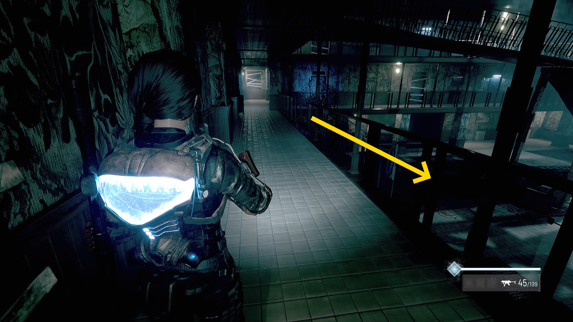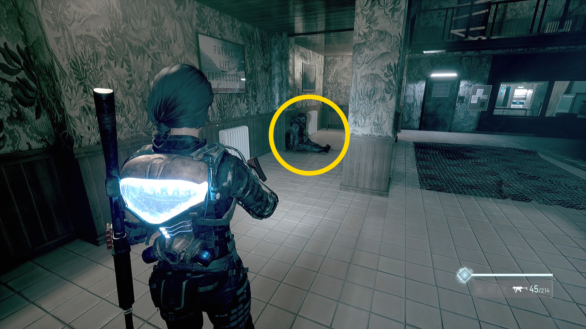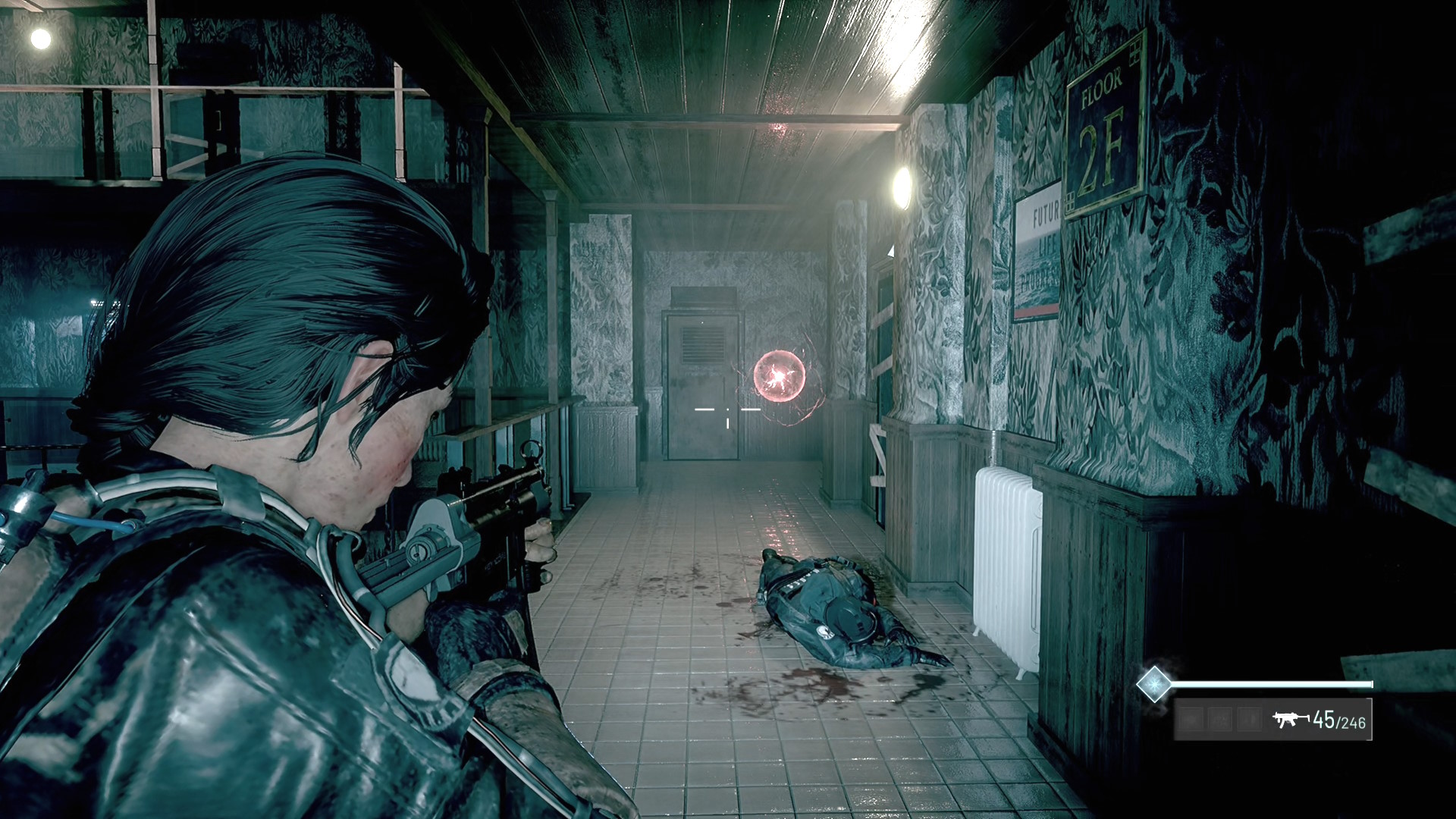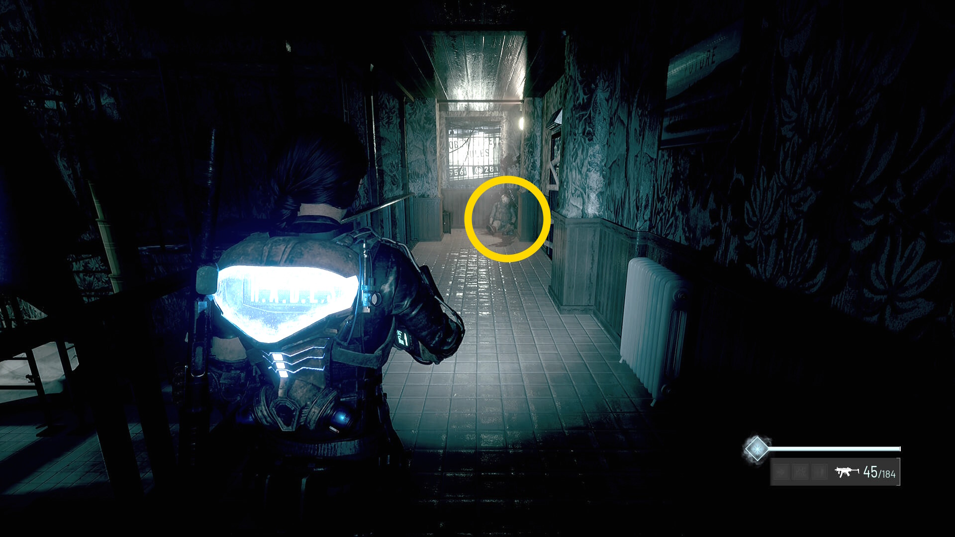 - この部屋を出て廊下を戻ると赤い玉が向かってきて、近くの死体が赤デコイ化するのでキル