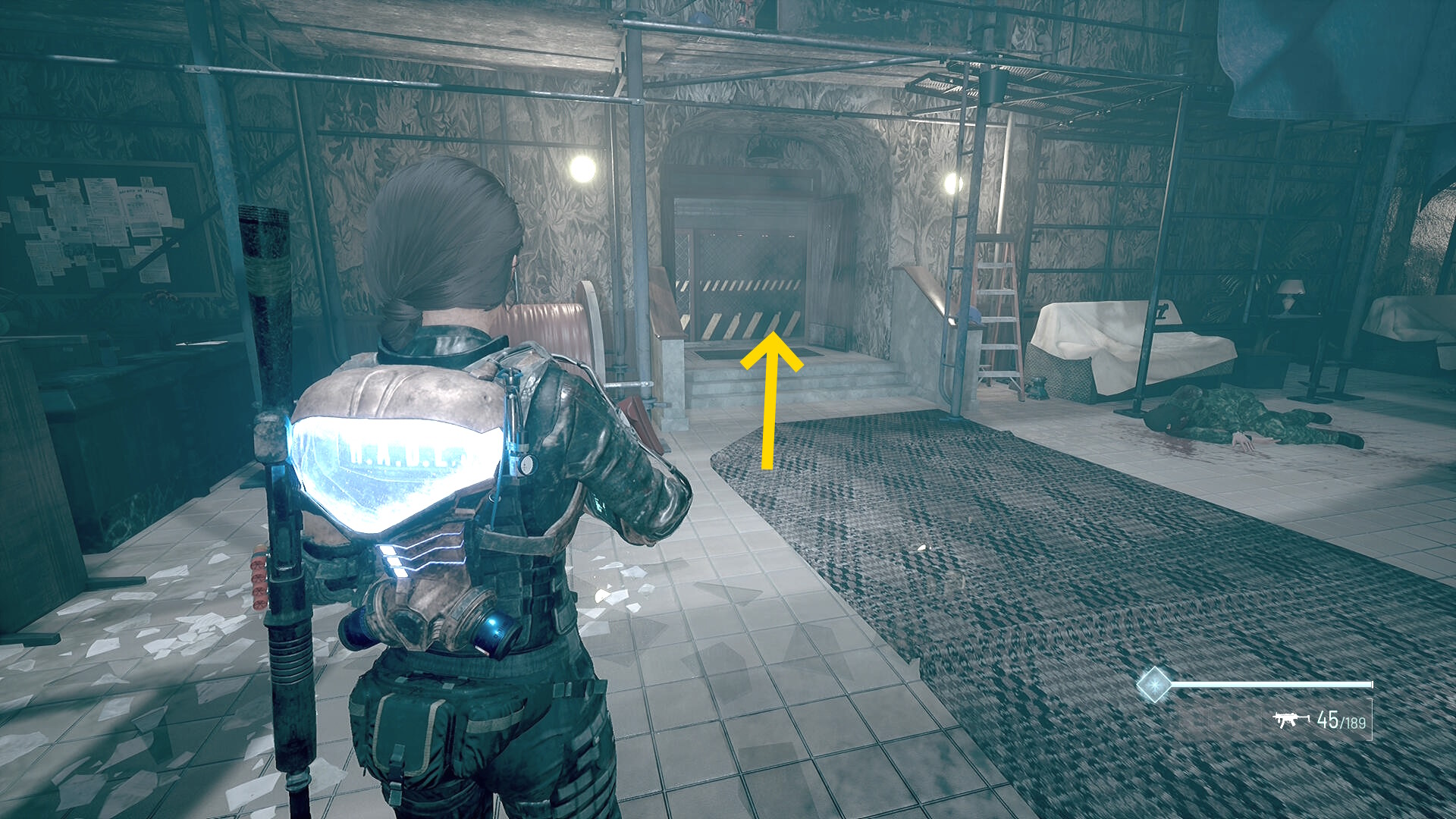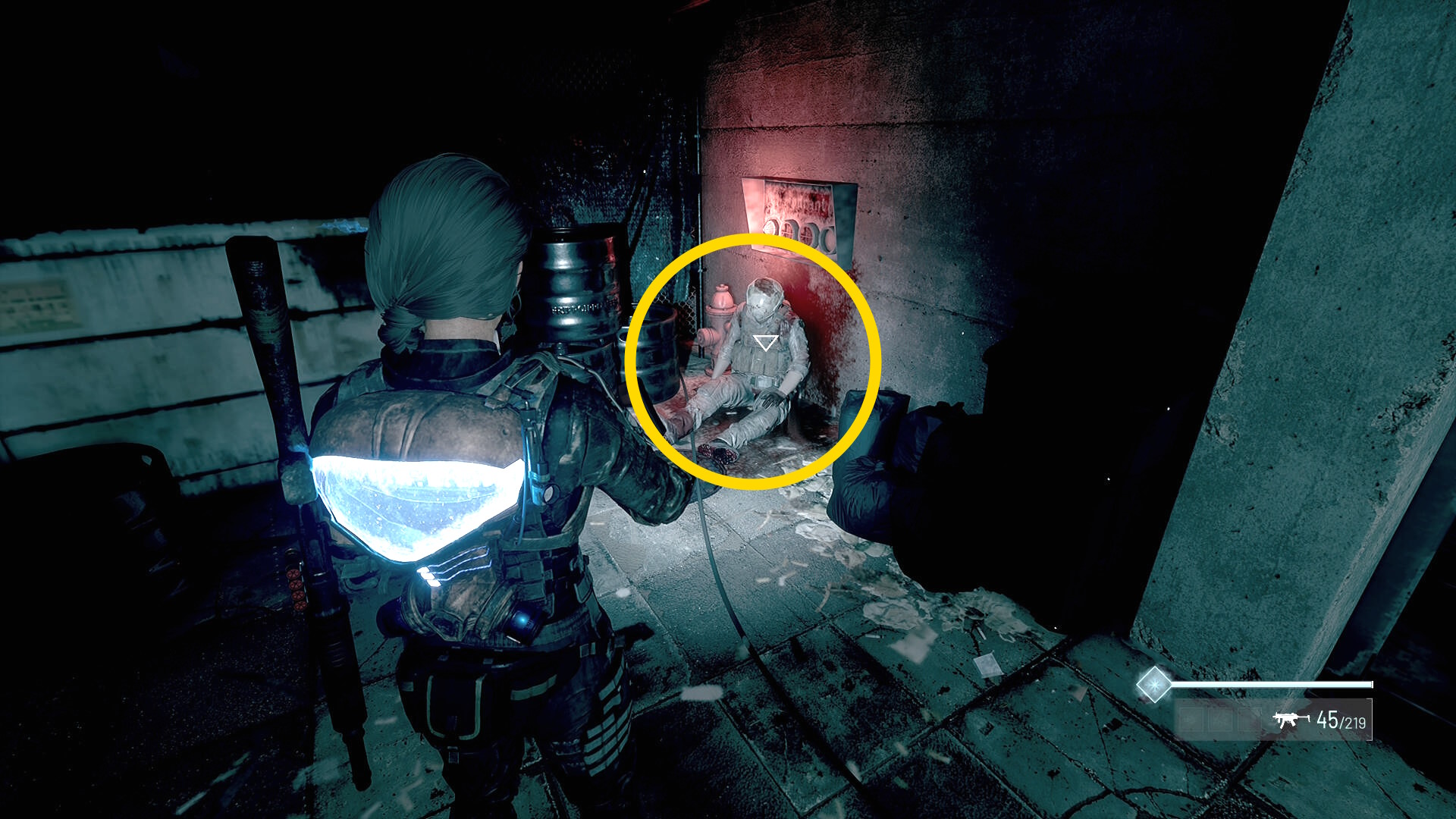 - ぐるっと移動していくと座位の死体があり、ショットガンの弾 が回収できる