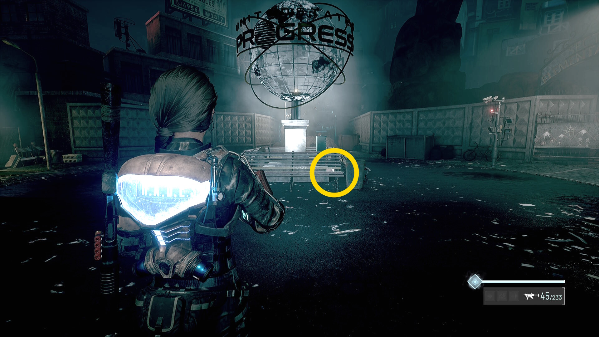 - 地球儀風のオブジェに向き直し、ベンチの右端に ショットガンの弾