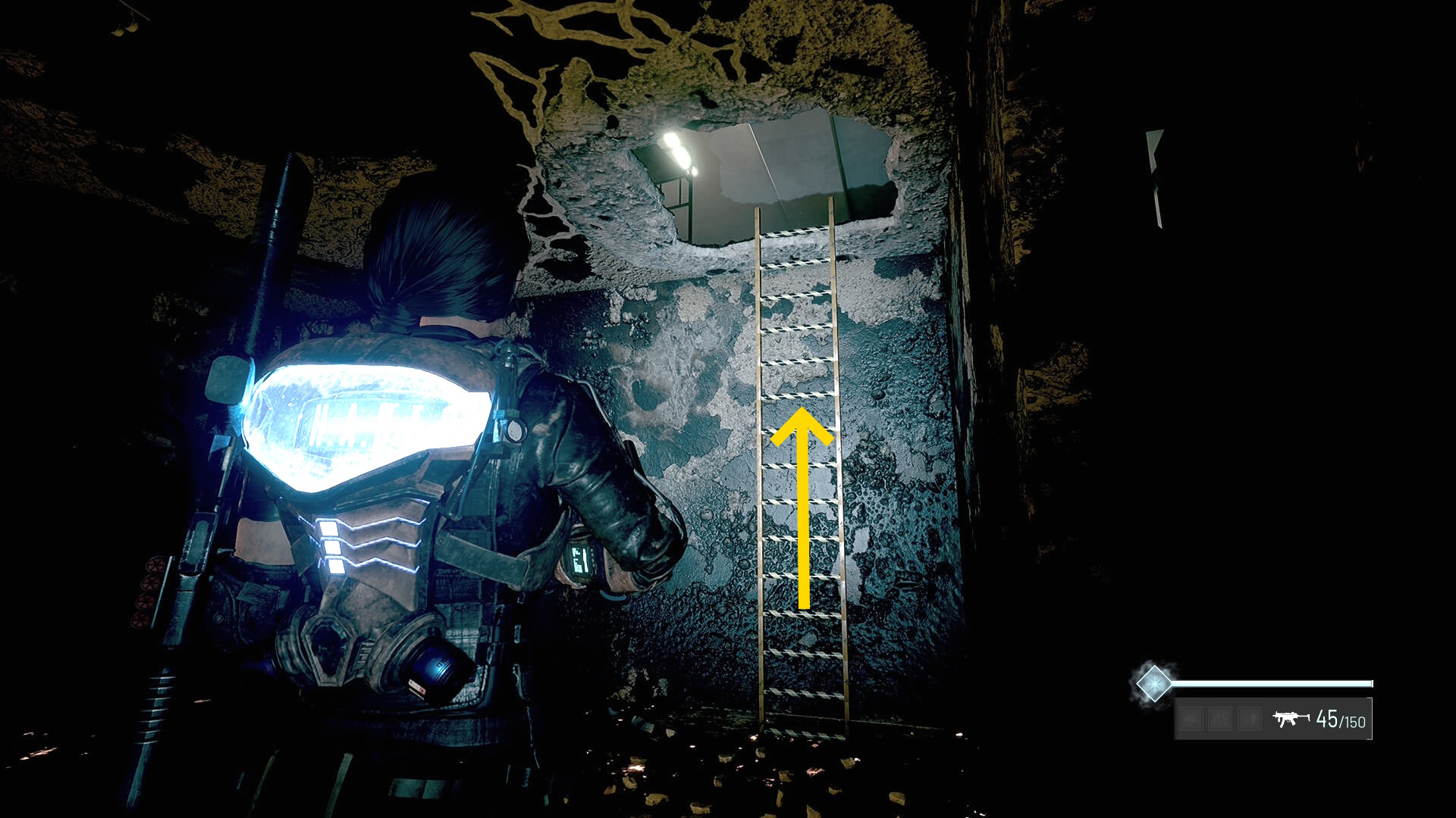 - 階段を下りた先、突き当りのハシゴを登る