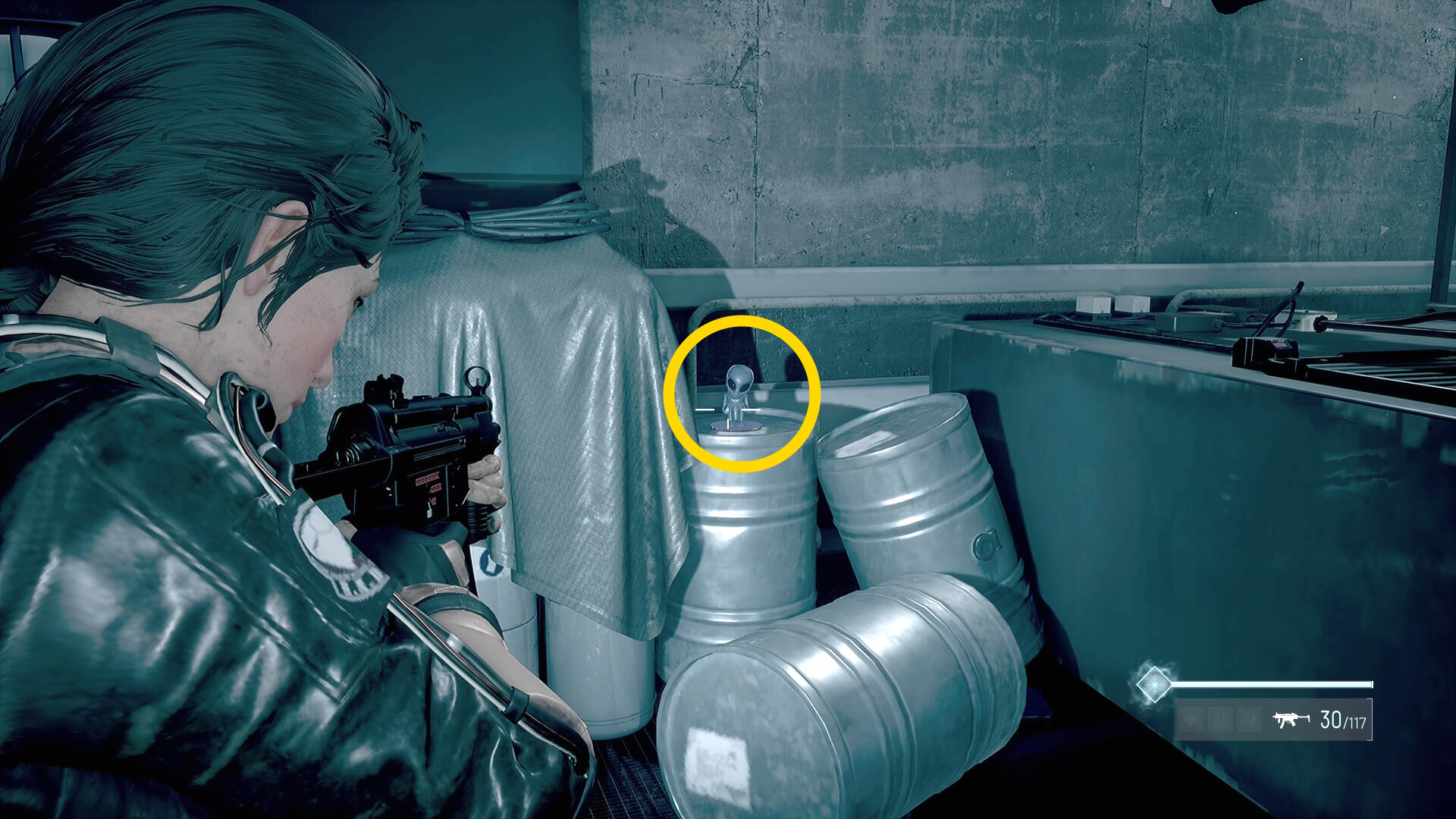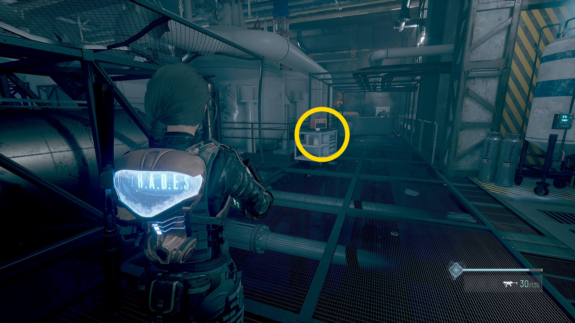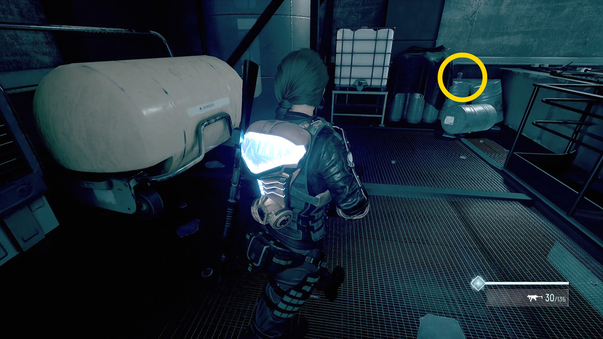 - シャッターの前を通過し、右奥のドラム缶の上に エボ(エイリアンの収集物:4/20)