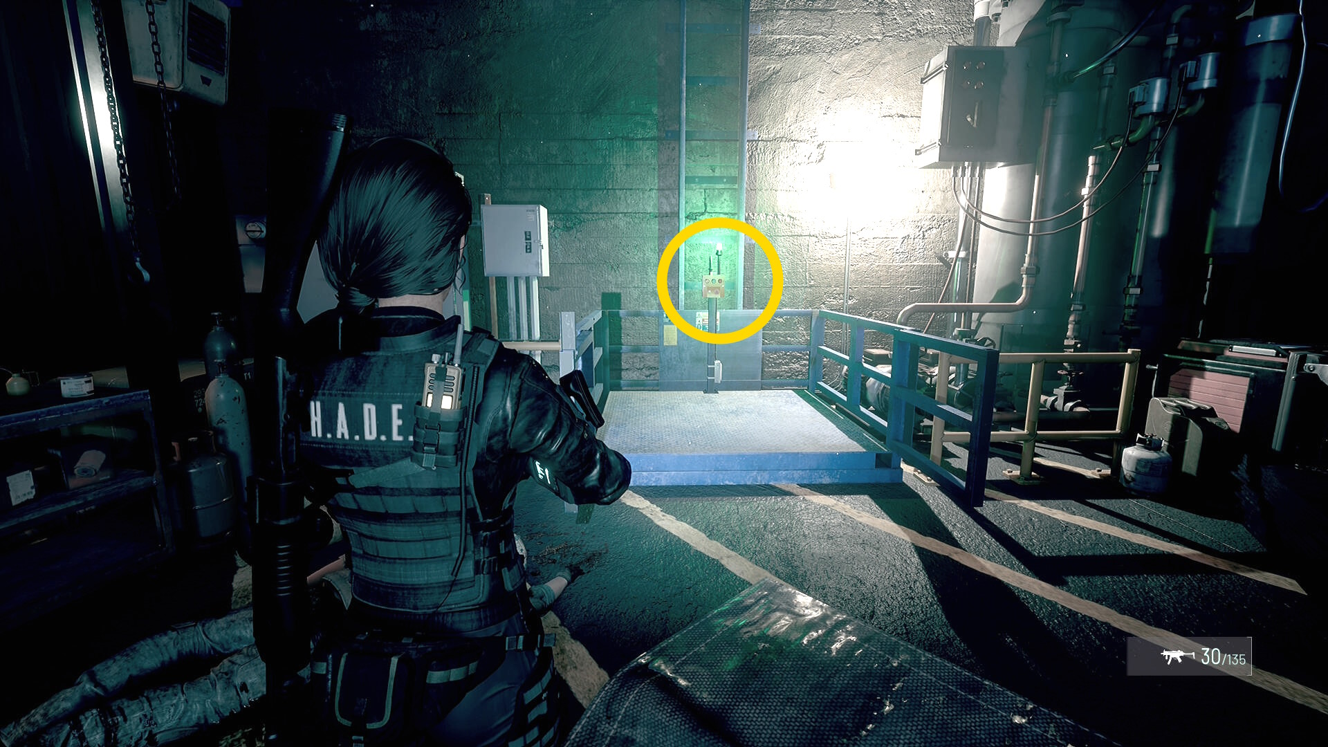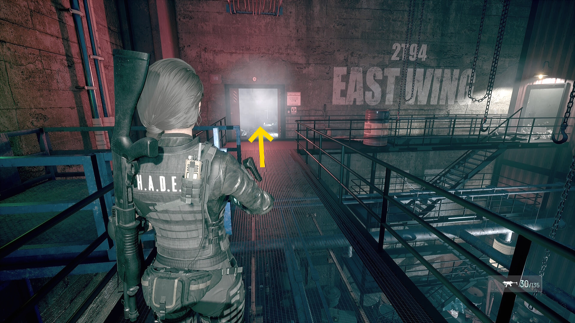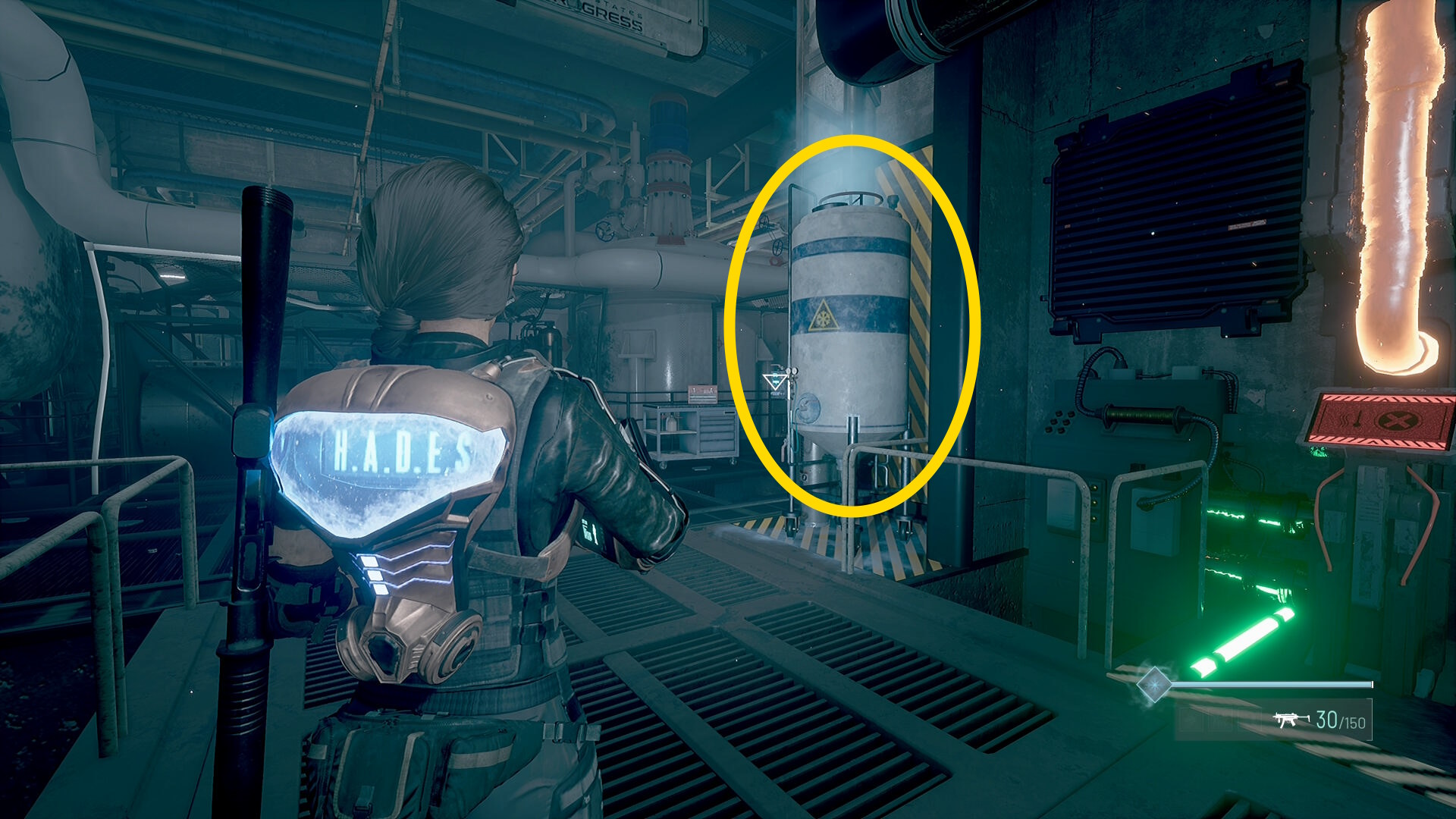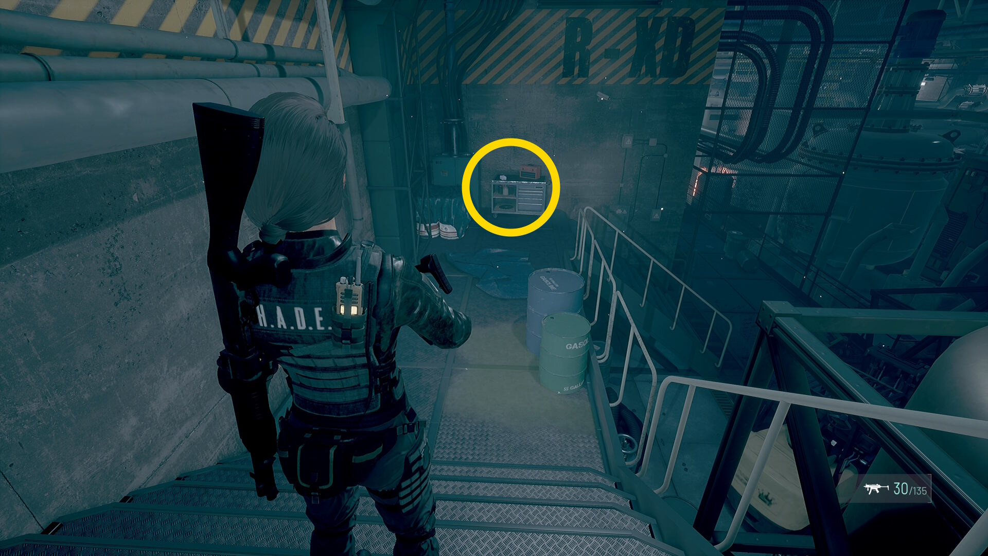 - シャッターの前を通過し、右奥のドラム缶の上に エボ(エイリアンの収集物:4/20)