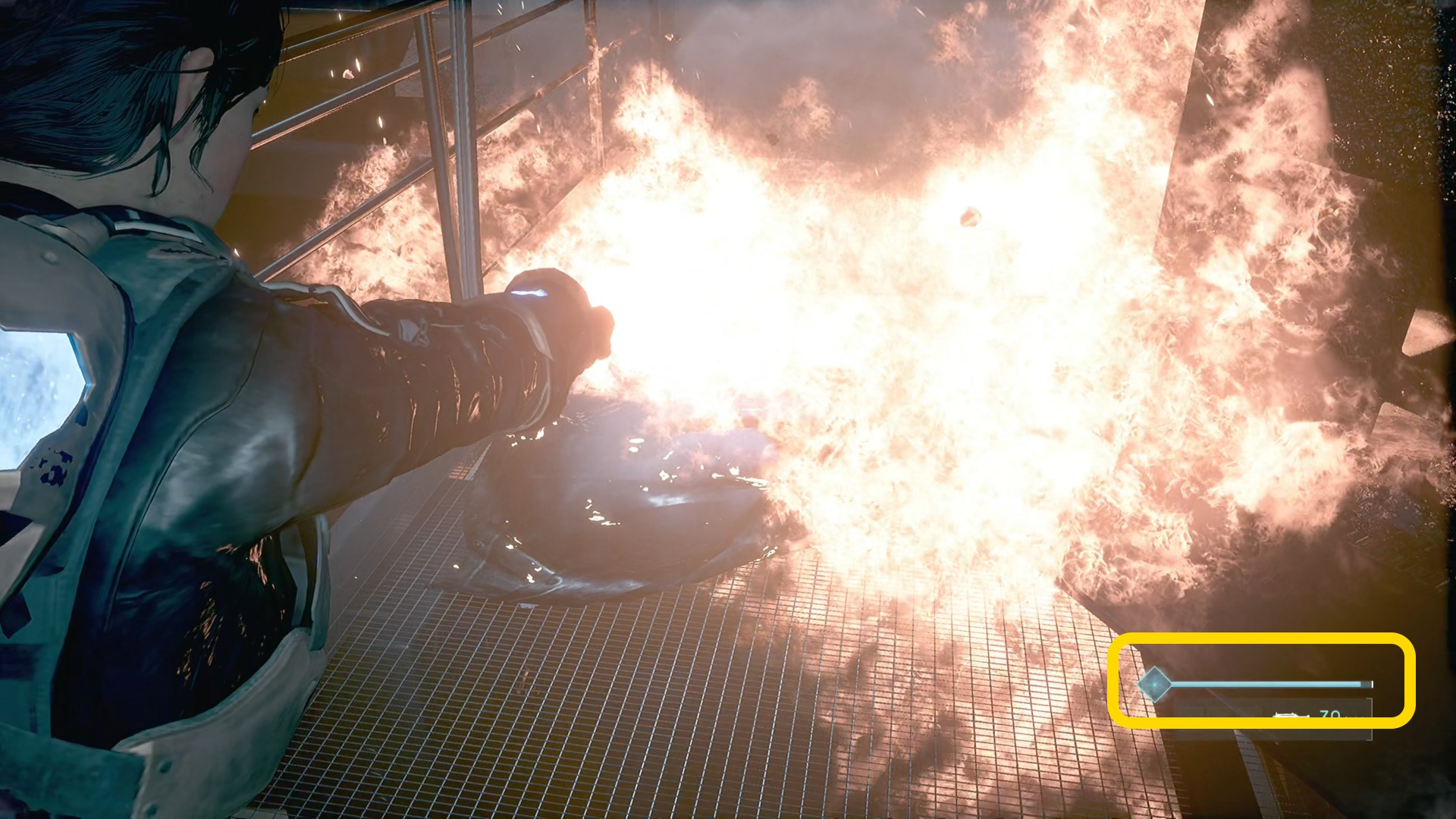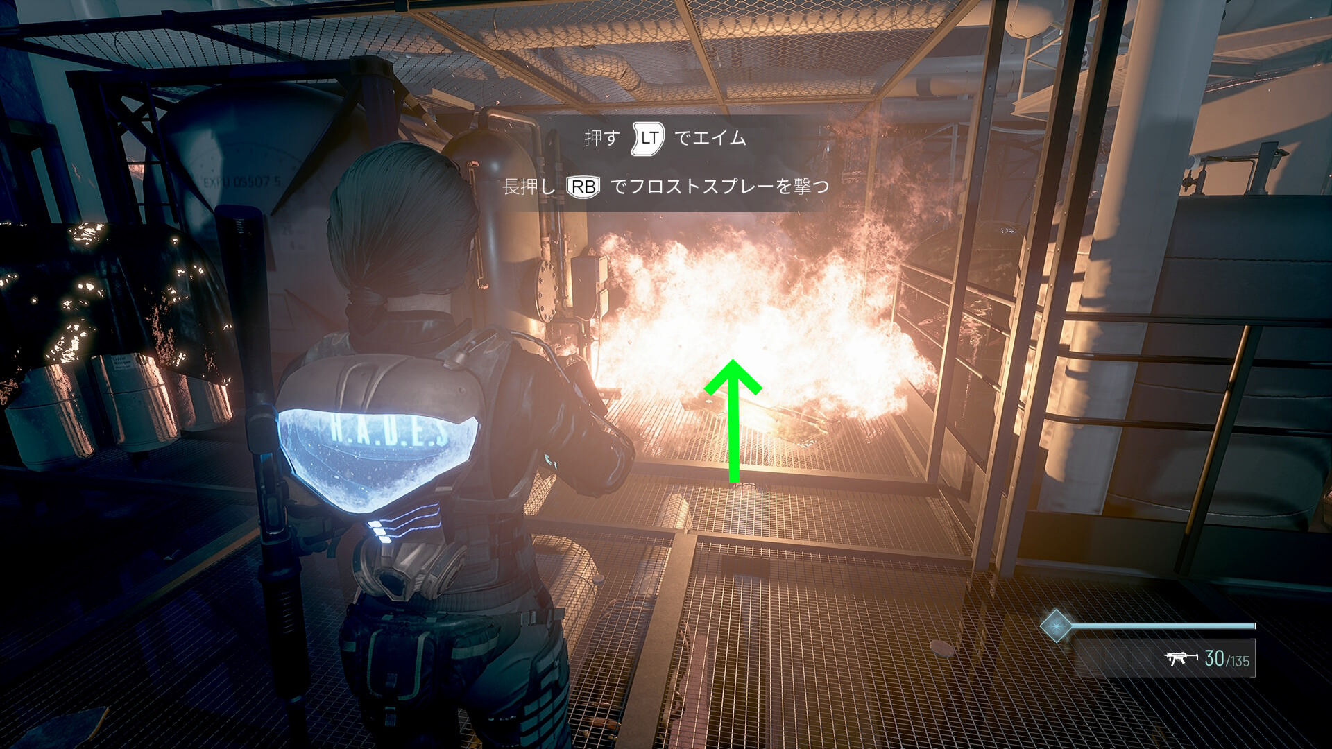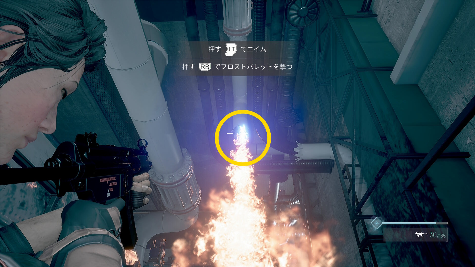 - 実績解除後、右の燃え盛る炎に向かってフロストスプレー( RB 長押し)で消火