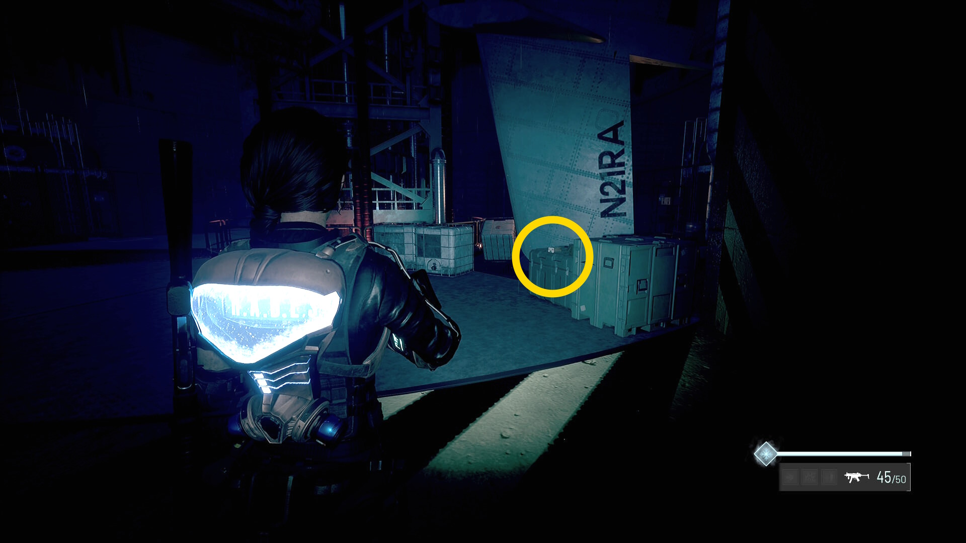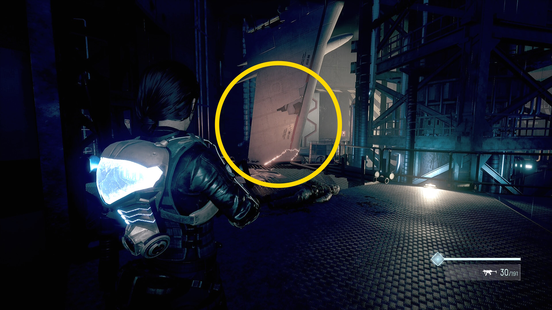 - カットシーン後、左前方奥に進むとスキャナーが反応 ⇒ 航空機の翼部(スキャナー:6/18)をスキャン