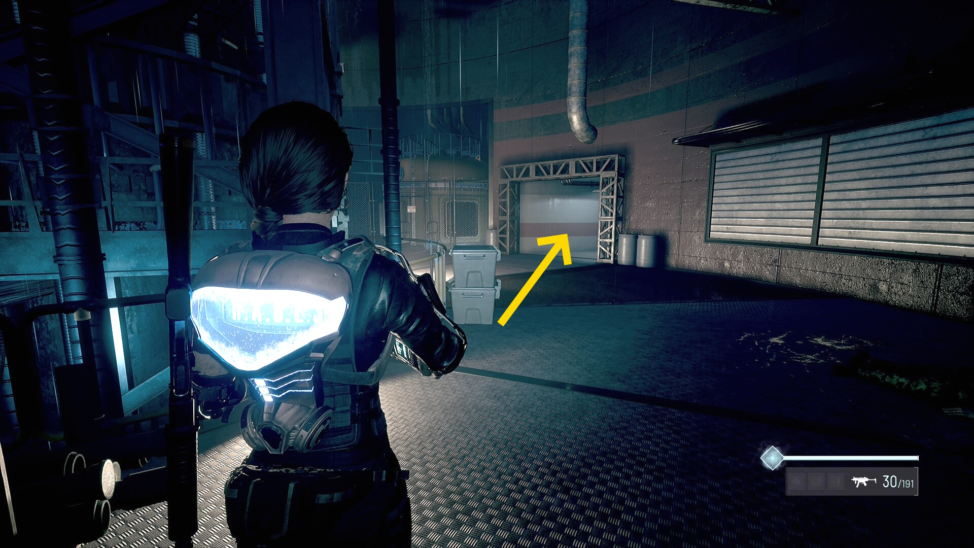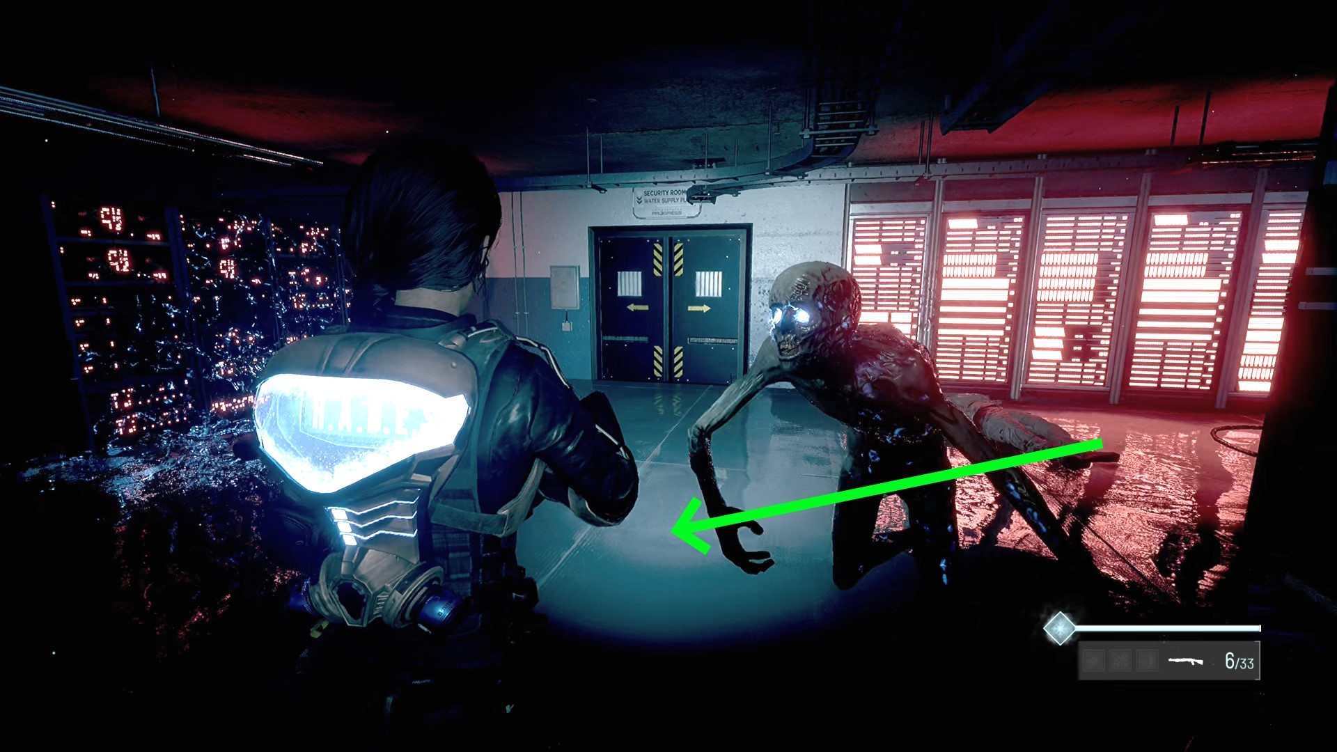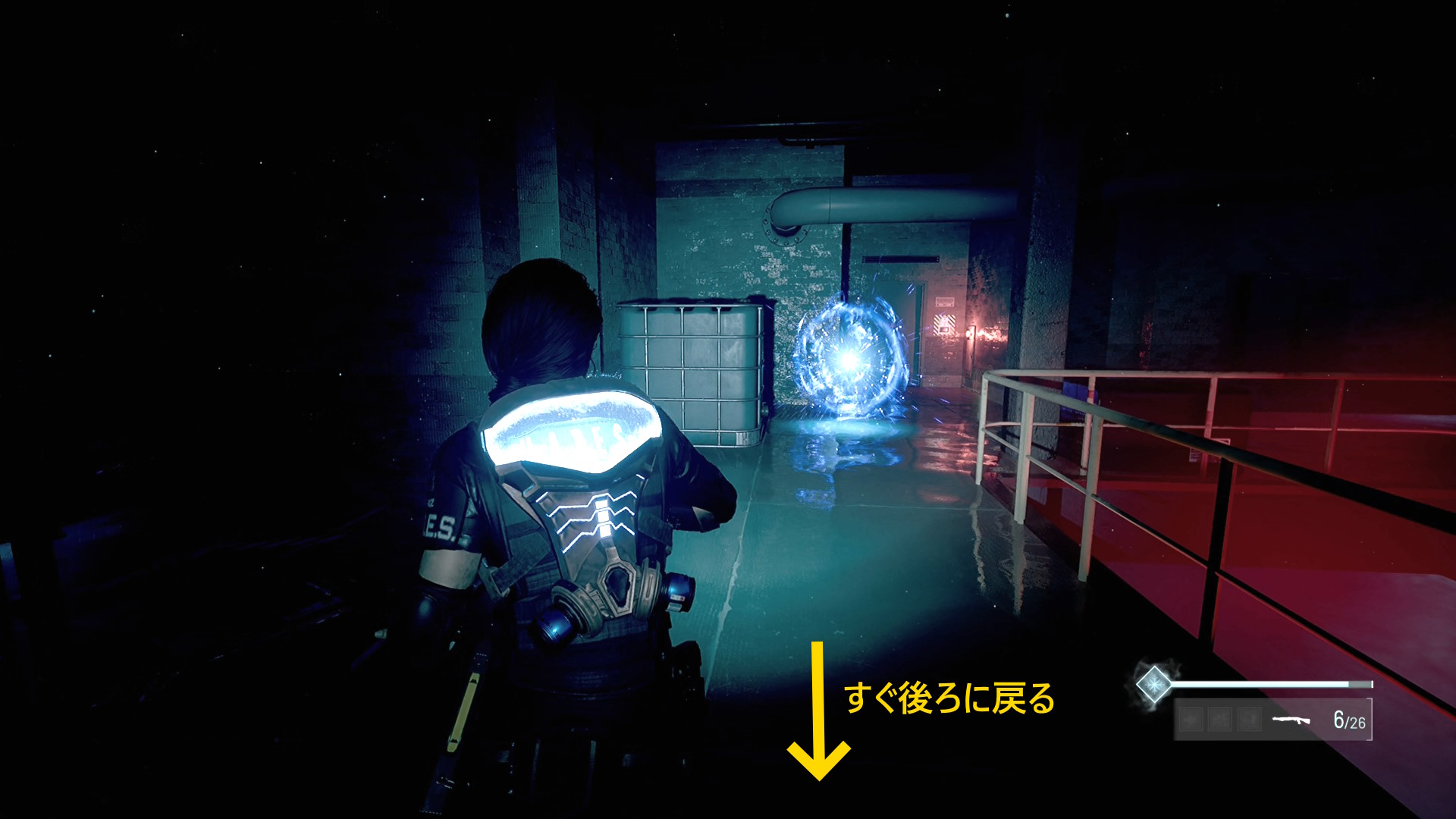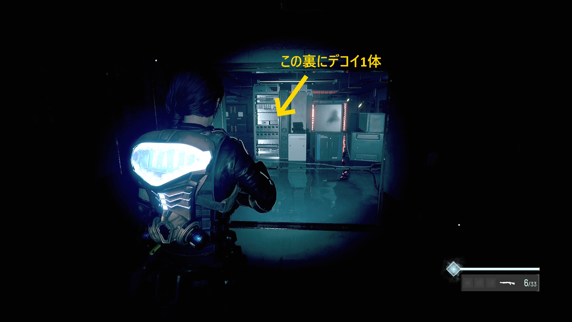 - コの字型の部屋を移動し突き当りのドアを開けるが、ドアを開けた右側面にデコイが隠れているので注意