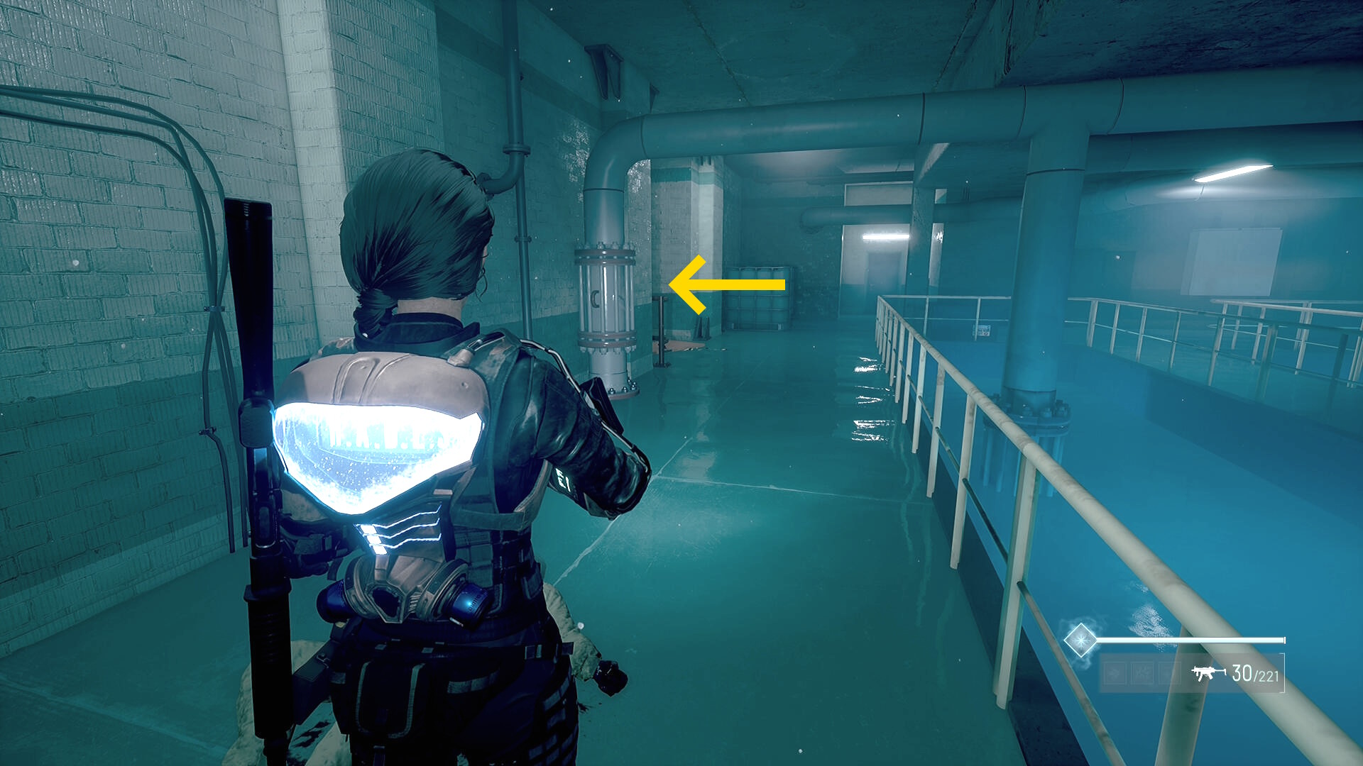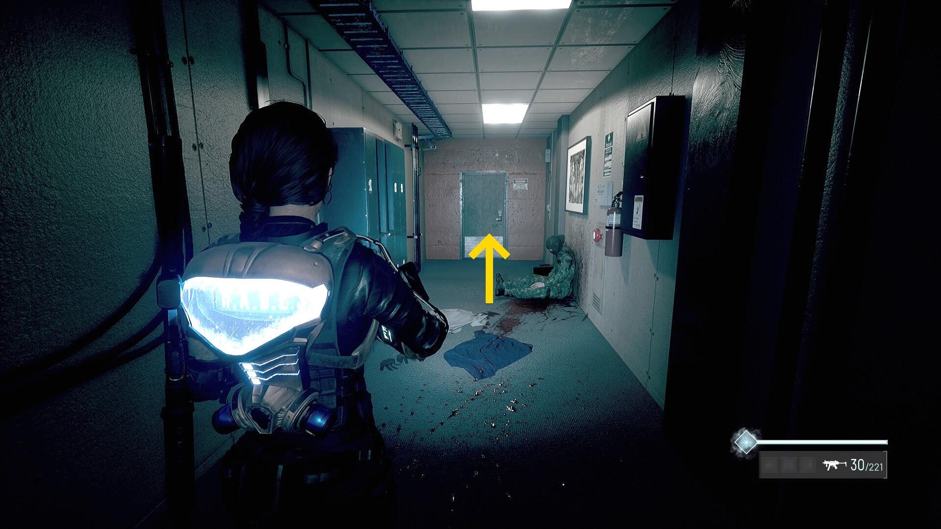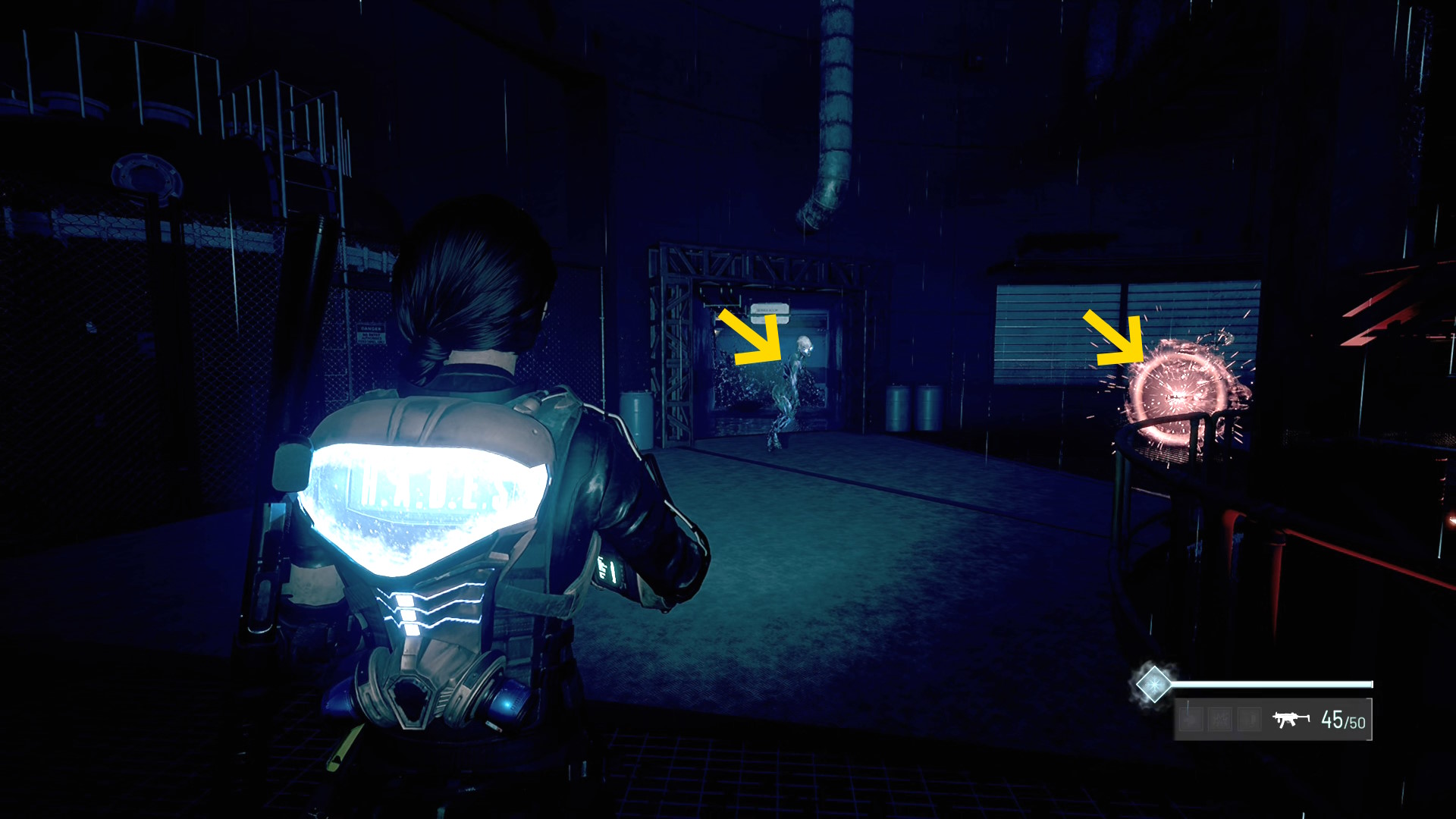 - コの字型の部屋を移動し突き当りのドアを開けるが、ドアを開けた右側面にデコイが隠れているので注意
