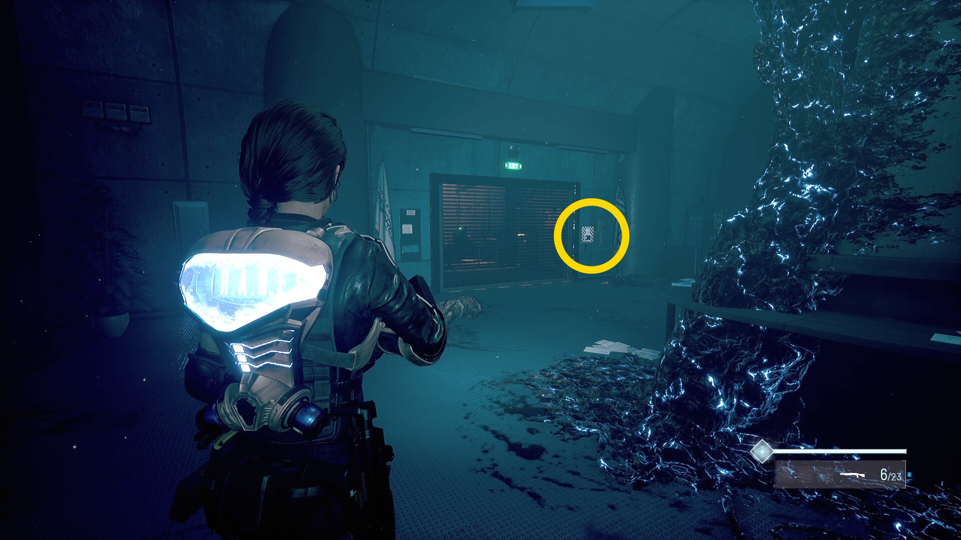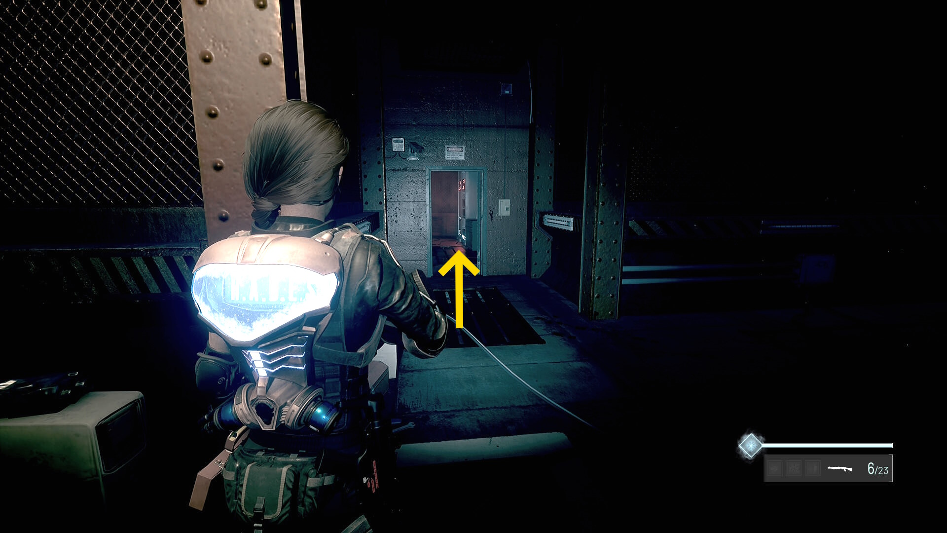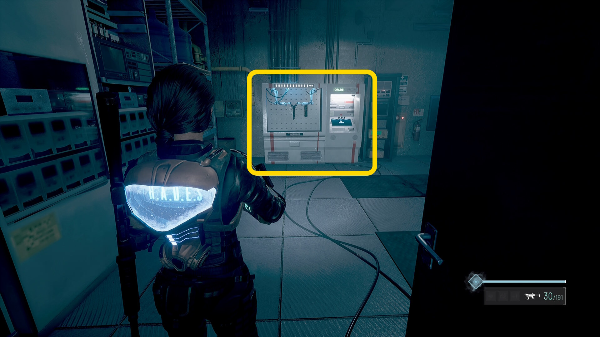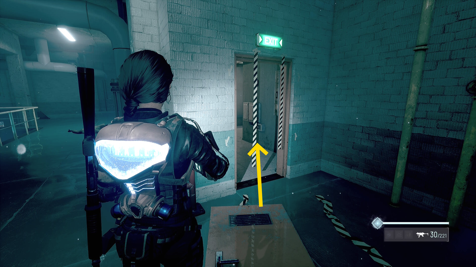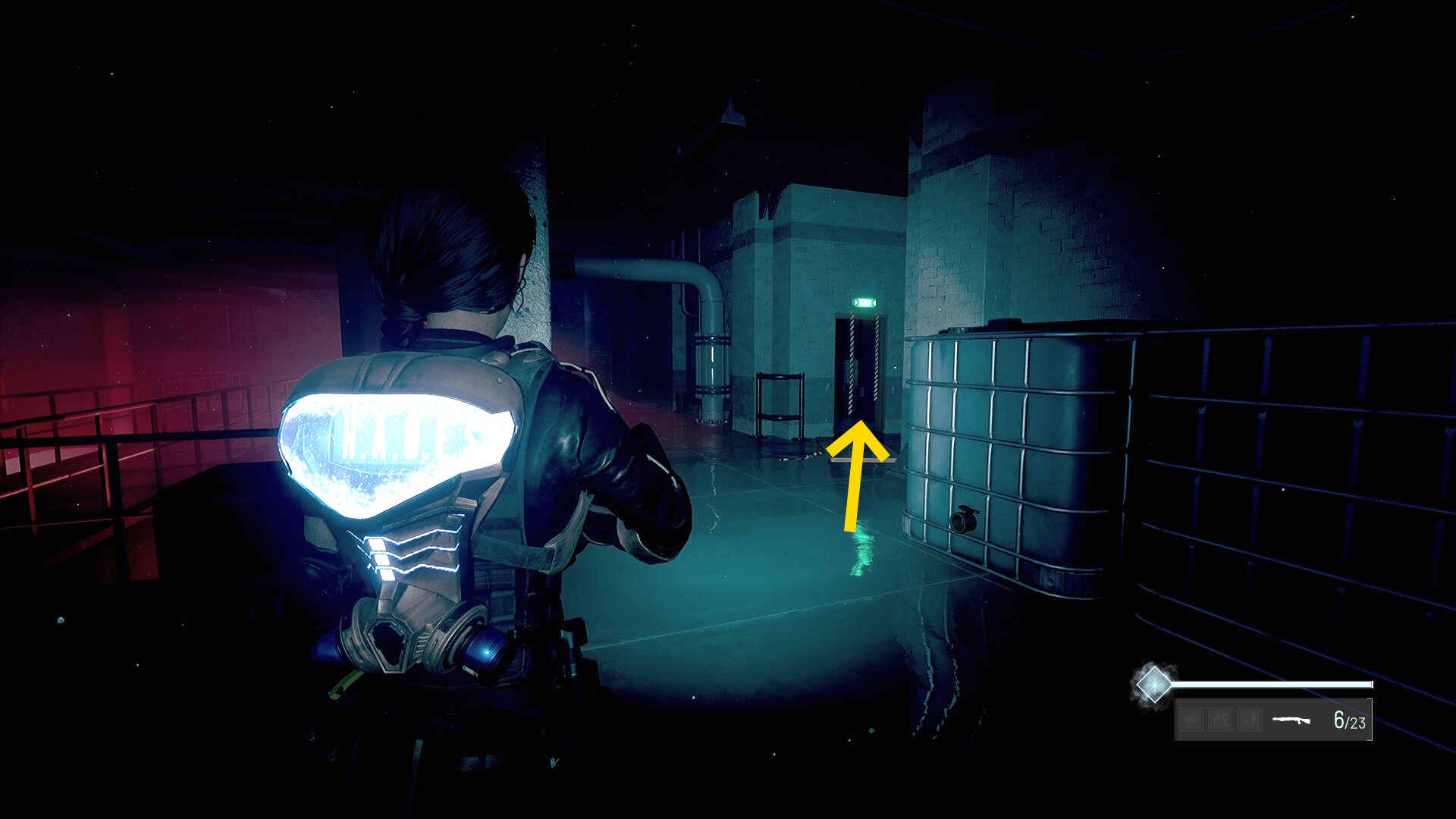 - 左に進み、エレベータードアのパネルに緊急解除キーを使う