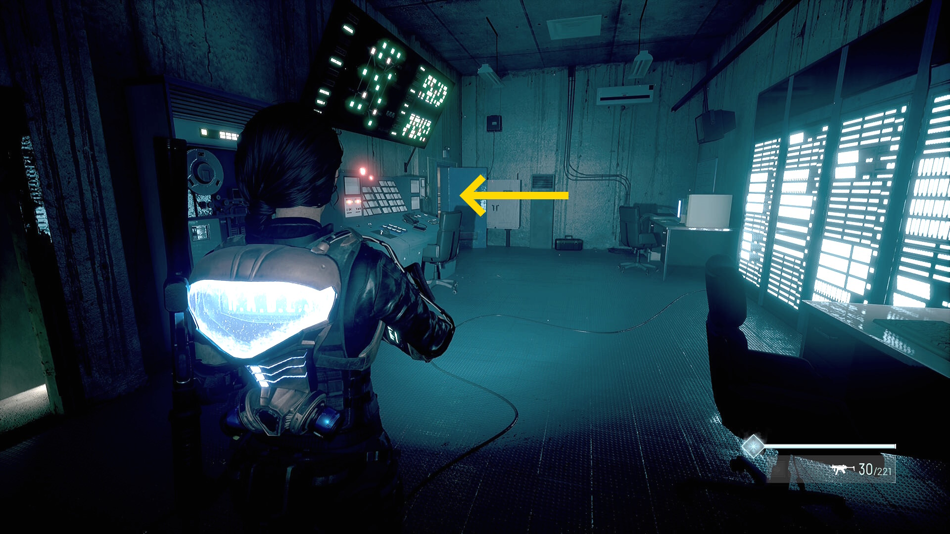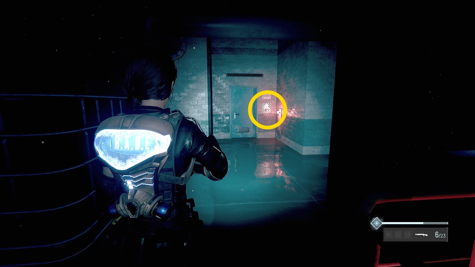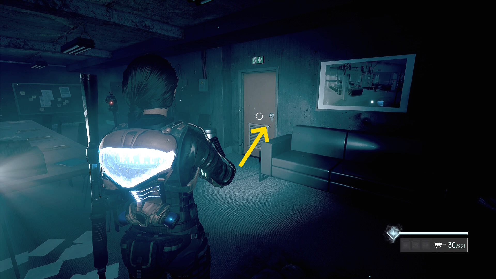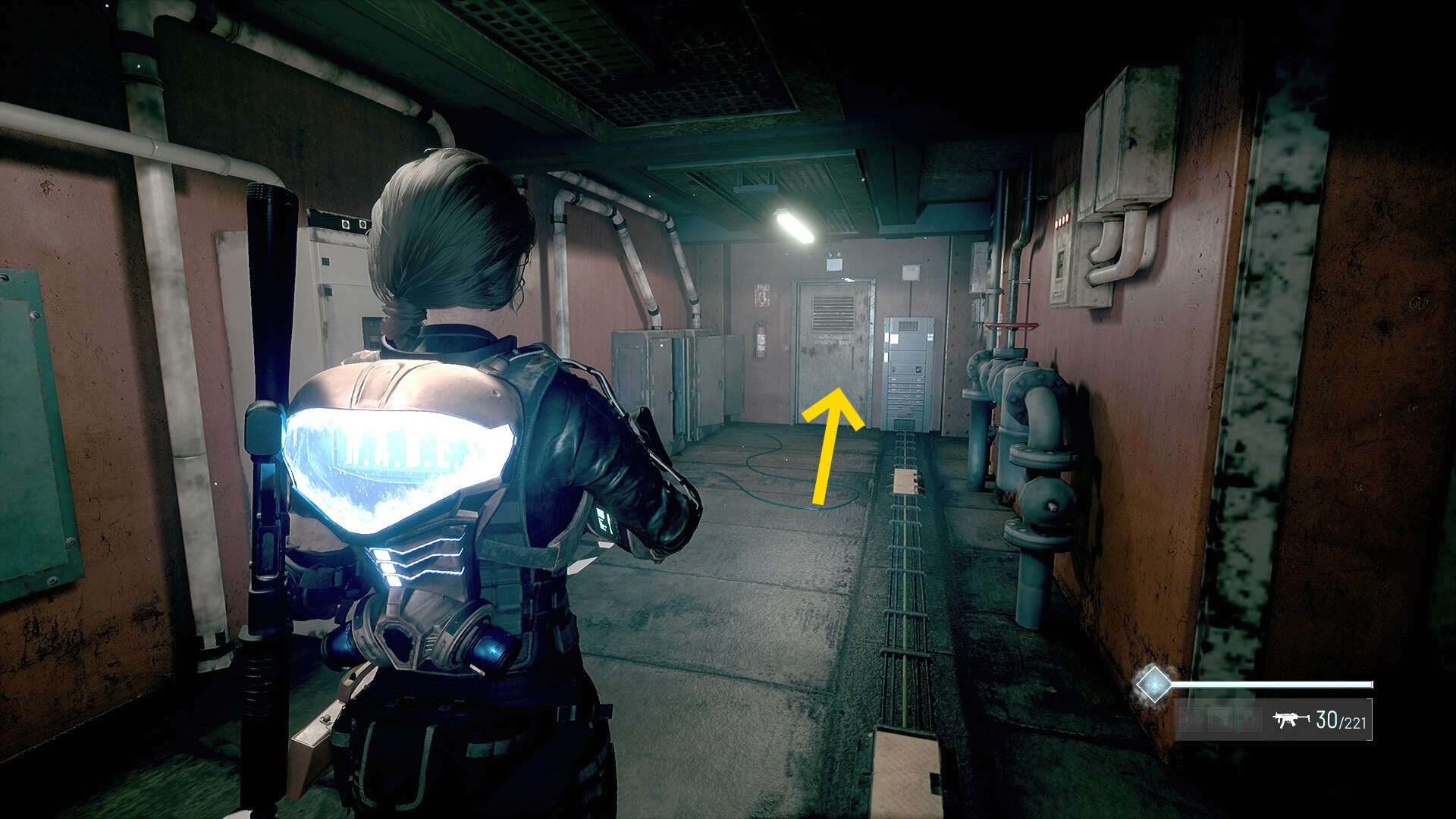 - 左に進み、エレベータードアのパネルに緊急解除キーを使う