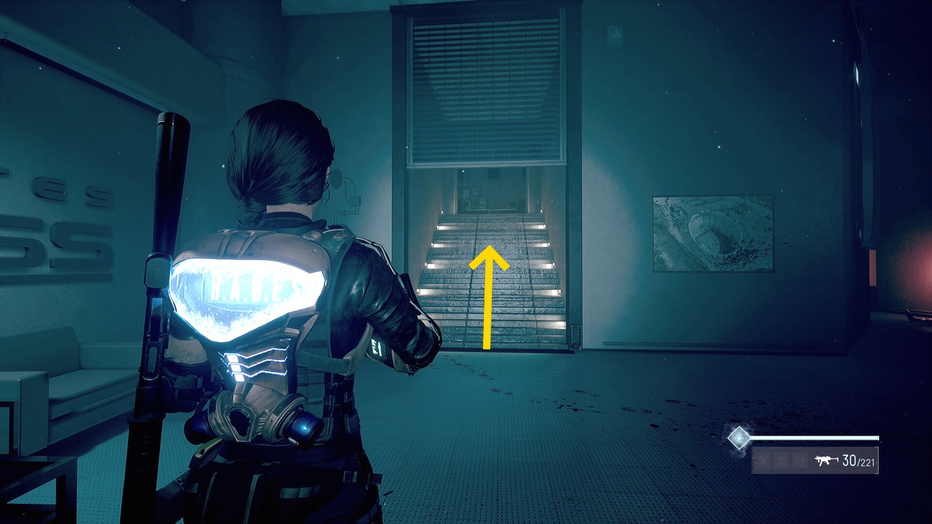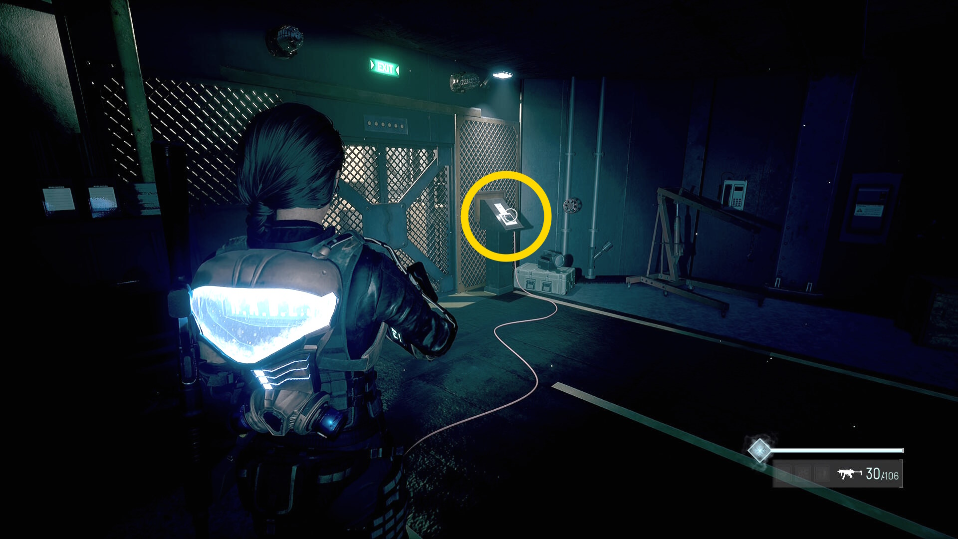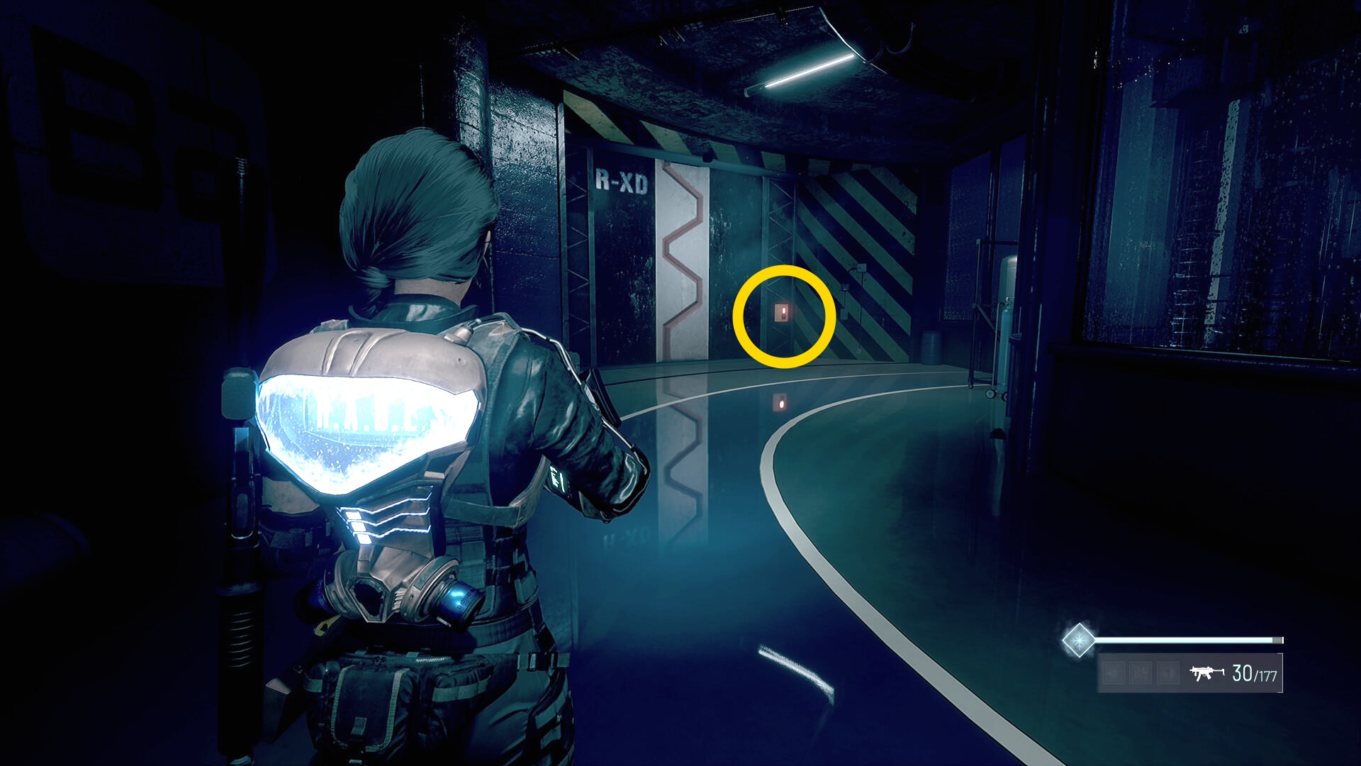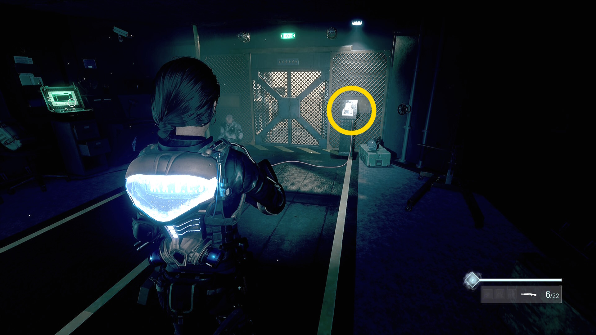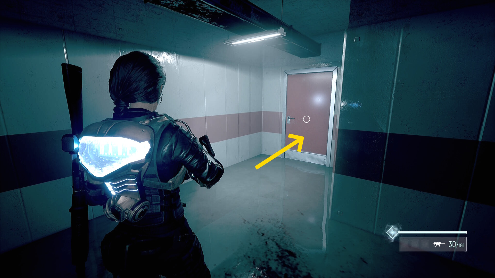 - 左に進み、エレベータードアのパネルに緊急解除キーを使う